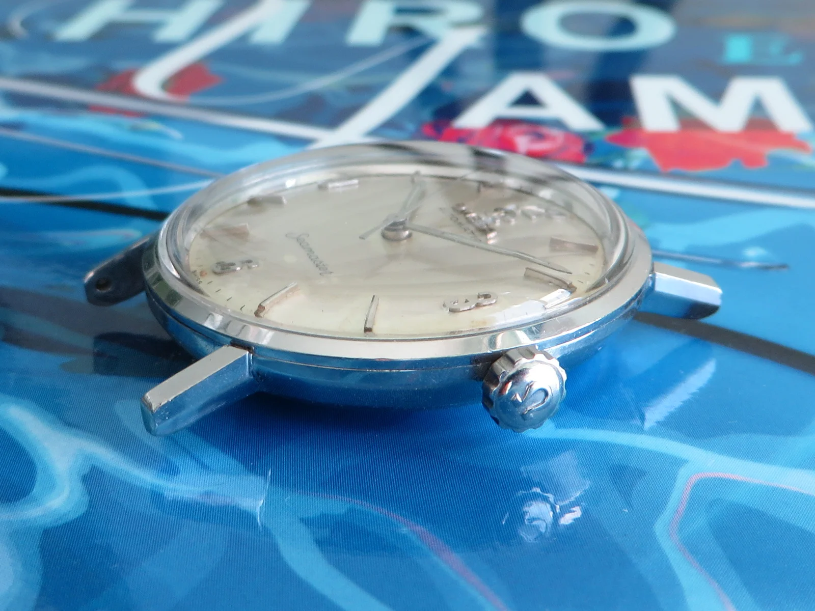Sharp stainless steel case showing typical signs of use, with signed crown and signed crystal.