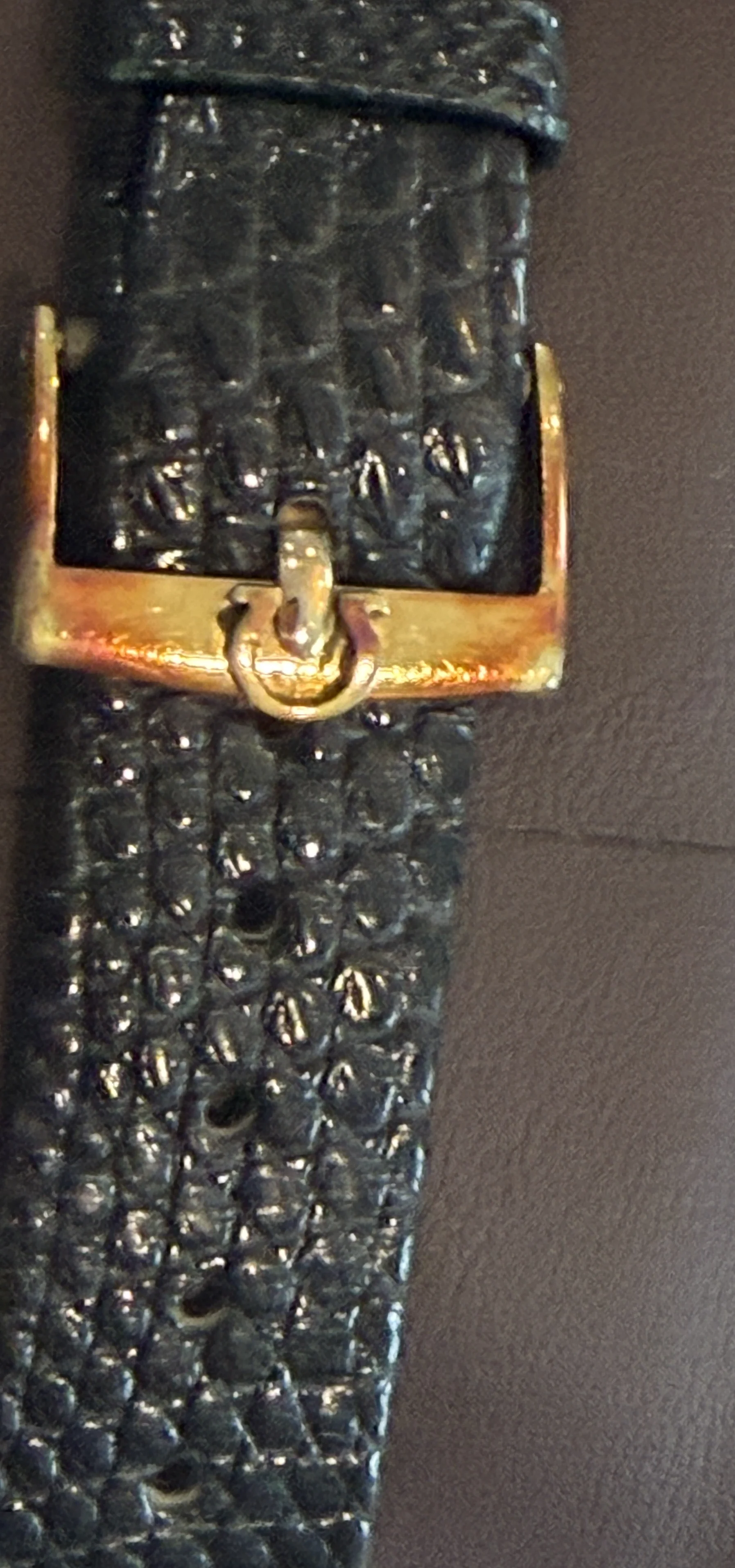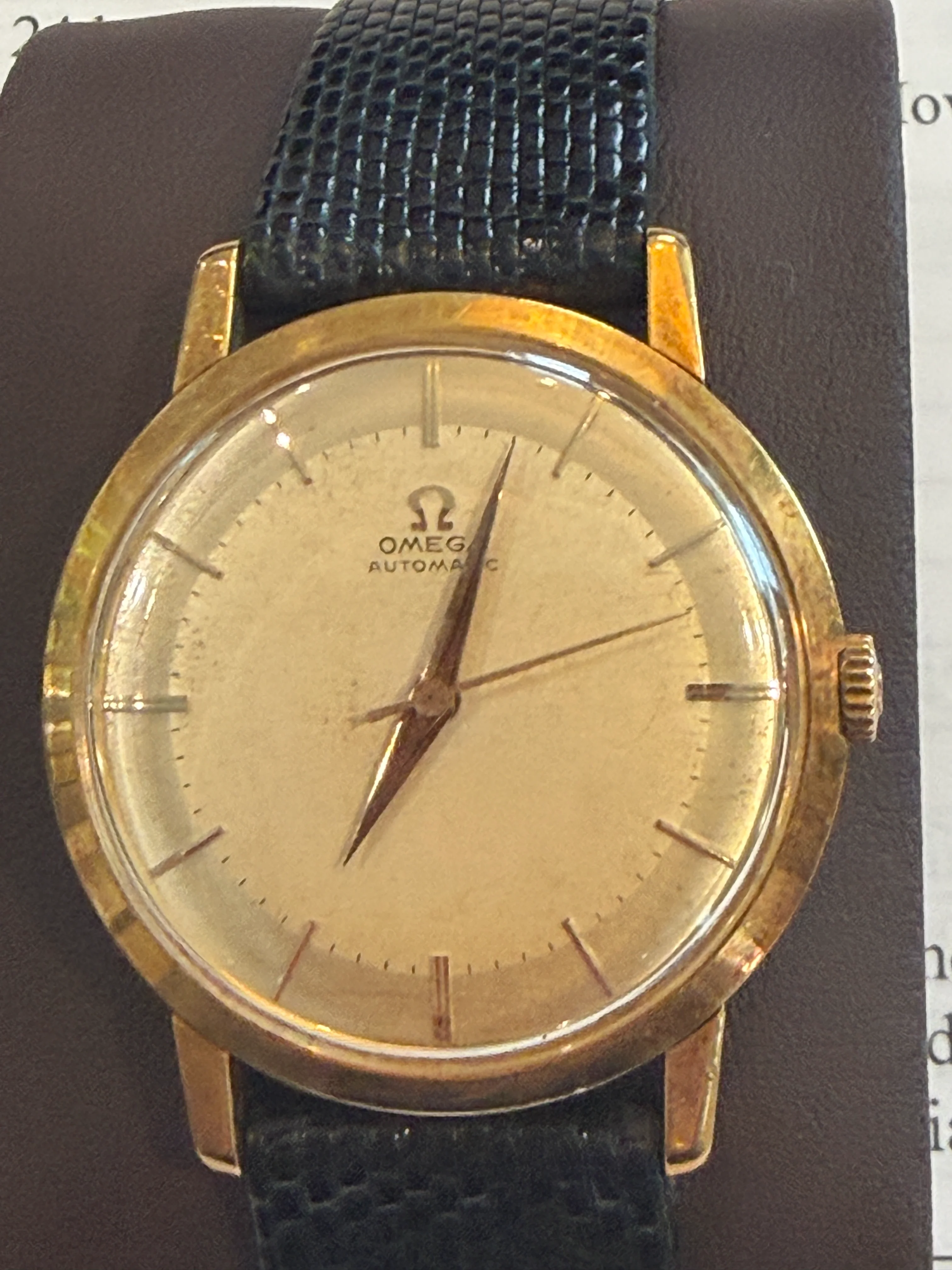 ·Hi, I'm trying to identify this Omega wristwatch. I can't open the back to access the serial number and check what the watch case is. I suspect it's gold plated or gold filled based on the clasp's apparent tarnish. This watch has batons for hour and minute marks, with the batons hitting the minute mark at the interior end of each one. Nothing fancy about it at all. I have looked at so many Omega watches and my eyes can't take any more! Any help is appreciated. Thanks, Mo