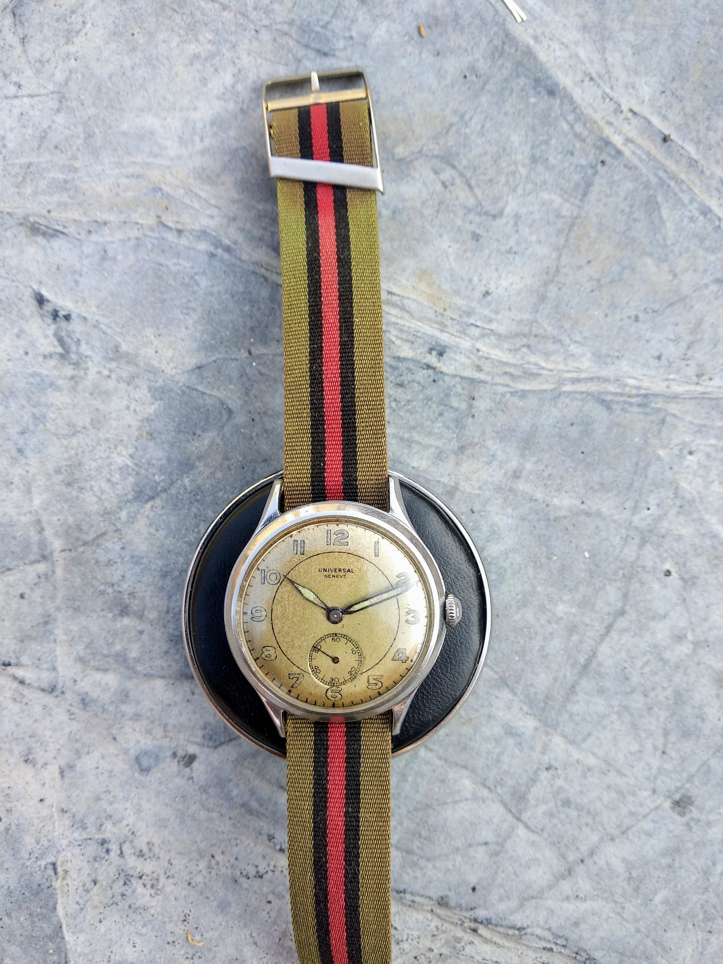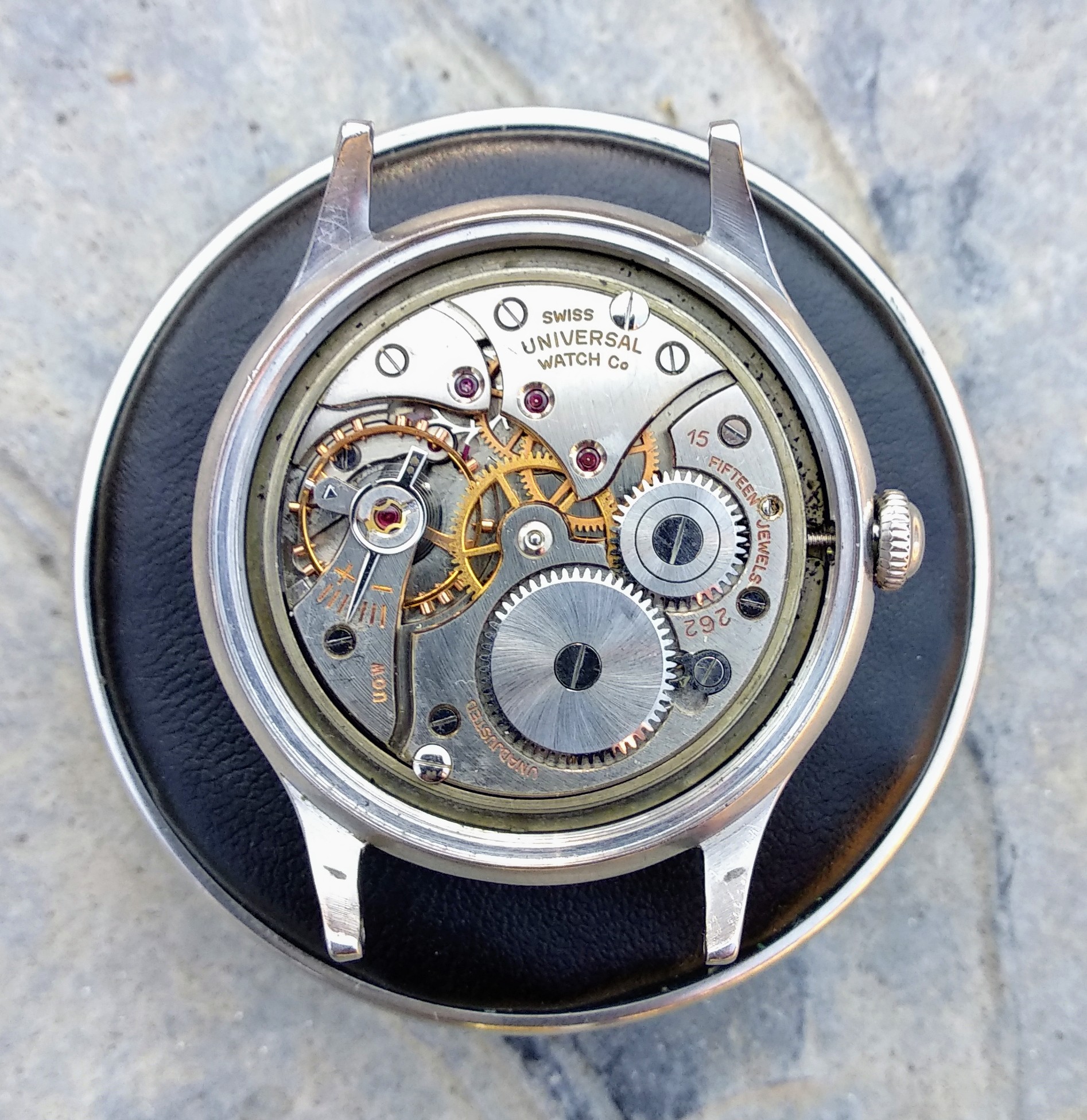 ·I recently got my first two UGs, a couple of 1940s three-handers. One of them is a cal 262 with a working movement, nice oversize case, and even a well preserved fabric strap.