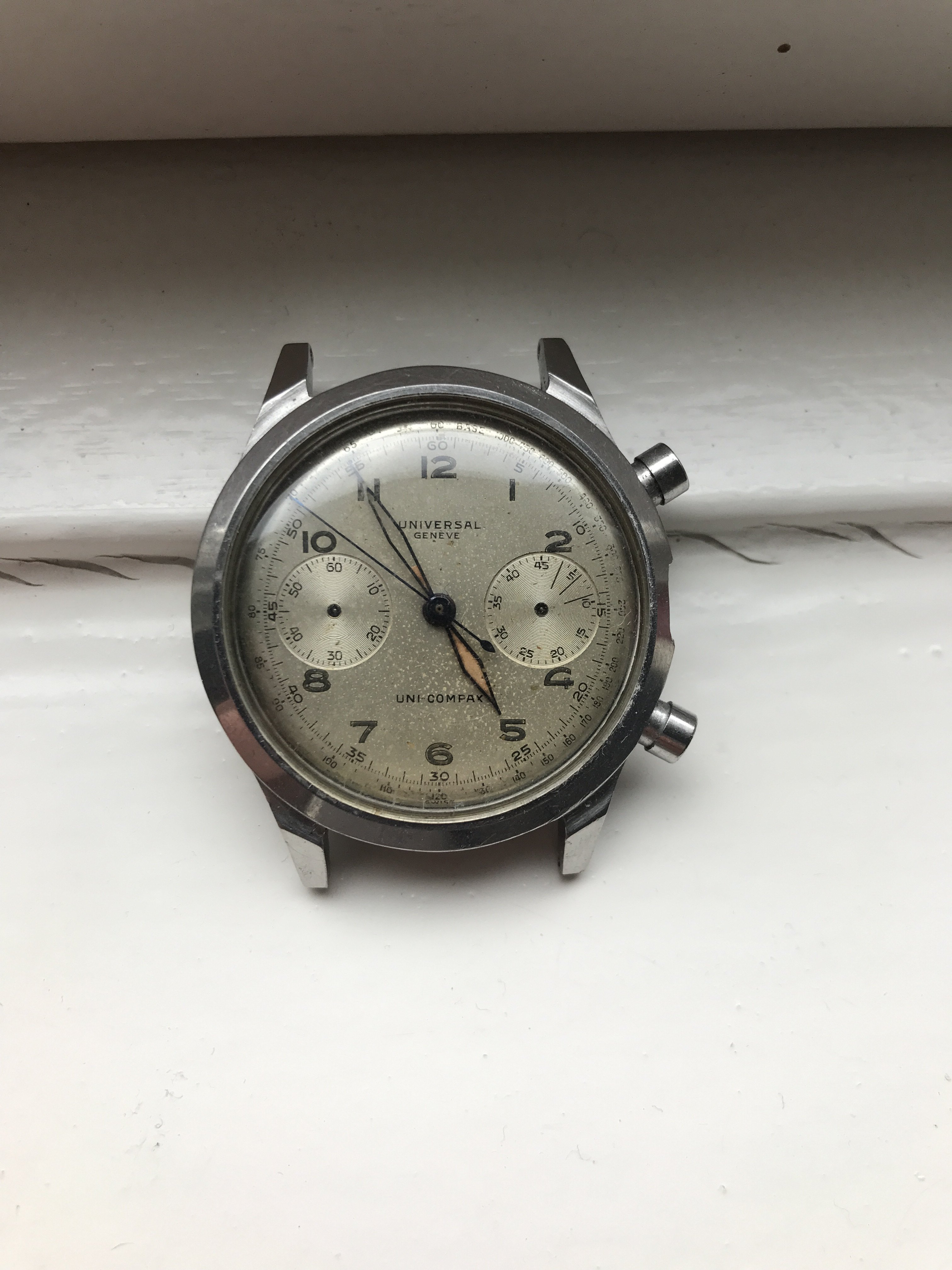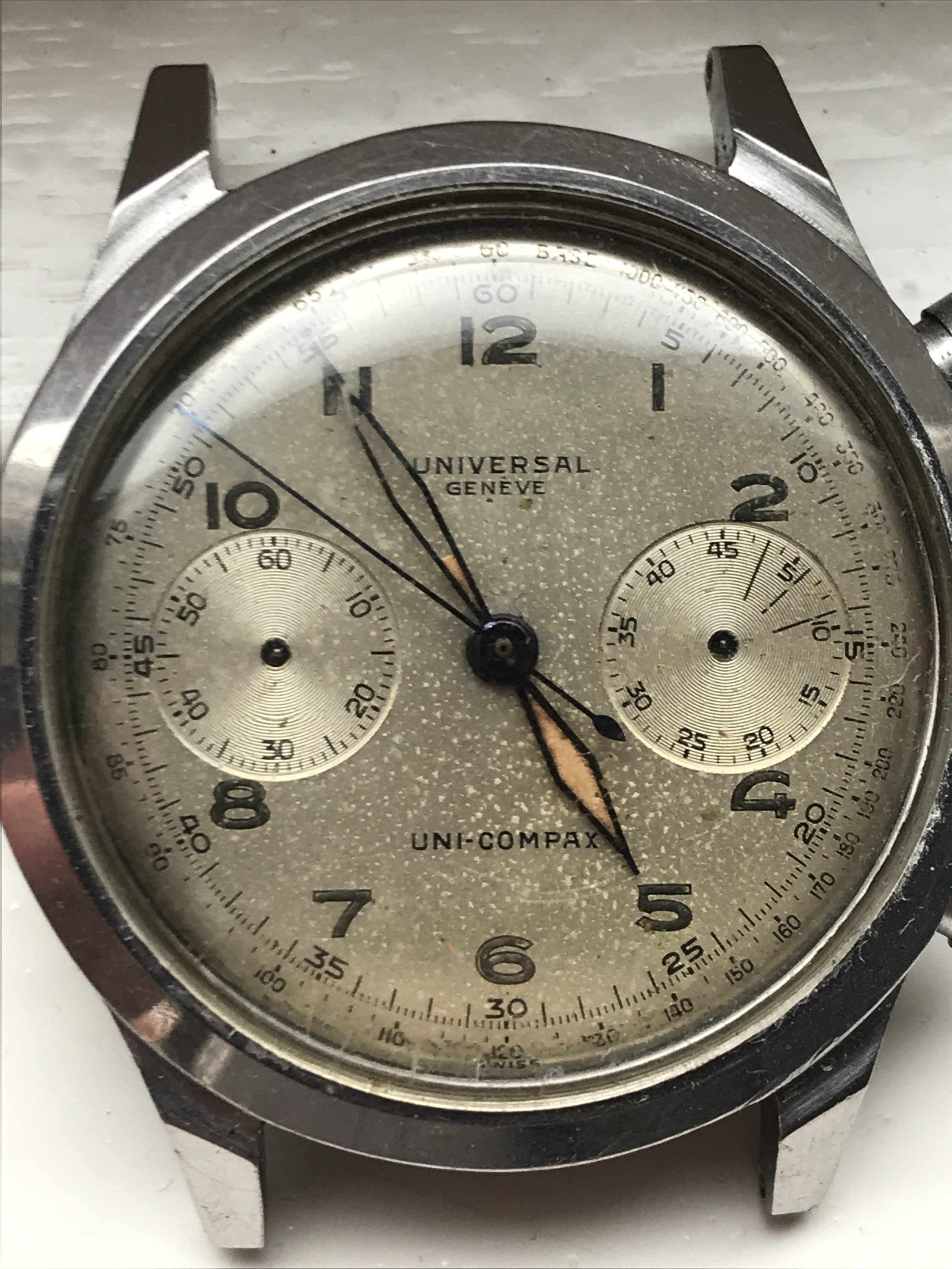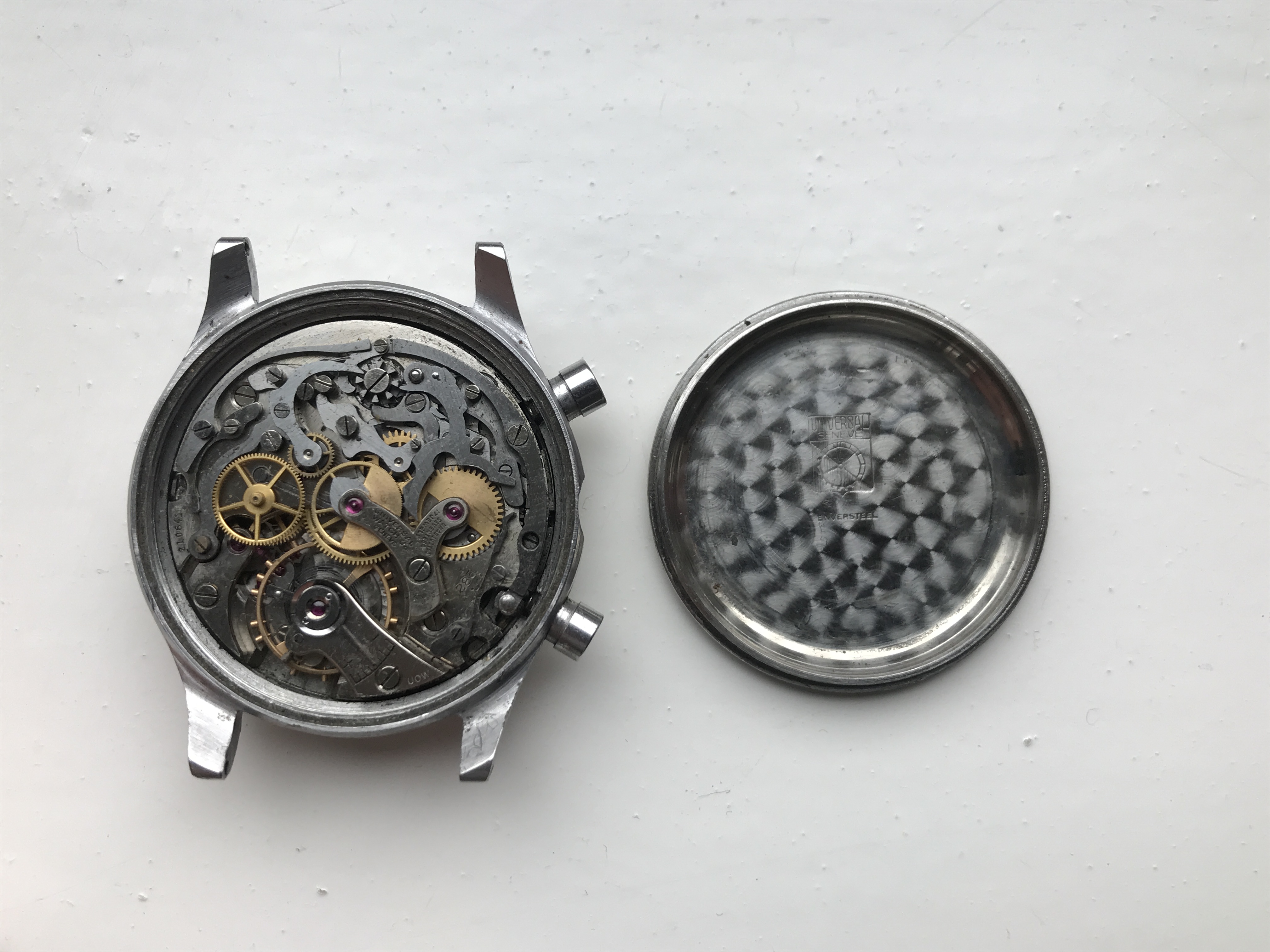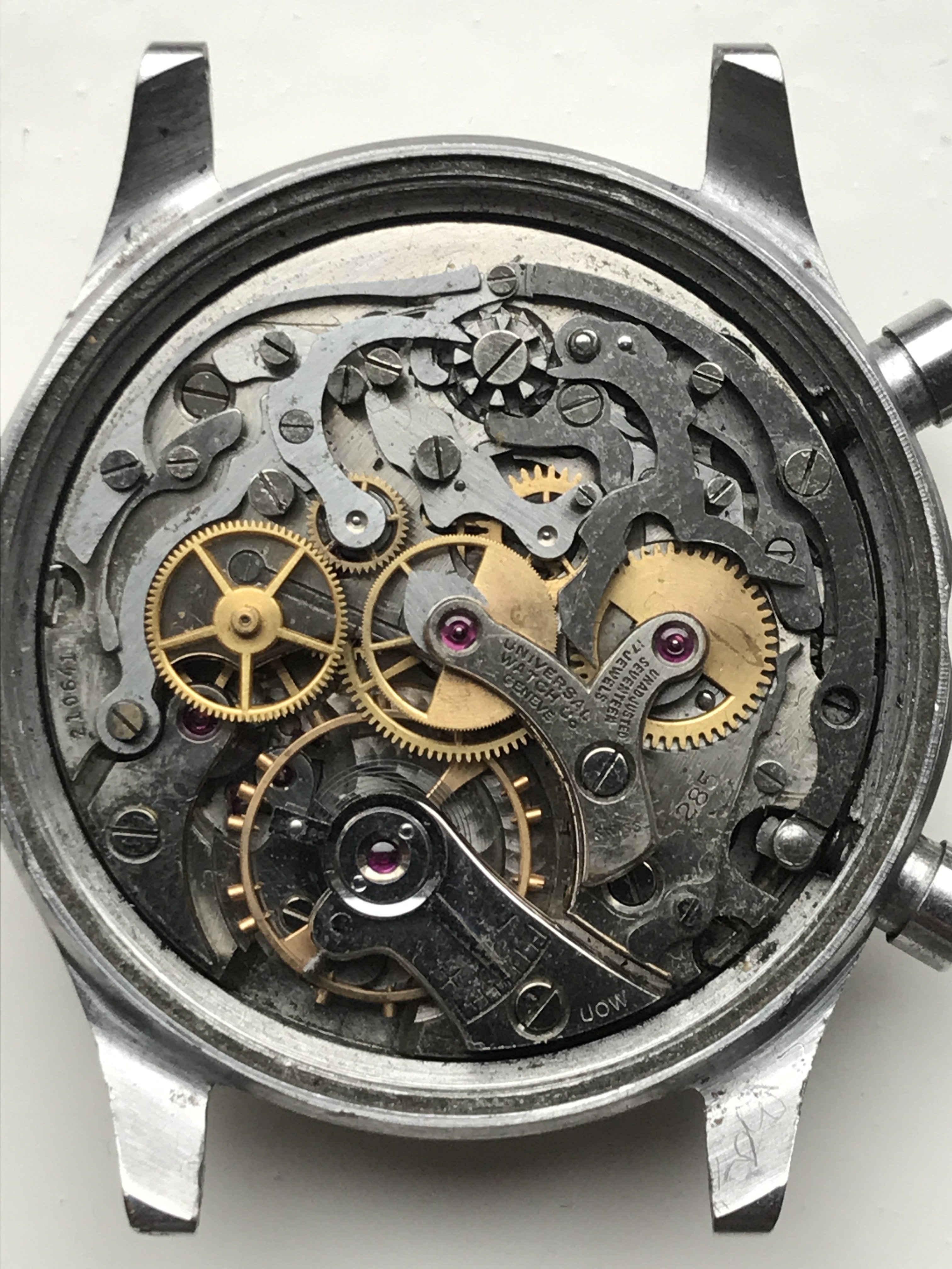 Movement: correct UG 285 (matching numbers). Given the watch misses its crown I can't check whether the movement runs at all but I suggest you consider it in need of a (serious) service