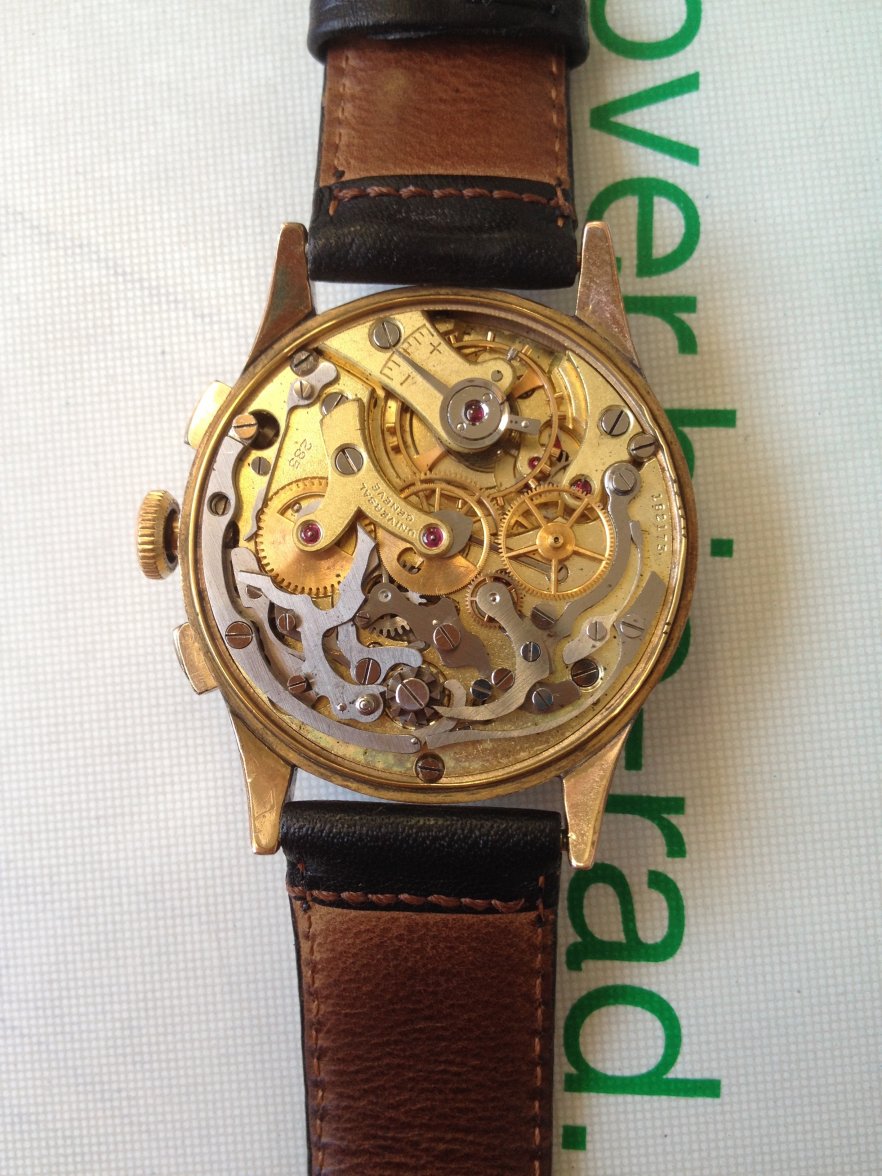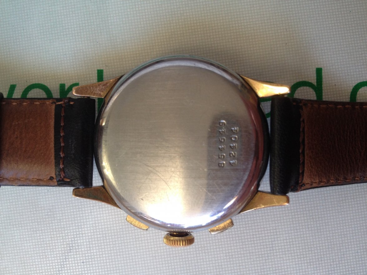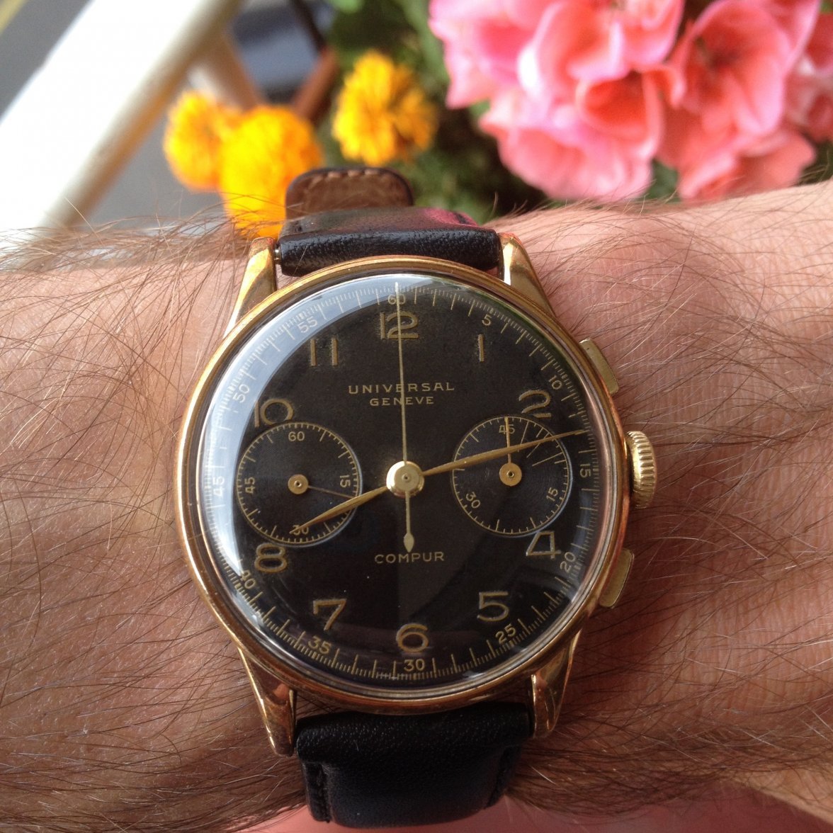 I have for sale a seldom seen Universal Geneve Black Dial Compur, reference 42404 with a serial number 854 649 dating it to 1941-1942. The case is gold plated, no chips or flaking although some wear on the lugs (see side pictures and to be expected for a 75-year-old watch).