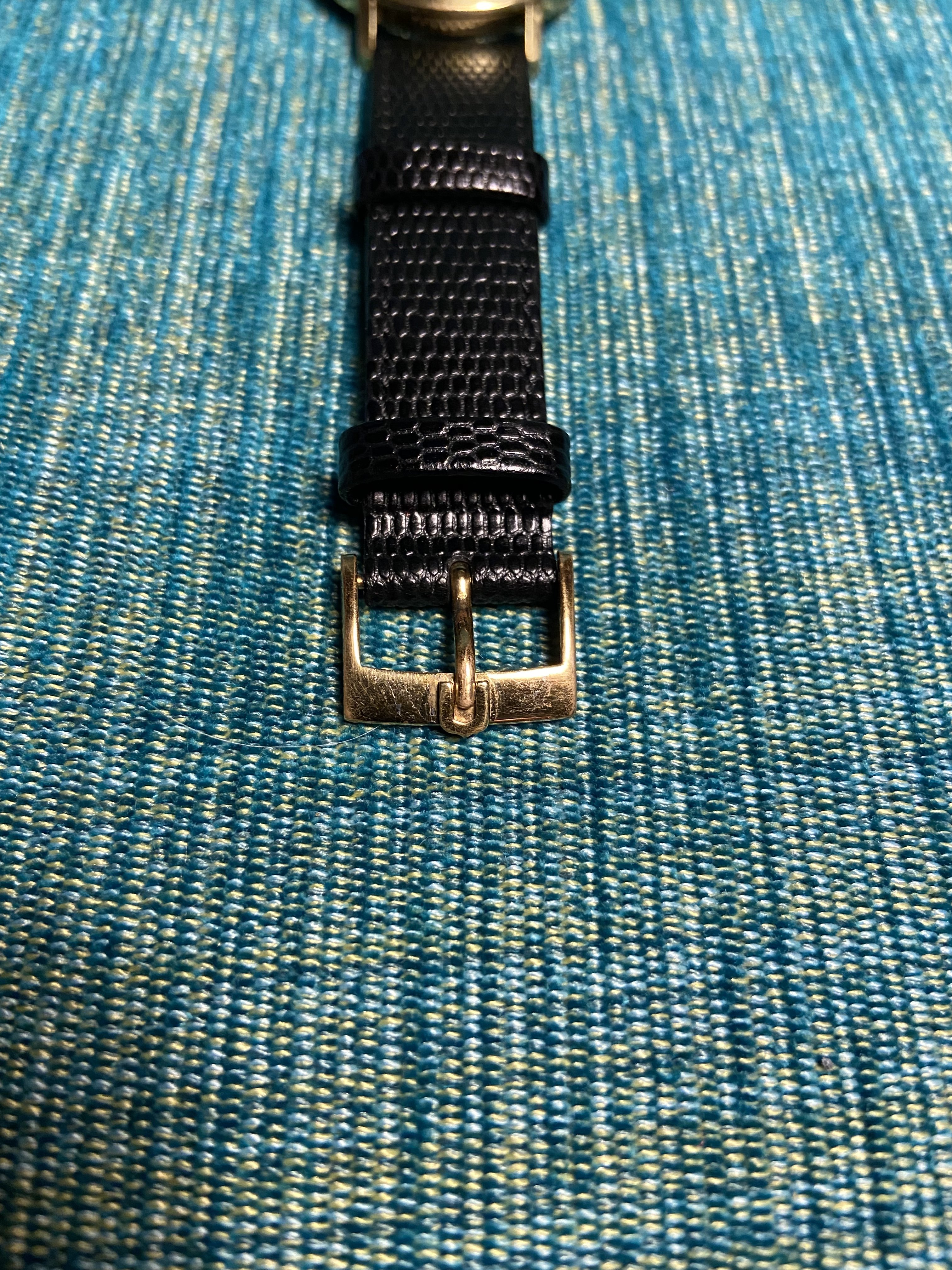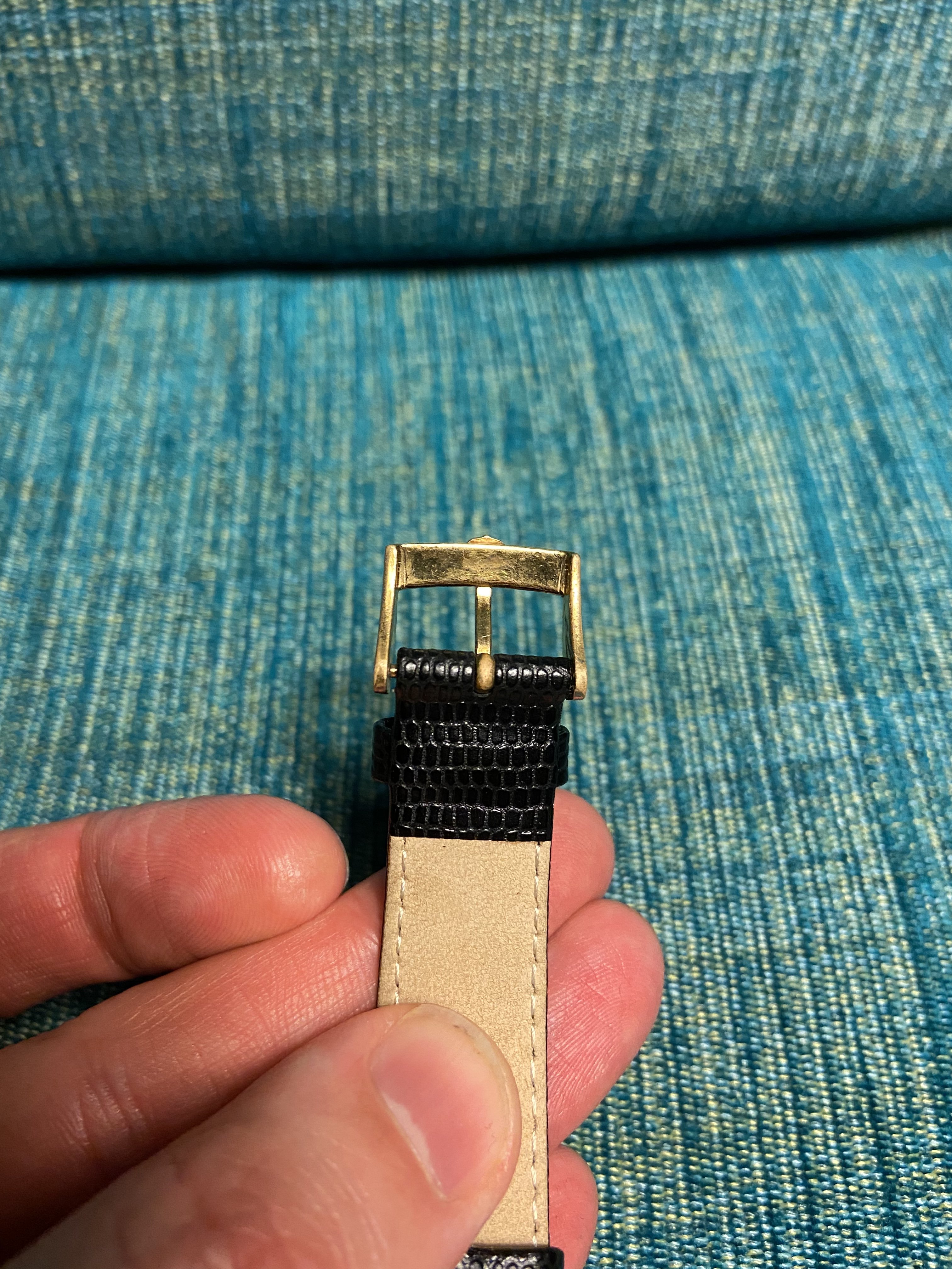 It looks like the logo is genuine, from a type 1 14mm buckle (1950s), but it has been put onto some aftermarket 16mm buckle and heavily polished to try to disguise it...