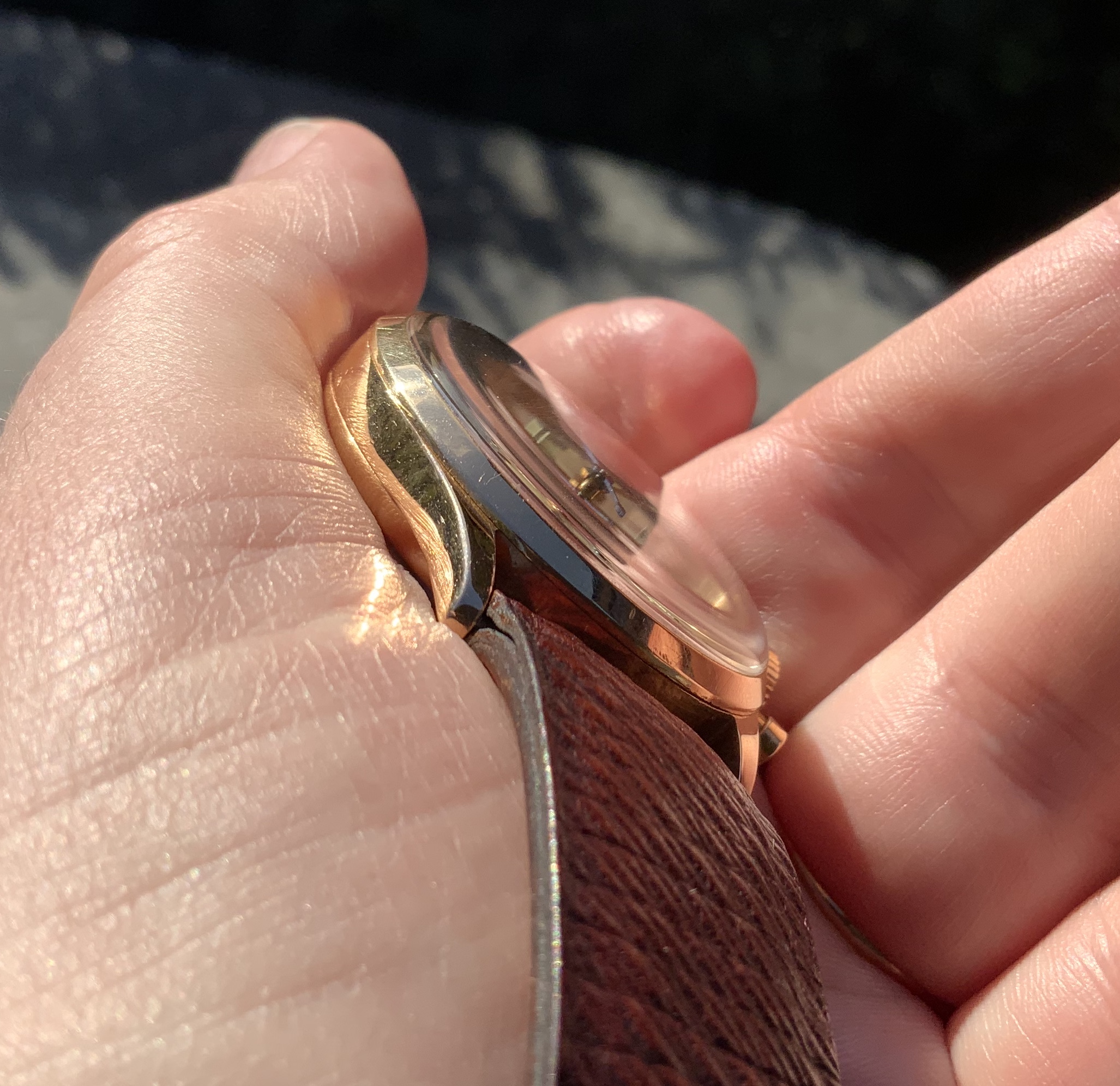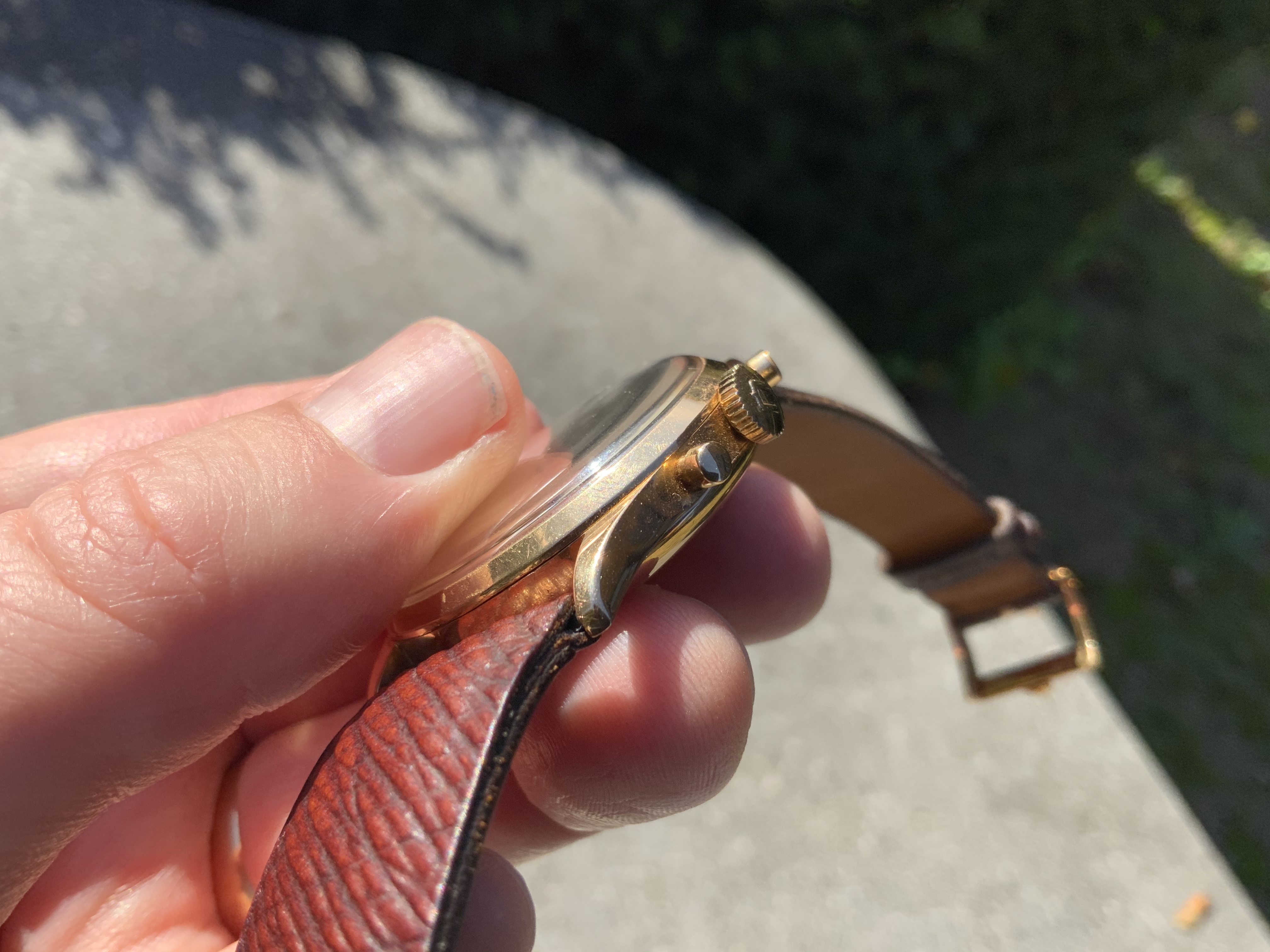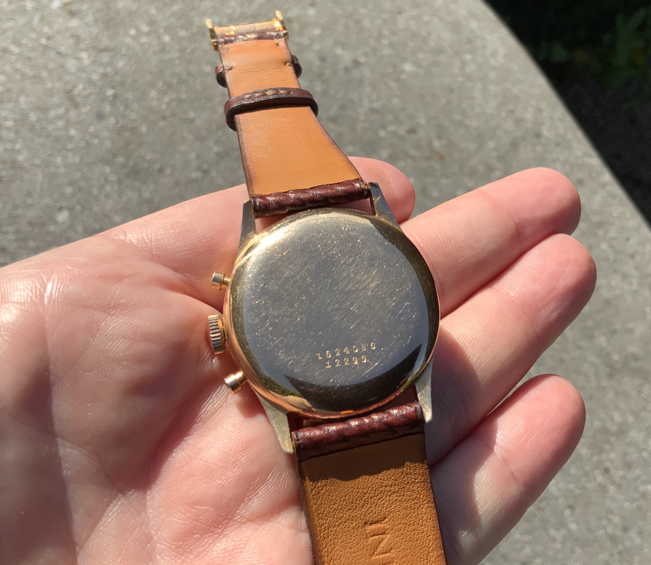 This rare reference was designed as a hardier weather-proof Compax for adventurous souls living and working in tropical climates in the 1950s and beyond. A special second cover sits underneath the case back thereby adding another barrier to moisture coming into the movement. The case is 34.5mm and solid rose gold. The baby pump pushers are very elegant and would likely have increased the case water resistance when new. Both reference and serial numbers are perfectly legible on the case back.