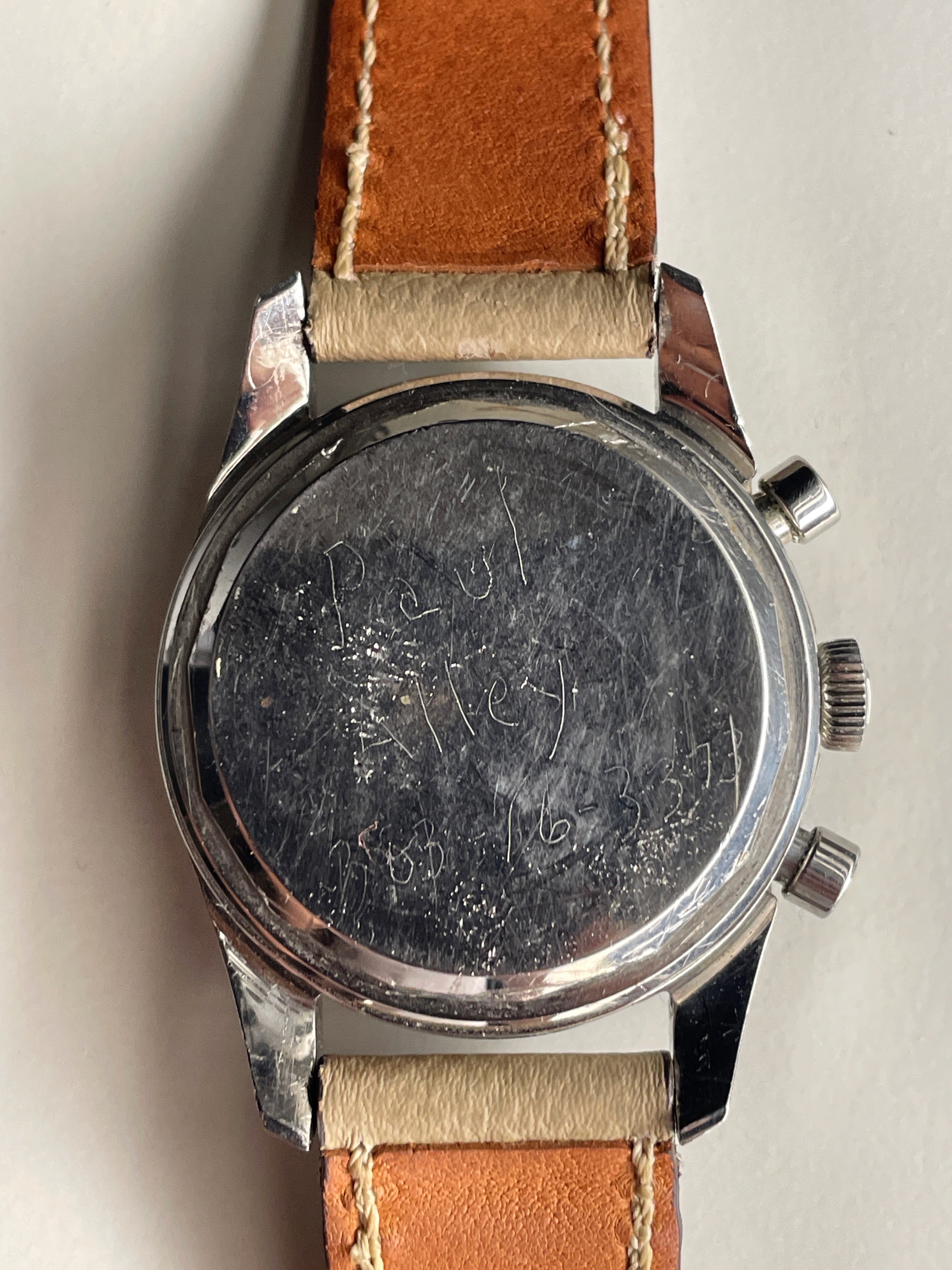 Case: The 36mm case is in good condition; probably had some minimal polish in the past, but otherwise remains VERY sharp. Some typical nicks here and there (the macro pics tend to exaggerate these blemishes; they are not as obvious in normal viewing conditions). The serial, sadly, isn't visible on the case back anymore, and one of the previous owners etched his name 😀