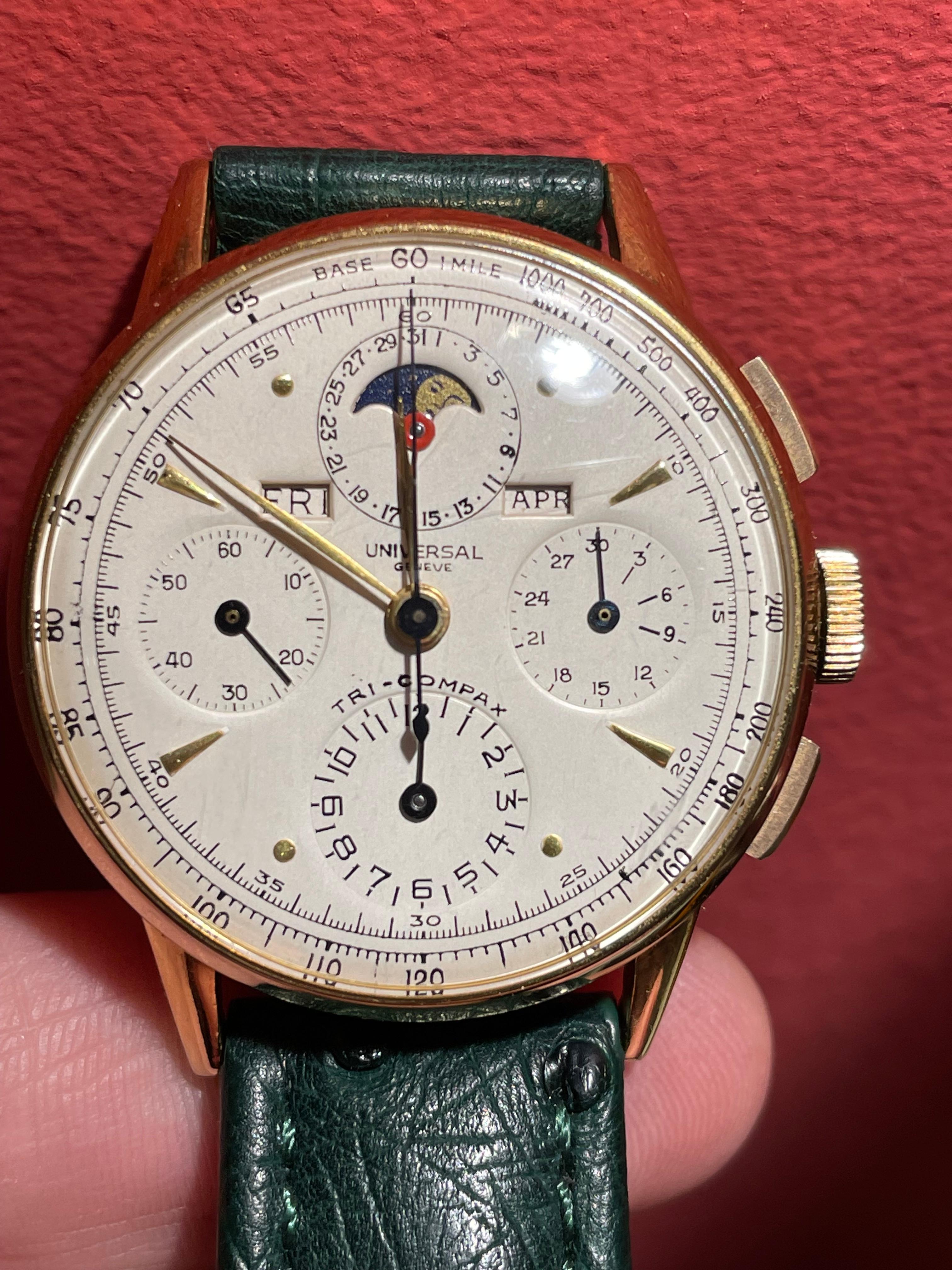 I am considering buying this Universal Genève Compax. I believe that the dial may have been redone. Although I'm not completely sure. I am hoping someone can help me out with the originality of the dial as well as the markers and hands. I appreciate any insight and help.