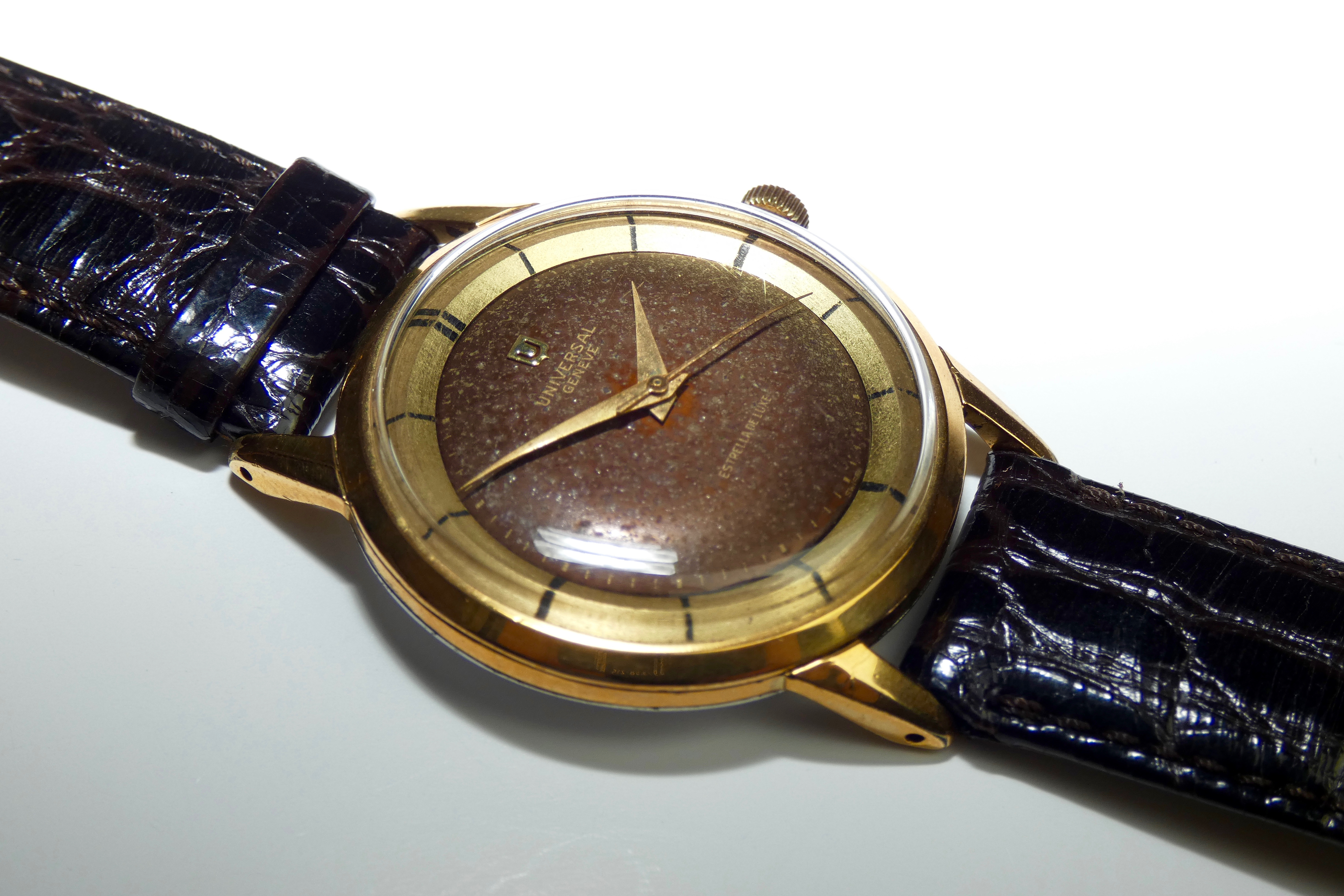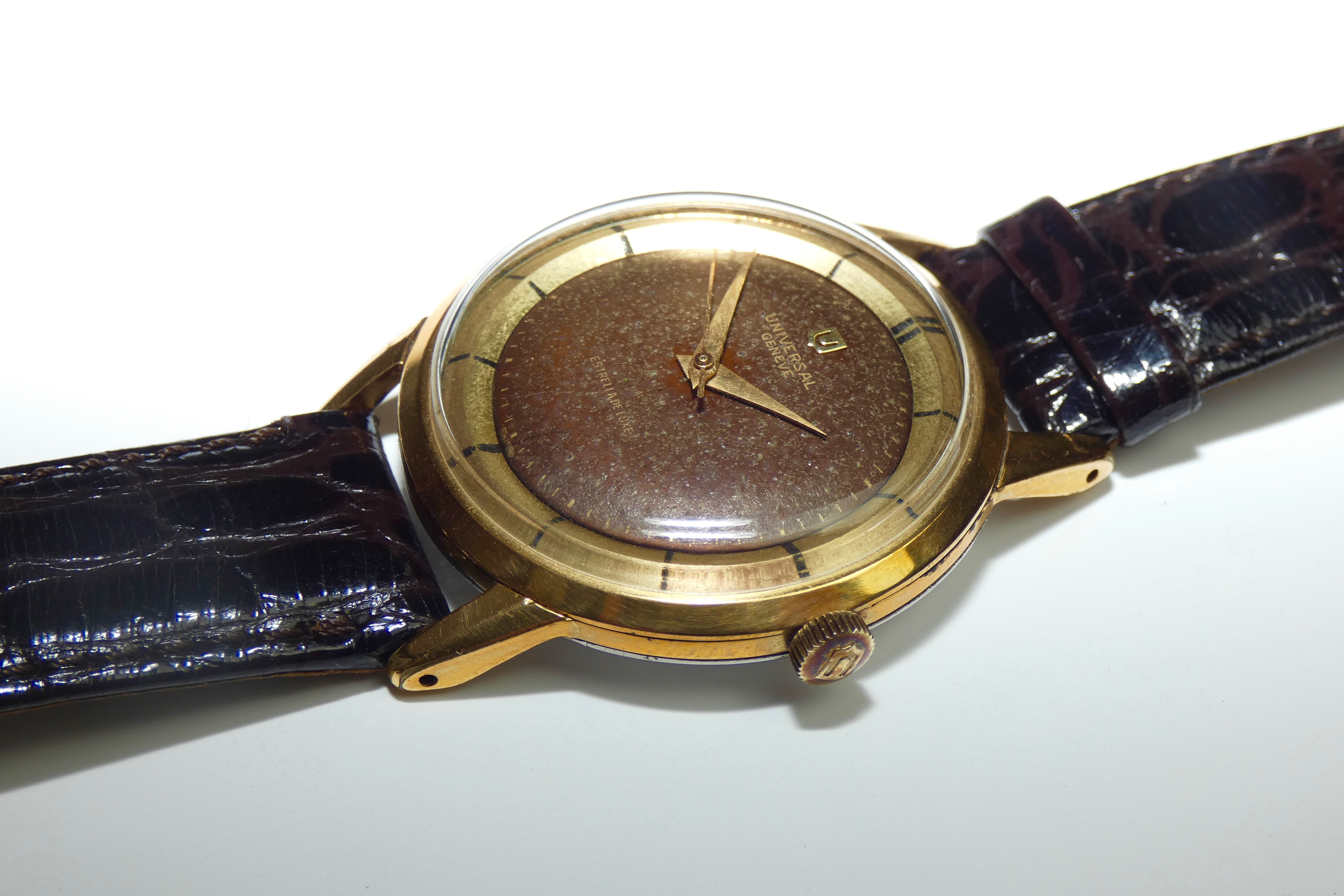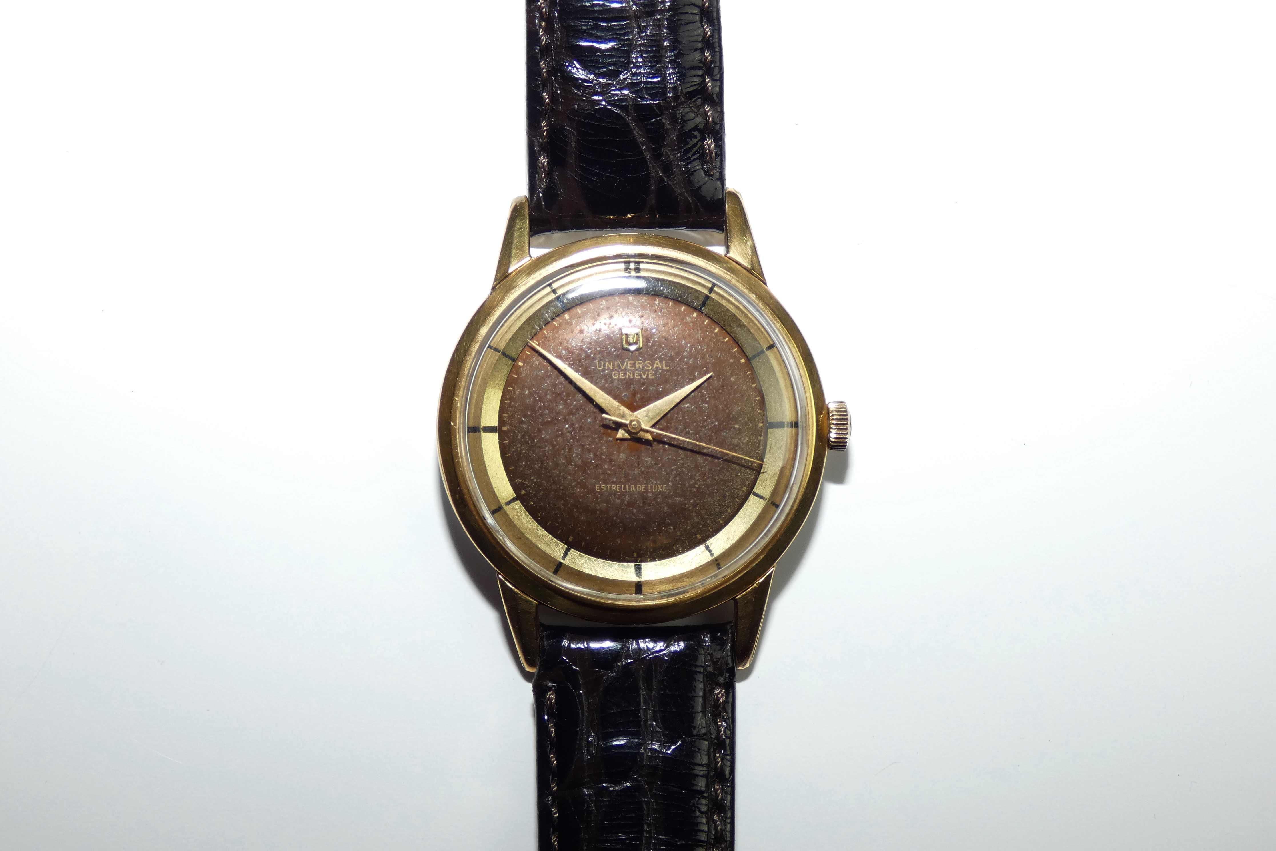 Dial: Originally black but now “tropical” chocolatey dark brown. Applied gold shield logo. Gilt text. Gold dauphine hands. Polerouter-esque gold ring.