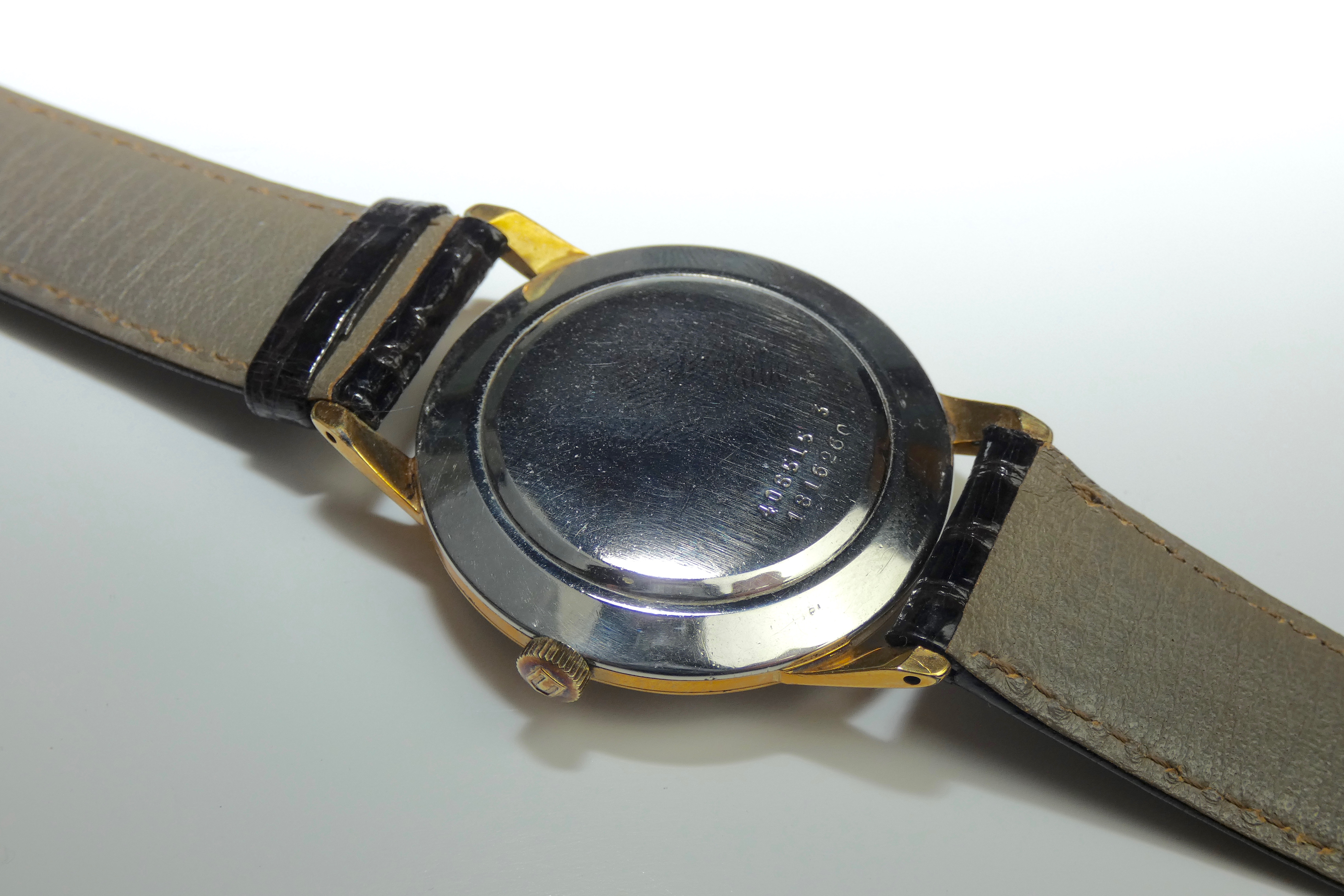 Case: 35mm gold plated case with stainless steel case back. Tapering and bevelled lugs. 18mm lug width. Case reference and serial numbers engraved to case back. Signed crown.