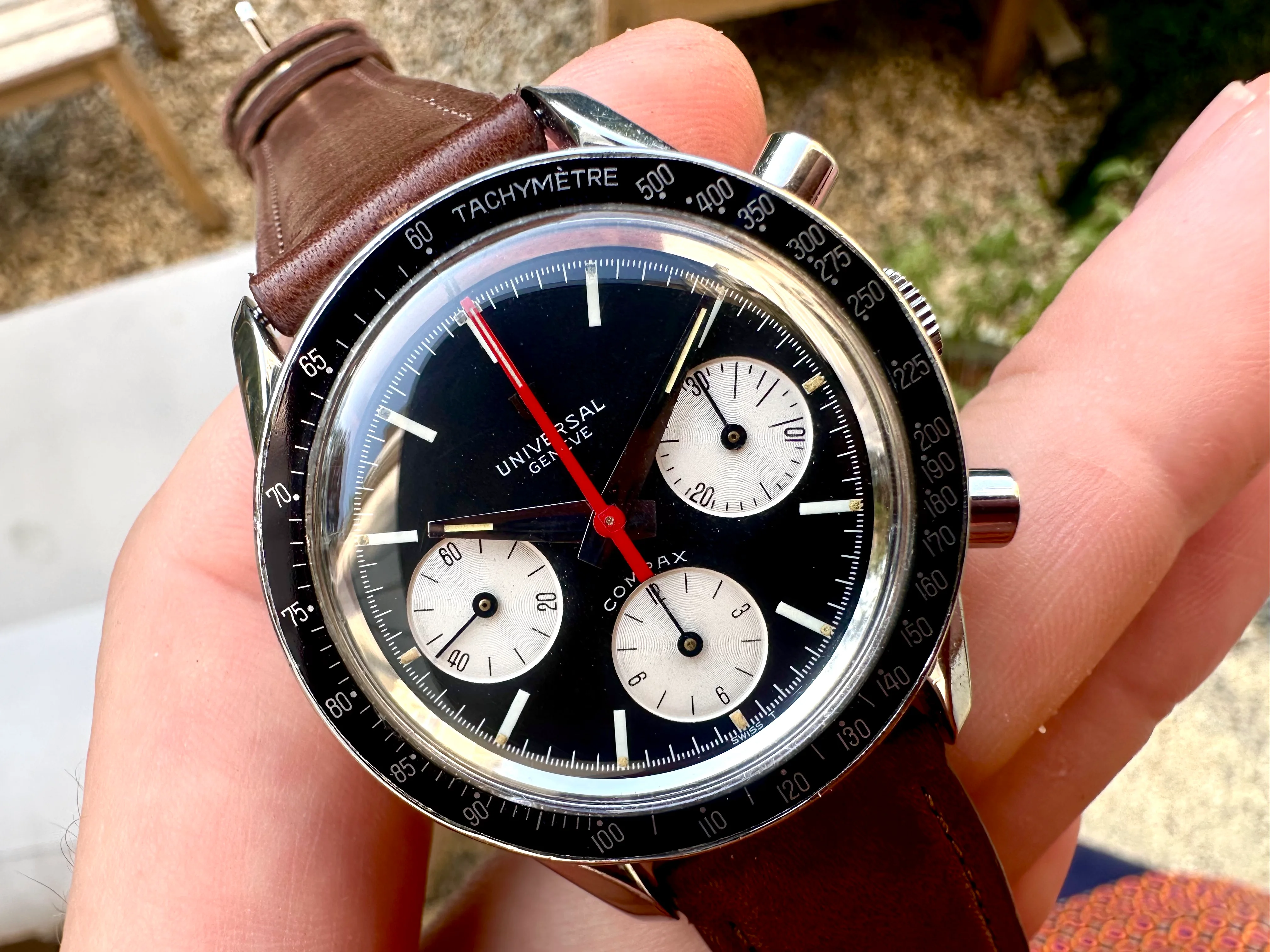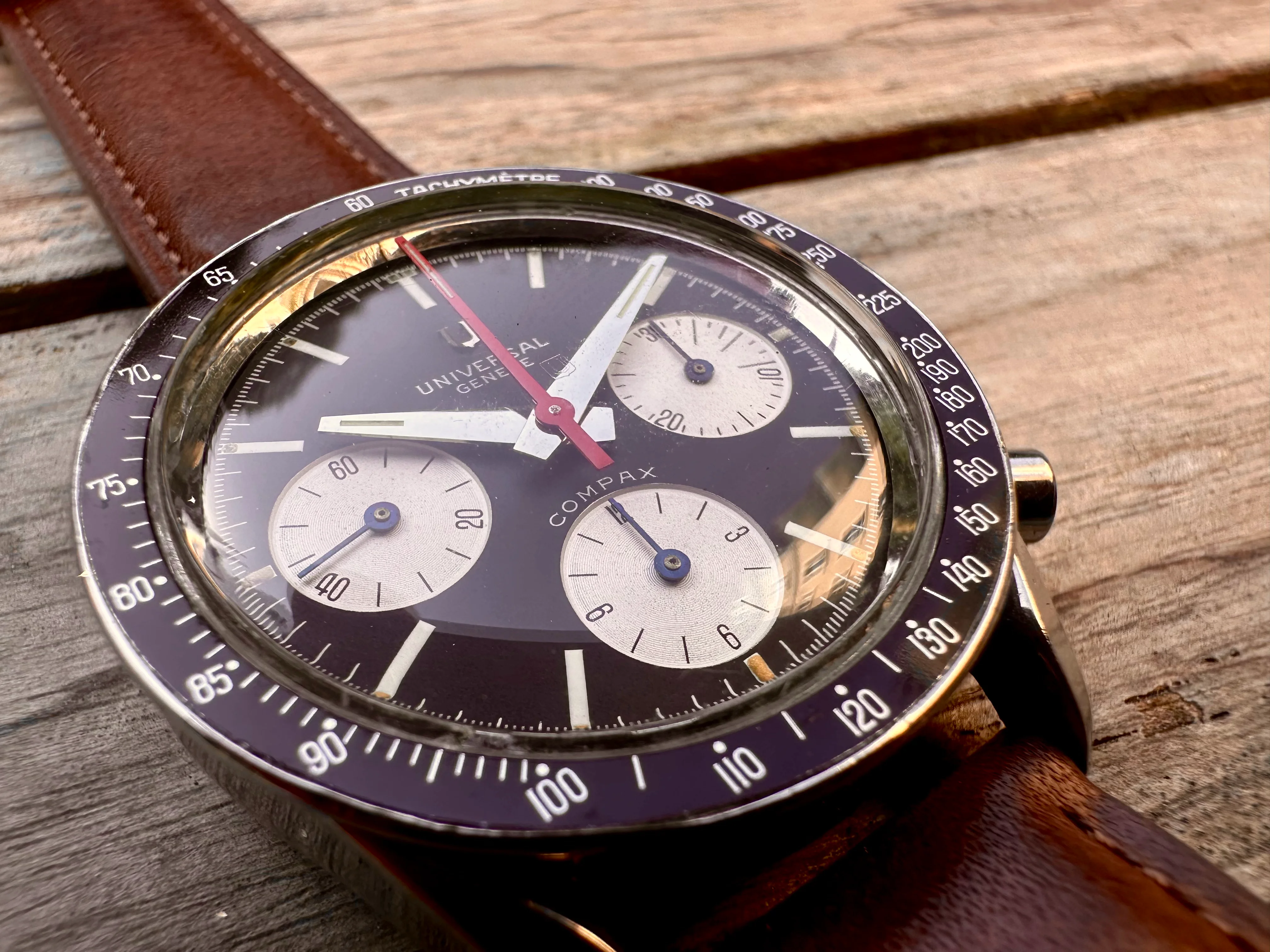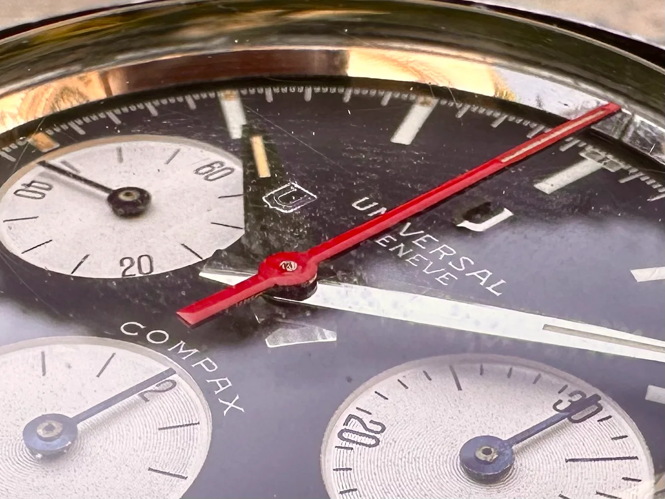 The watch is in absolutely original condition: original pushers, crown, dial, all hands, and plexiglass - signed Universal Genève. The crown bears the correct logo, and the plexi is signed at the center. The case, polished in the past, remains in excellent shape although serial number is not visible. The dial shows no marks, only a few dust particles; the plexi is free from scratches.