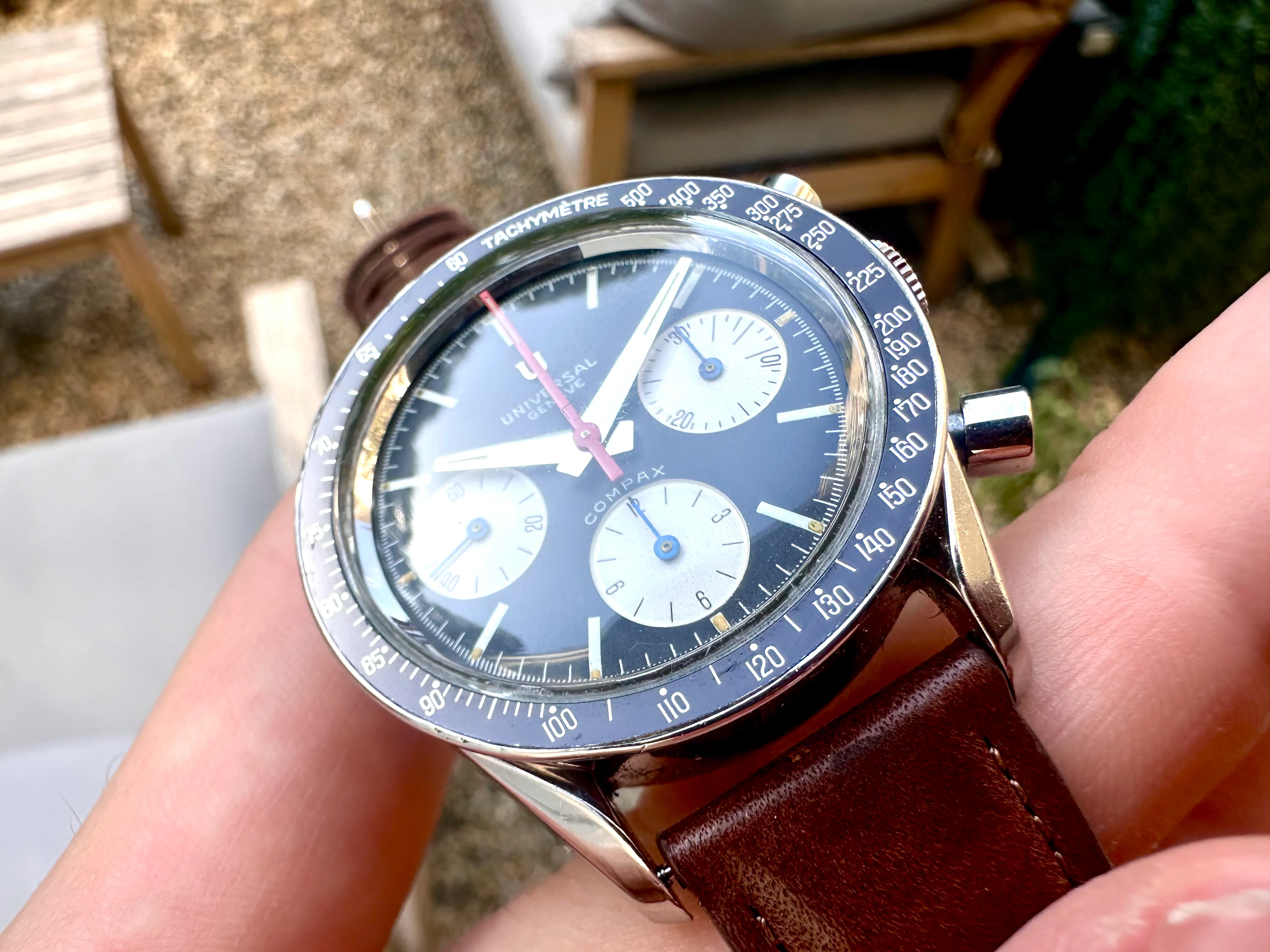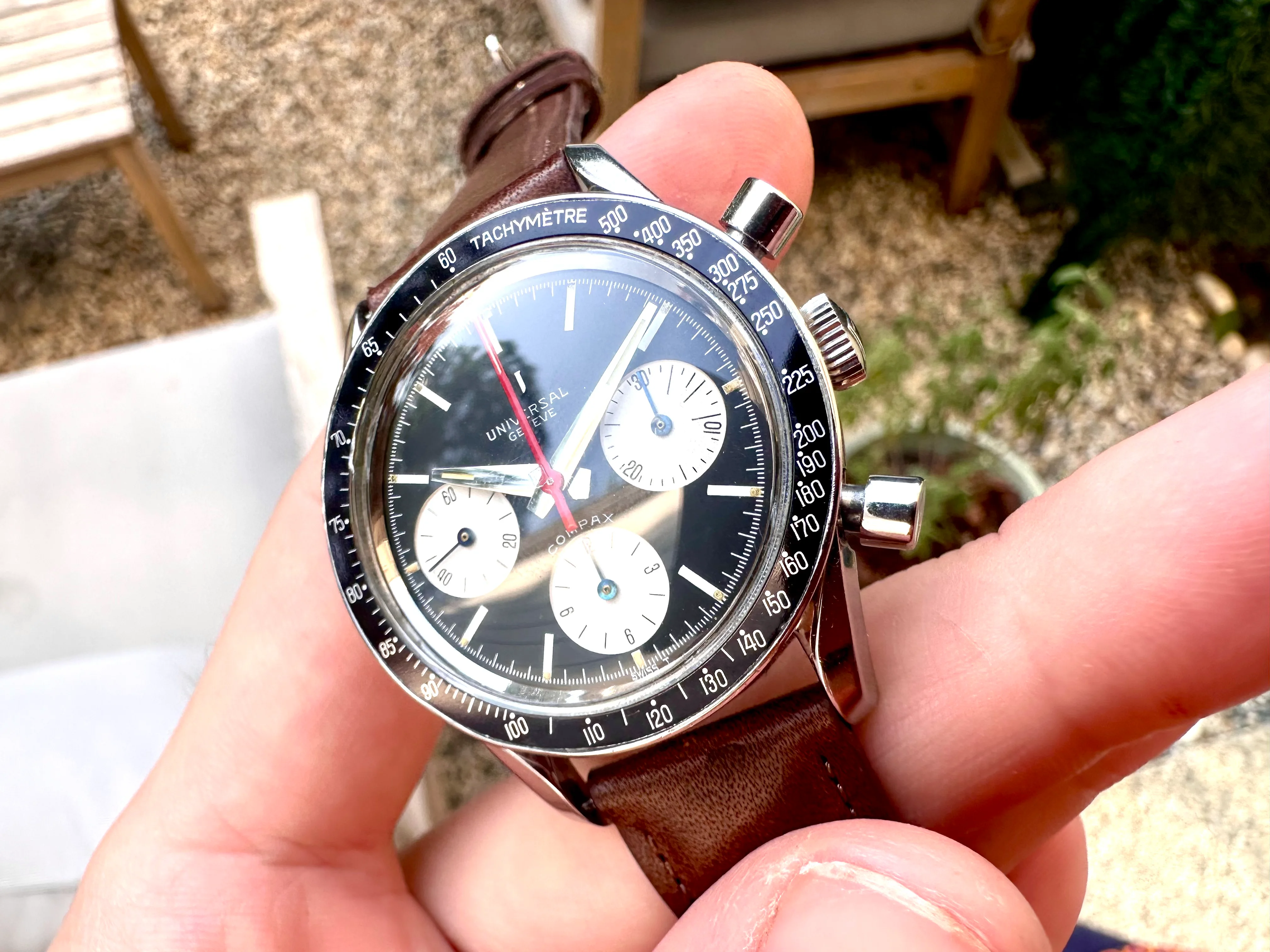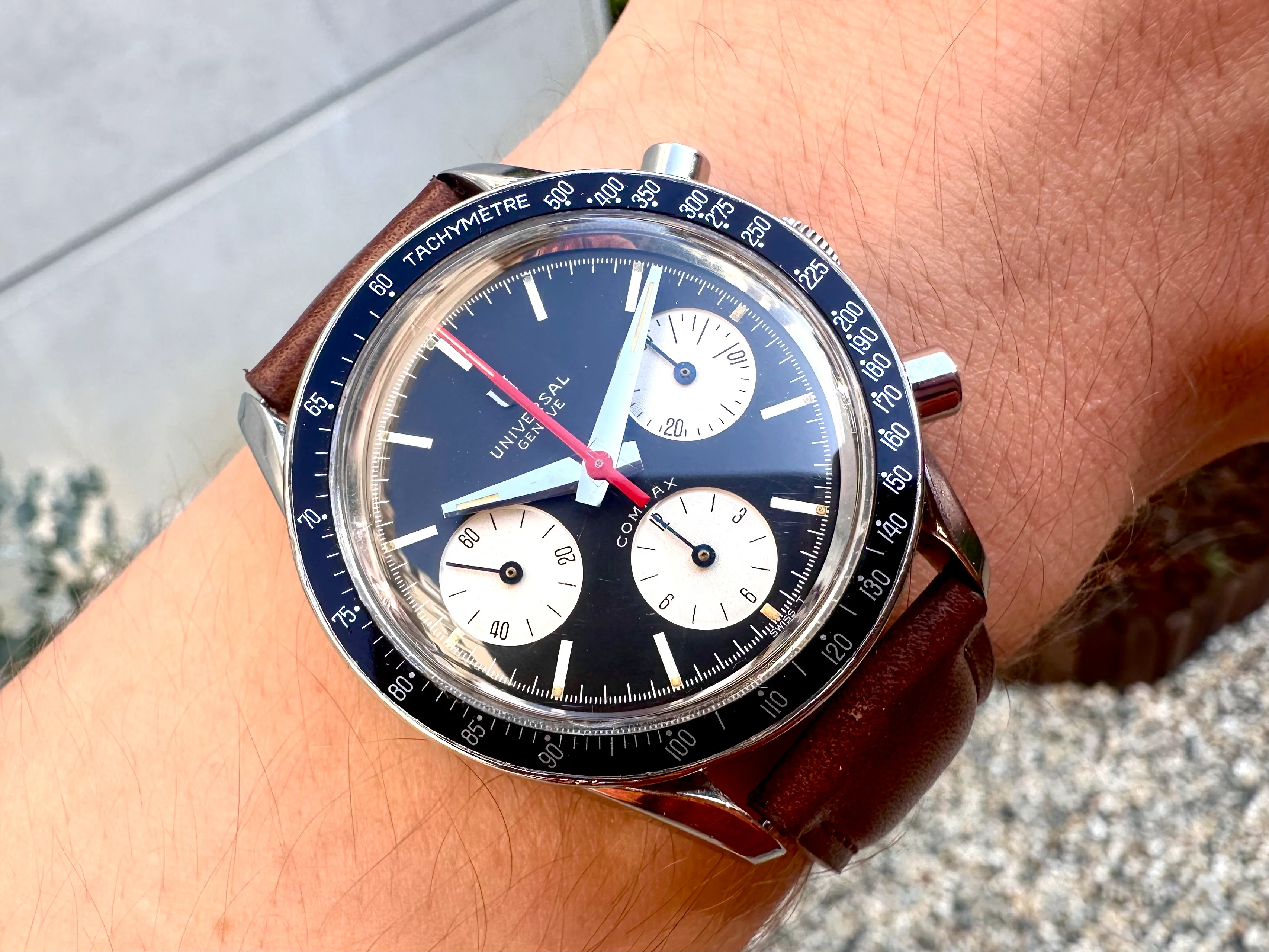 The watch is in absolutely original condition: original pushers, crown, dial, all hands, and plexiglass - signed Universal Genève. The crown bears the correct logo, and the plexi is signed at the center. The case, polished in the past, remains in excellent shape although serial number is not visible. The dial shows no marks, only a few dust particles; the plexi is free from scratches.