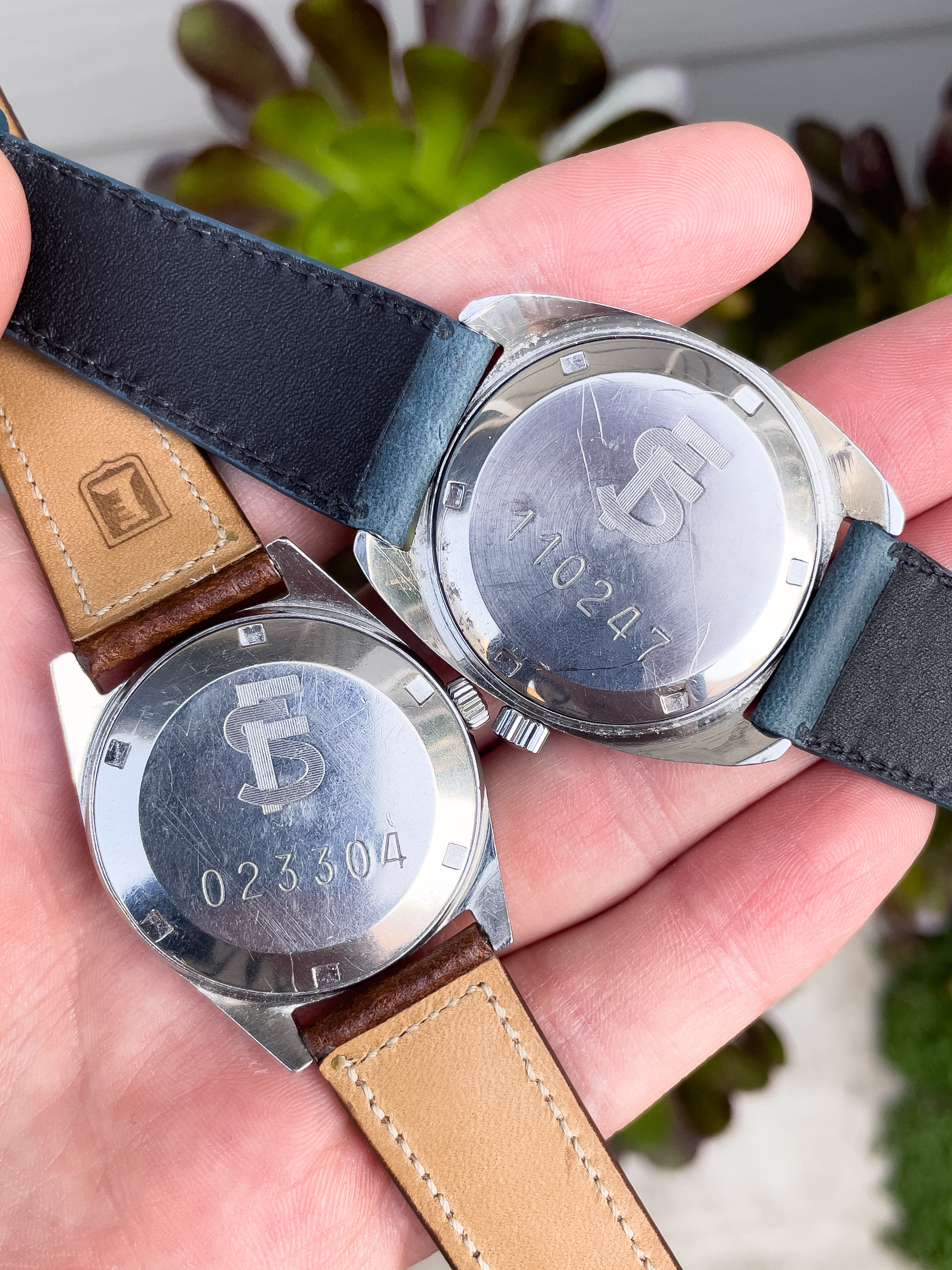 This is a very clean example with a beautiful and intact enamel dial. While the case does show wear commensurate with age, I believe it to be unpolished as it retains its sharp edges and faceted lugs unique only to the Mk1. The case measures 34mm not including the crown and wears wonderfully on my 7" wrist. The crystal is clear and intact. The crown is the original signed crown. The caseback is in good condition with the serial number and FS well preserved. The cseback also has the original tension ring, which you can see in one image. The enamel dial is beautiful and completely intact. It has gone the slightest shade of tan but I will not dare say this is tropical- just stating a fact it is not stark white. However, I do think it is a fun patina that lends this watch to look fabulous on a brown strap. For a quick example, here is the Mk1 next to a Mk2 with a pristine white dial- there is a very subtle difference where the Mk1 dial is slightly warmer in tone. The tone is even and uniform across the entire dial.