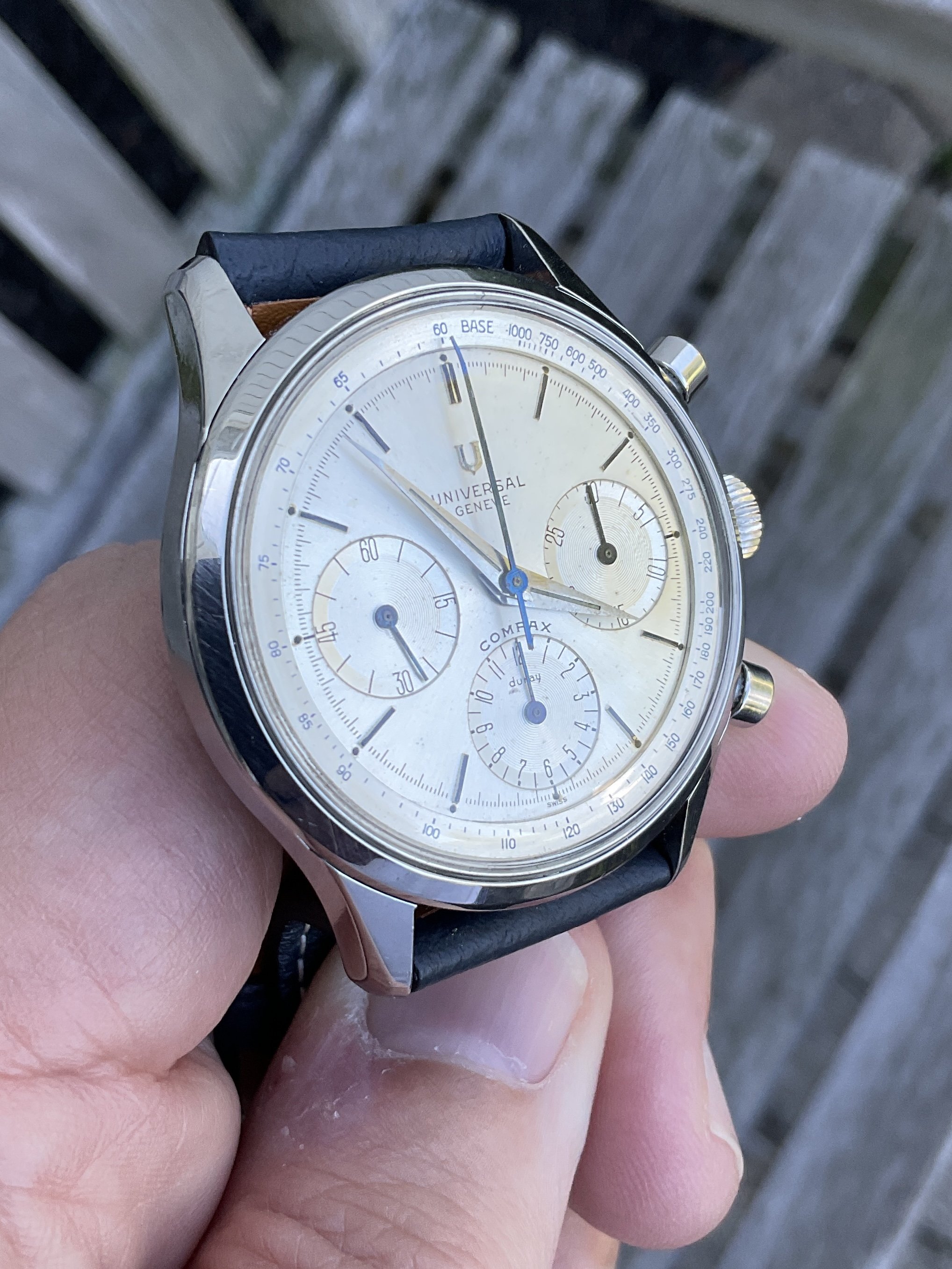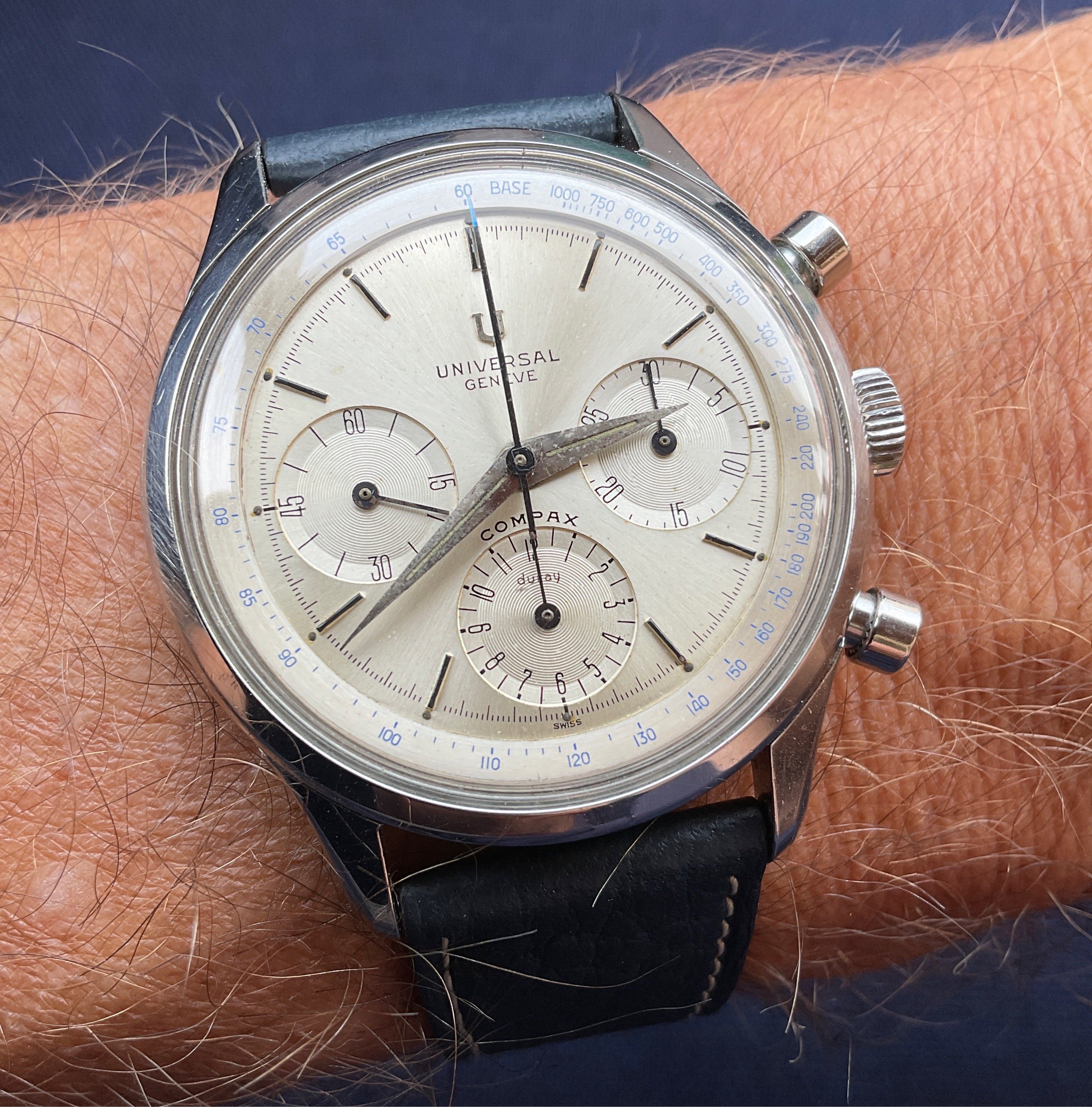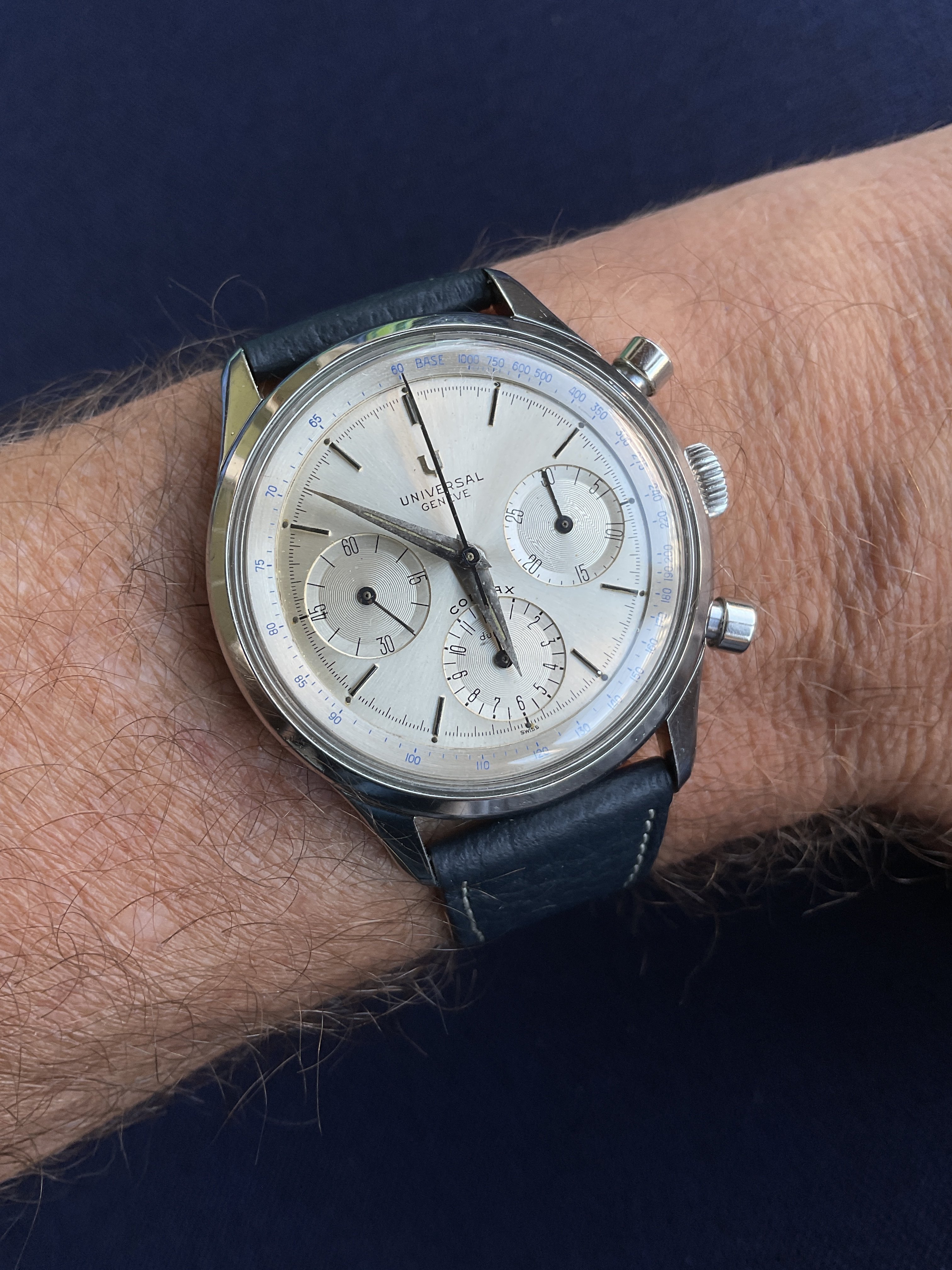 For sale is this wonderful 1960s Universal Geneve chronograph. Details and pictures below, but the “headline” is the huge size of the case, 38mm not including the crown. Wears like a much more modern piece due to that very, very unusual size in the world of vintage UG.