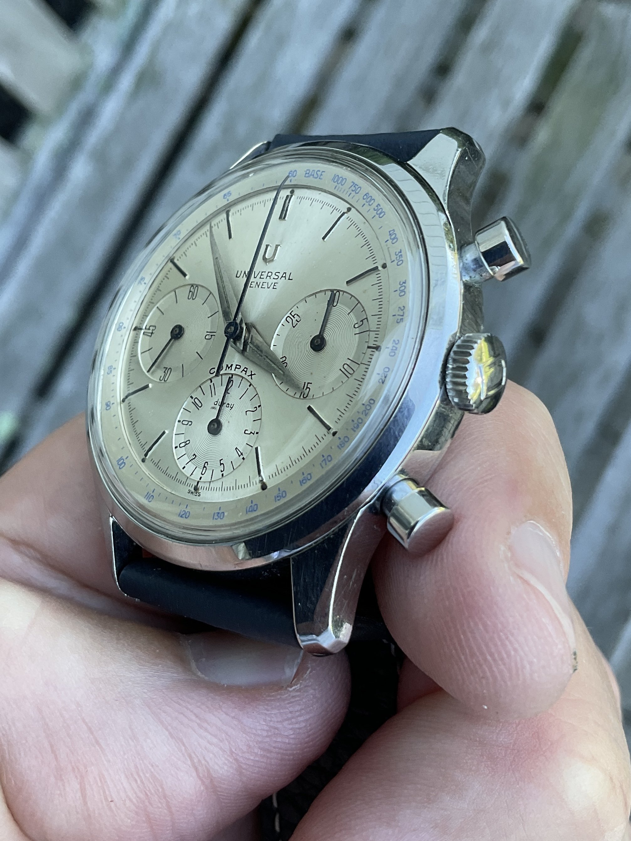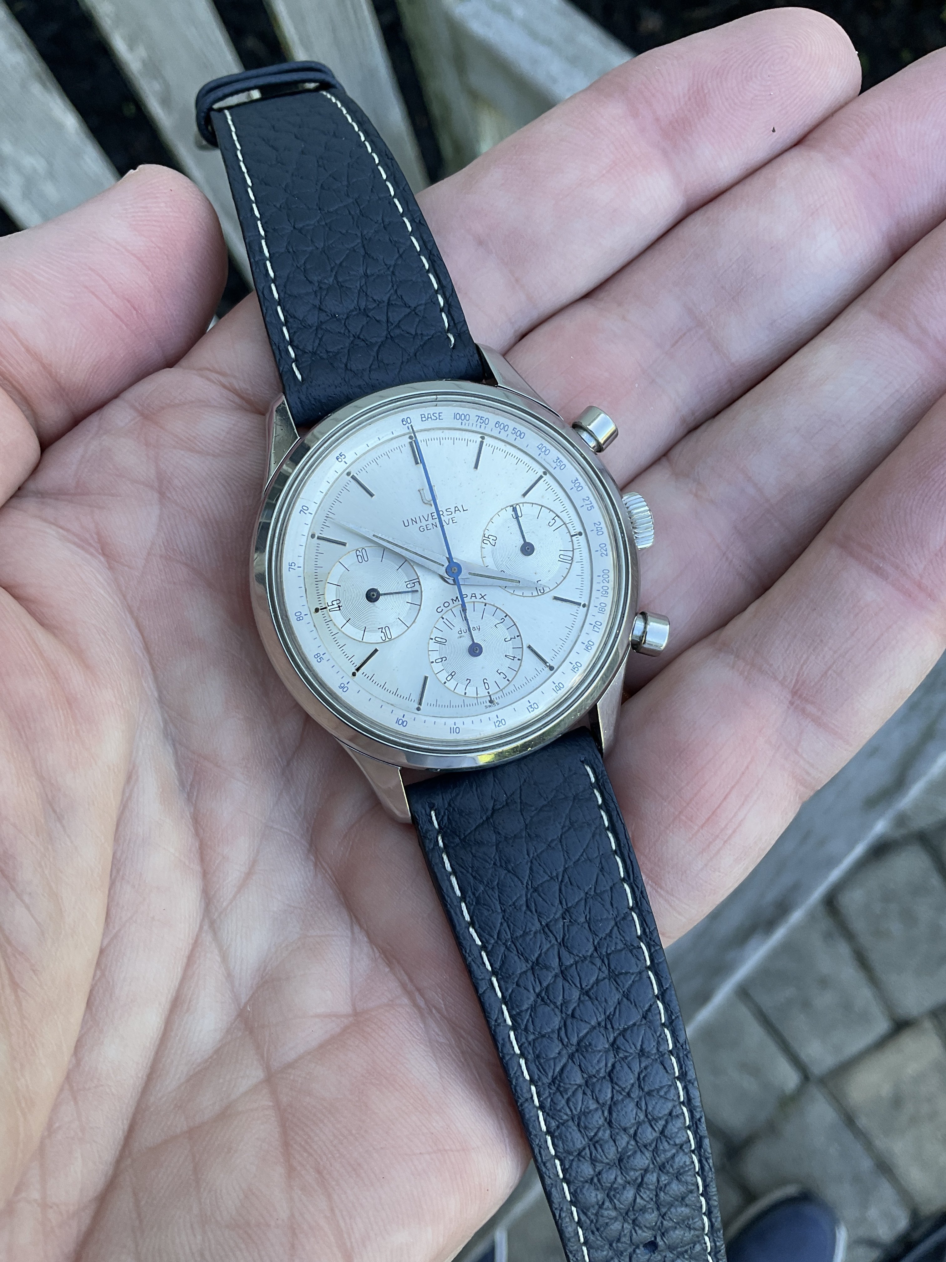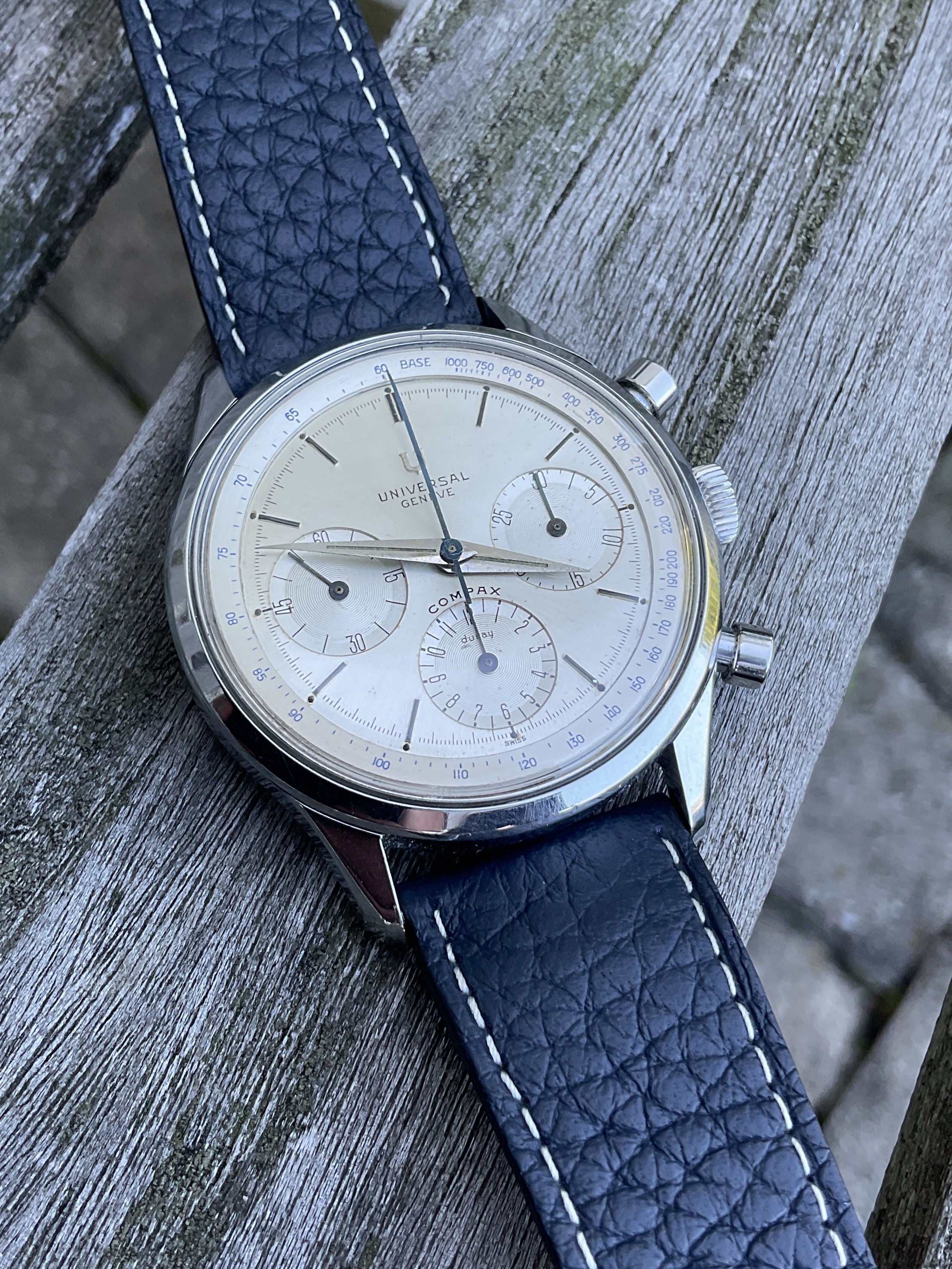 For sale is this wonderful 1960s Universal Geneve chronograph. Details and pictures below, but the “headline” is the huge size of the case, 38mm not including the crown. Wears like a much more modern piece due to that very, very unusual size in the world of vintage UG.