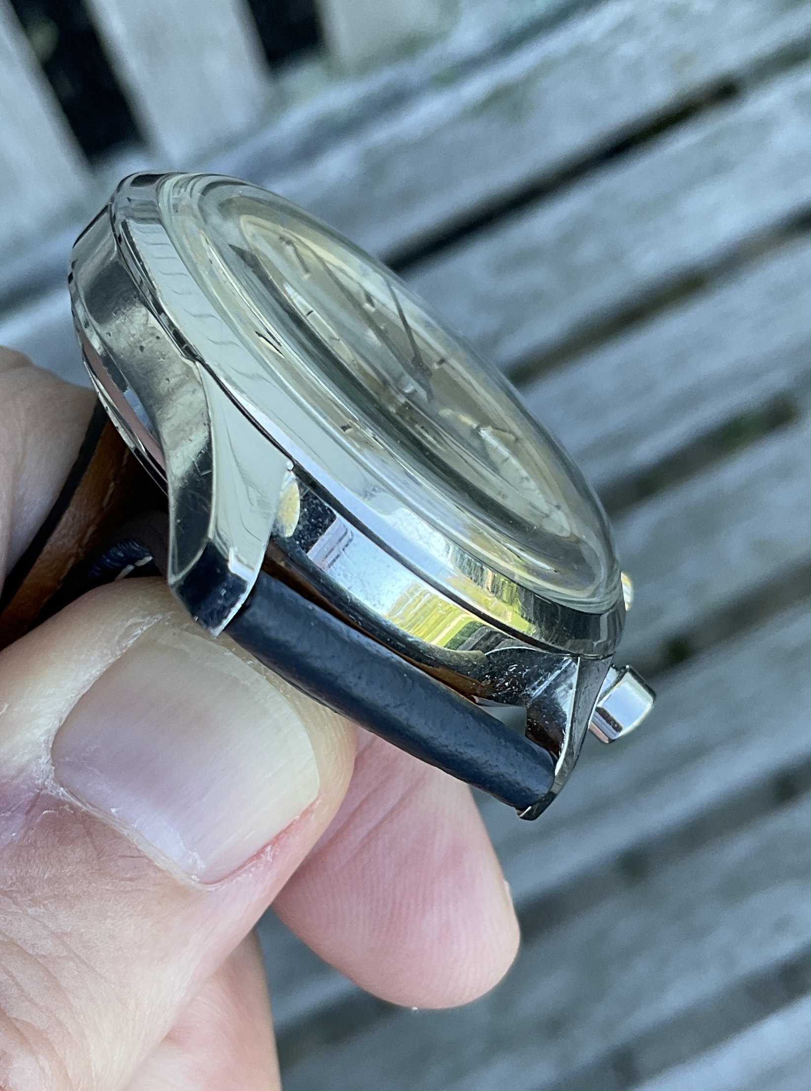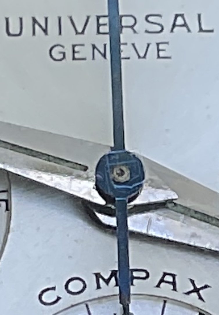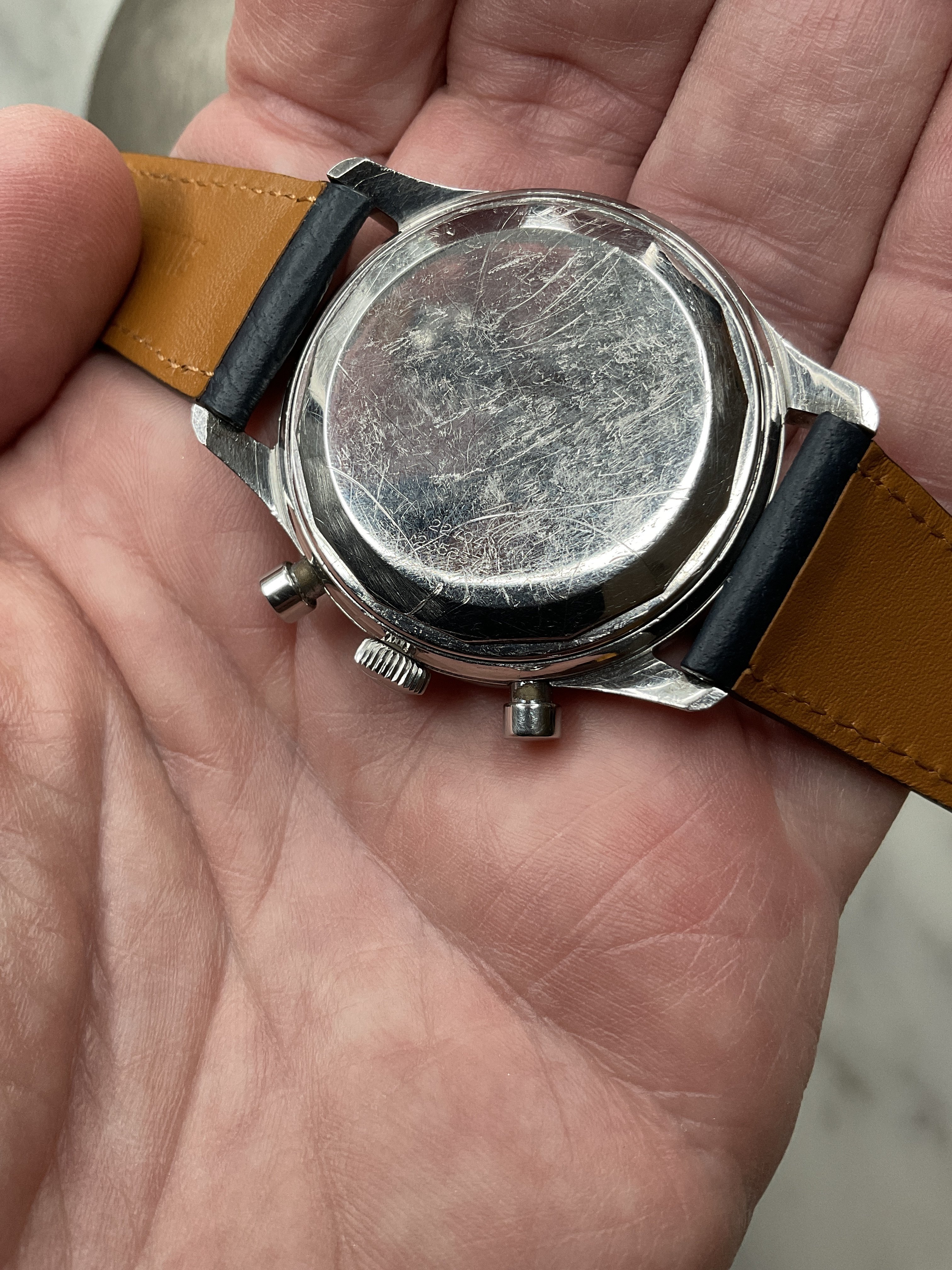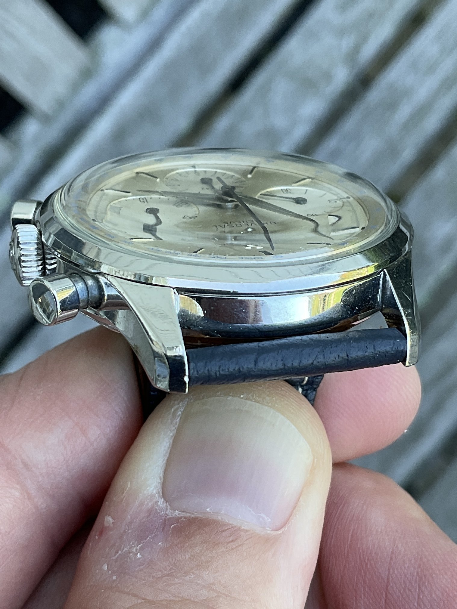 This example is in great shape, and fully original right down to its signed (and correct) UG crown, and even its “U”signed crystal (pictured below). The dial shows some very light patina, and one small spot in the bottom subdial just below of the “D” in Duray, a Belgian watch and jewelry retailer at the time. The front and sides of the case are in very nice shape, as are the pump pushers that work perfectly to reset the chrono sweep hand. The back of the case shows some scratches, but the reference and serial numbers remain visible (and are now protected under a case back sticker). I’m reluctant to say the case has never been polished (note the sharp edges of the lugs, both top and bottom) as I cannot be certain, but either way it’s a very sharp case that shows some honest wear.