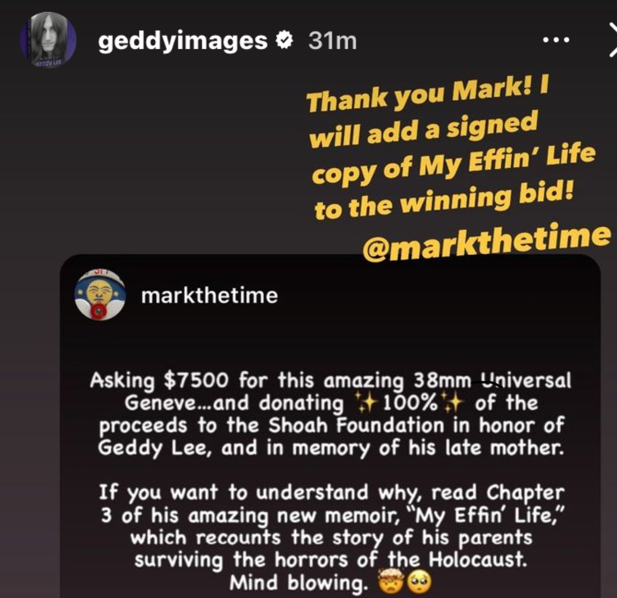 ·CHARITABLE UPDATE: Now asking $7500 for this amazing 38mm Universal Geneve…and donating ✨100%✨ of the proceeds to the Shoah Foundation (the non-profit organization founded by Steve Spielberg to create and preserve visual histories of survivors and witnesses of the Holocaust) in honor of Geddy Lee, and in memory of his late parents. Happy to provide proof to the eventual buyer. If you want to understand why, read Chapter 3 of his amazing new memoir, “My Effin’ Life,” which recounts the story of his parents surviving the horrors of the Holocaust. Mind blowing. And from one of the greatest Rock n’ Rollers of all-time, who also just happens to be a vintage watch nut as well. I will gladly provide proof of the subsequent donation to the eventual buyer. **** AND GEDDY HIMSELF HAS GRACIOUSLY OFFERED TO SEND YOU A SIGNED COPY OF HIS BOOK, TO SAY THANK YOU (as seen / evidenced on my Instagram page, @MarktheTime). ****