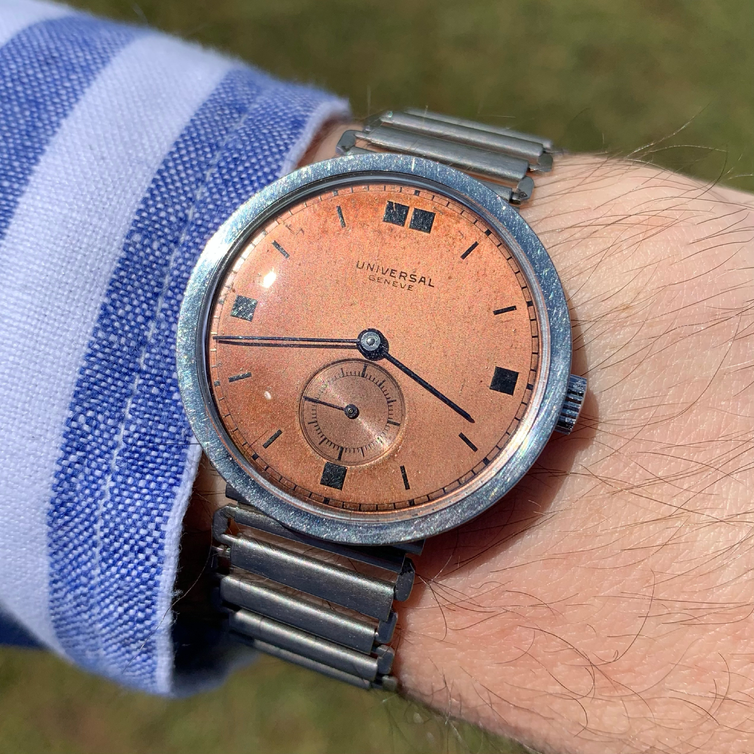 The 34mm fancy case is unlike anything I have ever seen from Universal. The watch feels honest in hand and marked inside-and-out with the usual UG stamps one would expect to find. The case is mostly brush-finished but the faceted edges at 1.15, 4.45, 7.15 and 10.45 have a highly reflective mirror polish on them which adds real drama to the watch at wrist. The lugs are fixed and precisely follow the curve of the case.