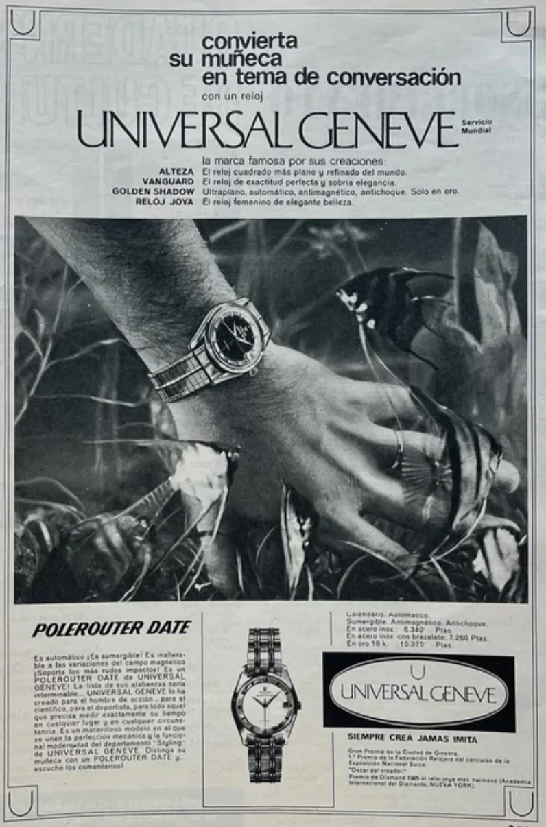 ·Here’s an interesting detail from two Spanish advertisements for the Universal Genève Polerouter: both watches are fitted with a JB Champion bracelet, specifically the TK model, as noted in the Polerouter book. What makes this notable is that the bracelet features 17mm end links, while the watch has 19mm lugs. Despite the visible gap between the bracelet and the case, this was an original factory configuration.