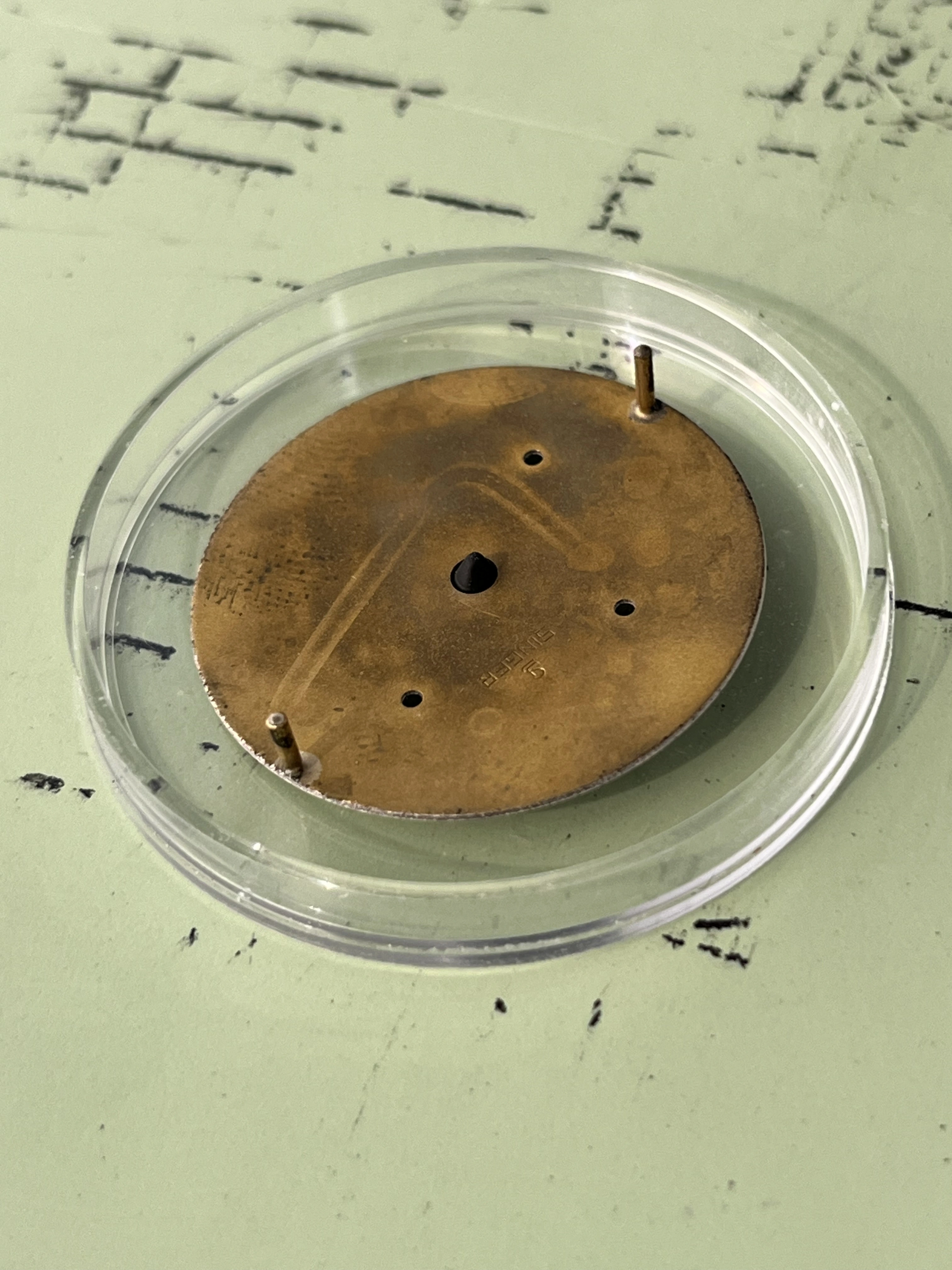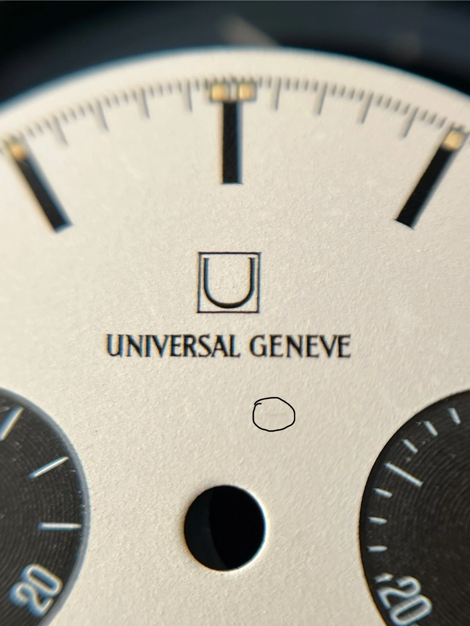 Edit to NOTE: this small "mark" on the dial under the G (halfway down to the handstack hole) was actually a tiny black fiber...and has been removed since taking these photos: