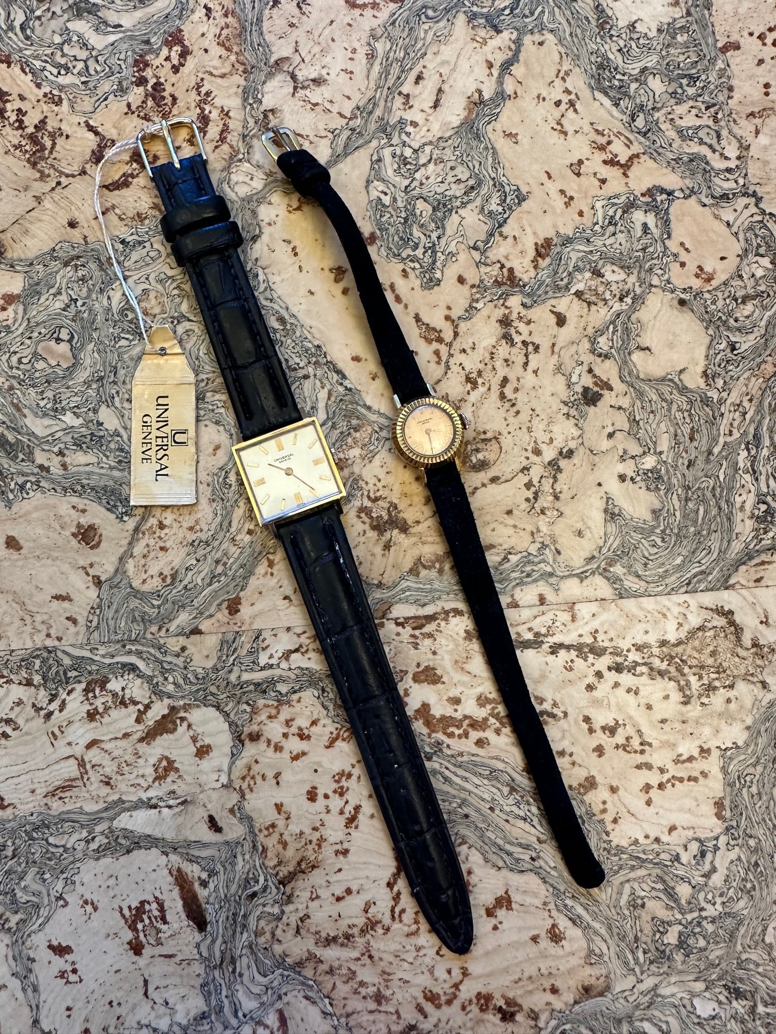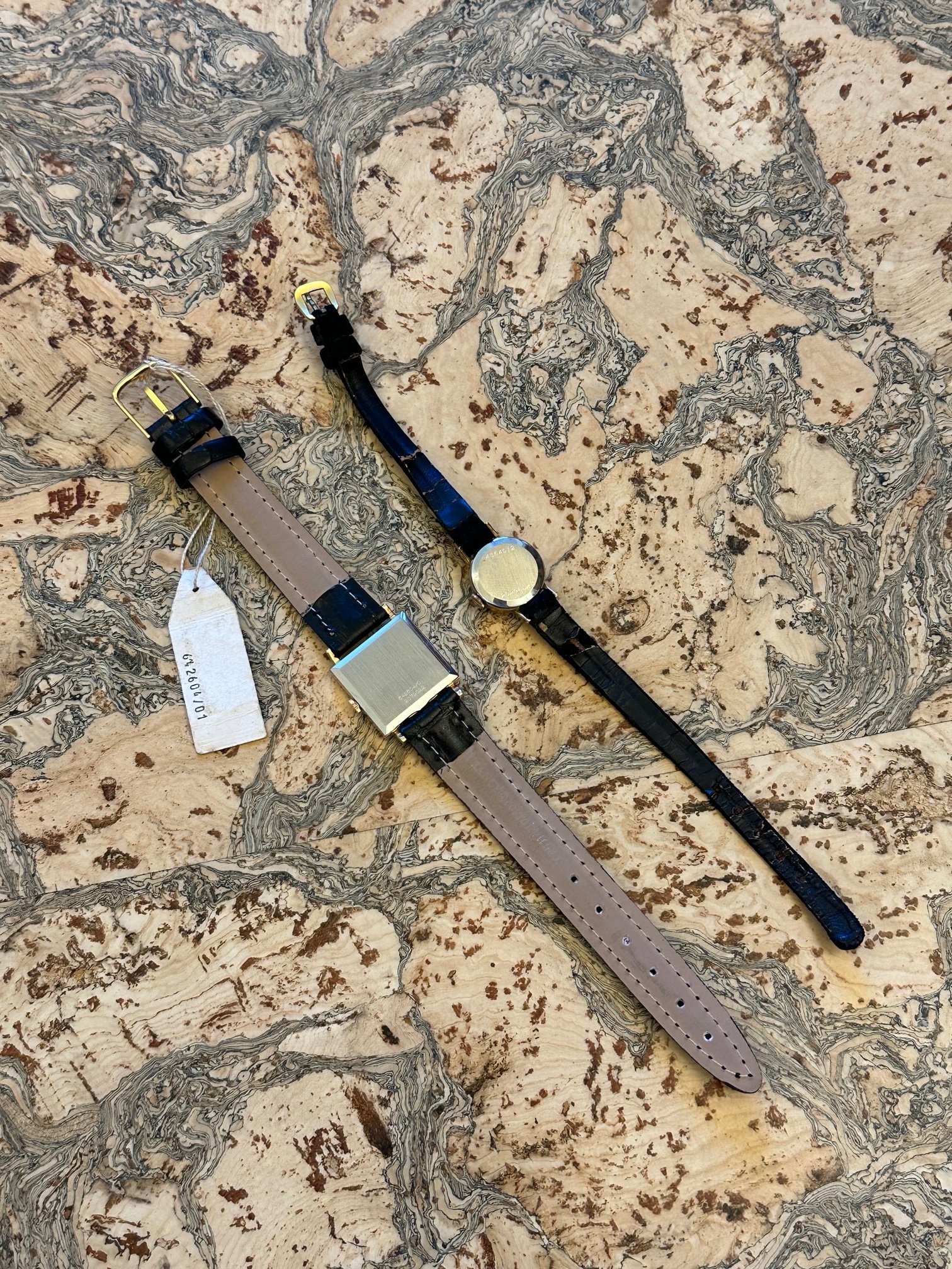The mens watch has original tag with reference number. The ladies watch does not have a tag, but it came with a set of three other watches with tags, so I do believe it is NOS. The mens watch has a generic strap and buckle, I cannot tell if it is vintage or newer. It has some white residue on the strap that makes me think perhaps old. The strap could probably use a clean. The ladies watch has a generic suede strap and buckle, however the backing on the strap is very deteriorated, I would not trust it, I think would have to be replaced if worn.