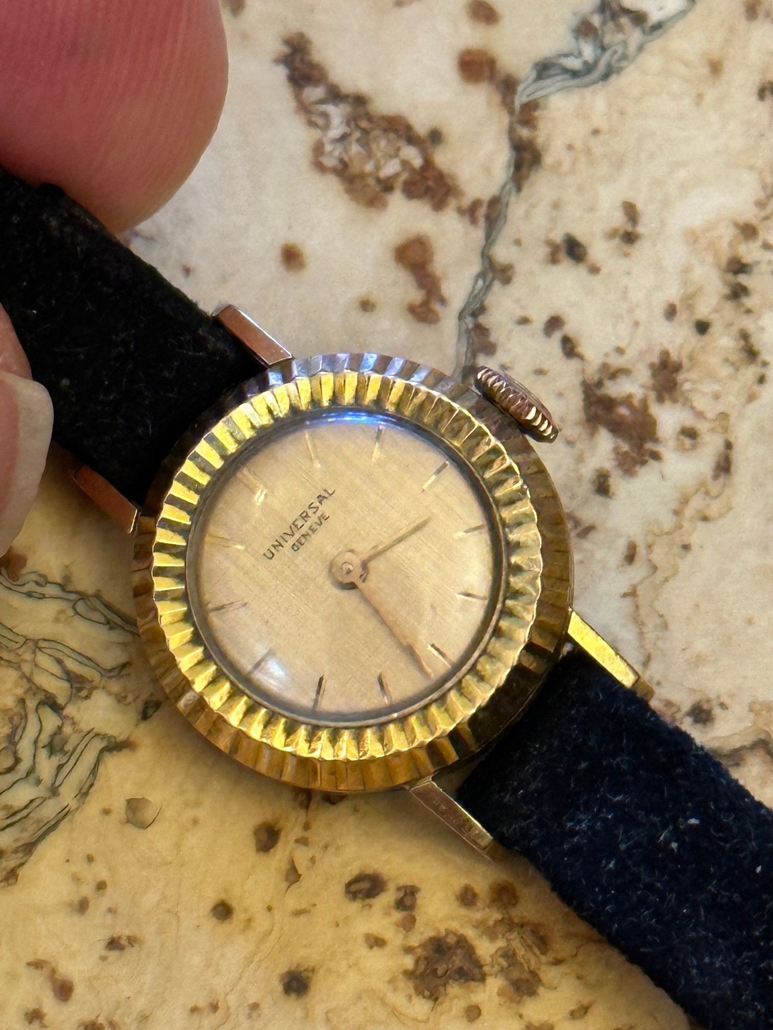 This has a rose gold tone linen dial that is hard to photograph. And a yellow gold tone fluted bezel, and a rose gold tone crown. It's an interesting combo of rose and yellow gold tones.