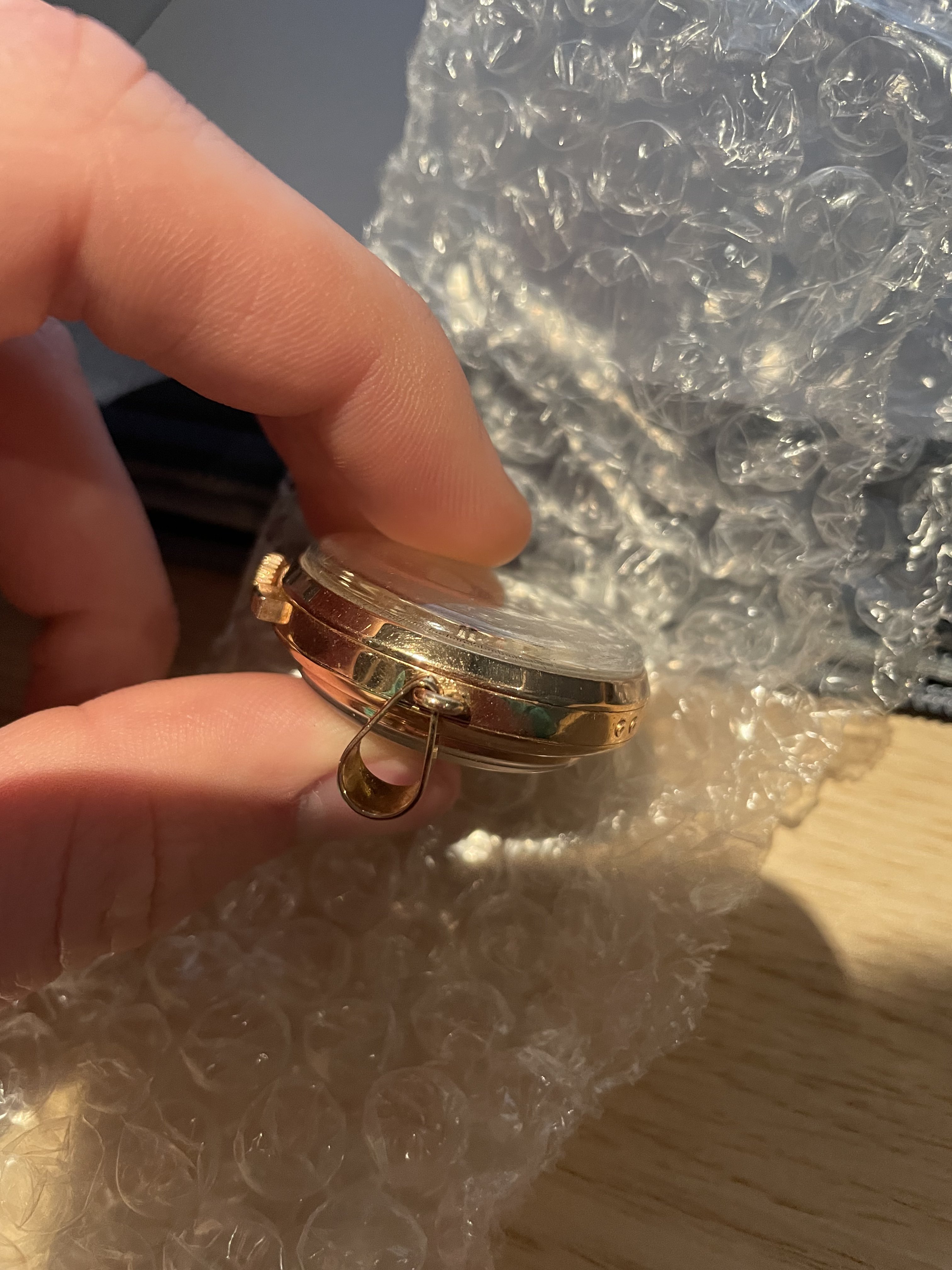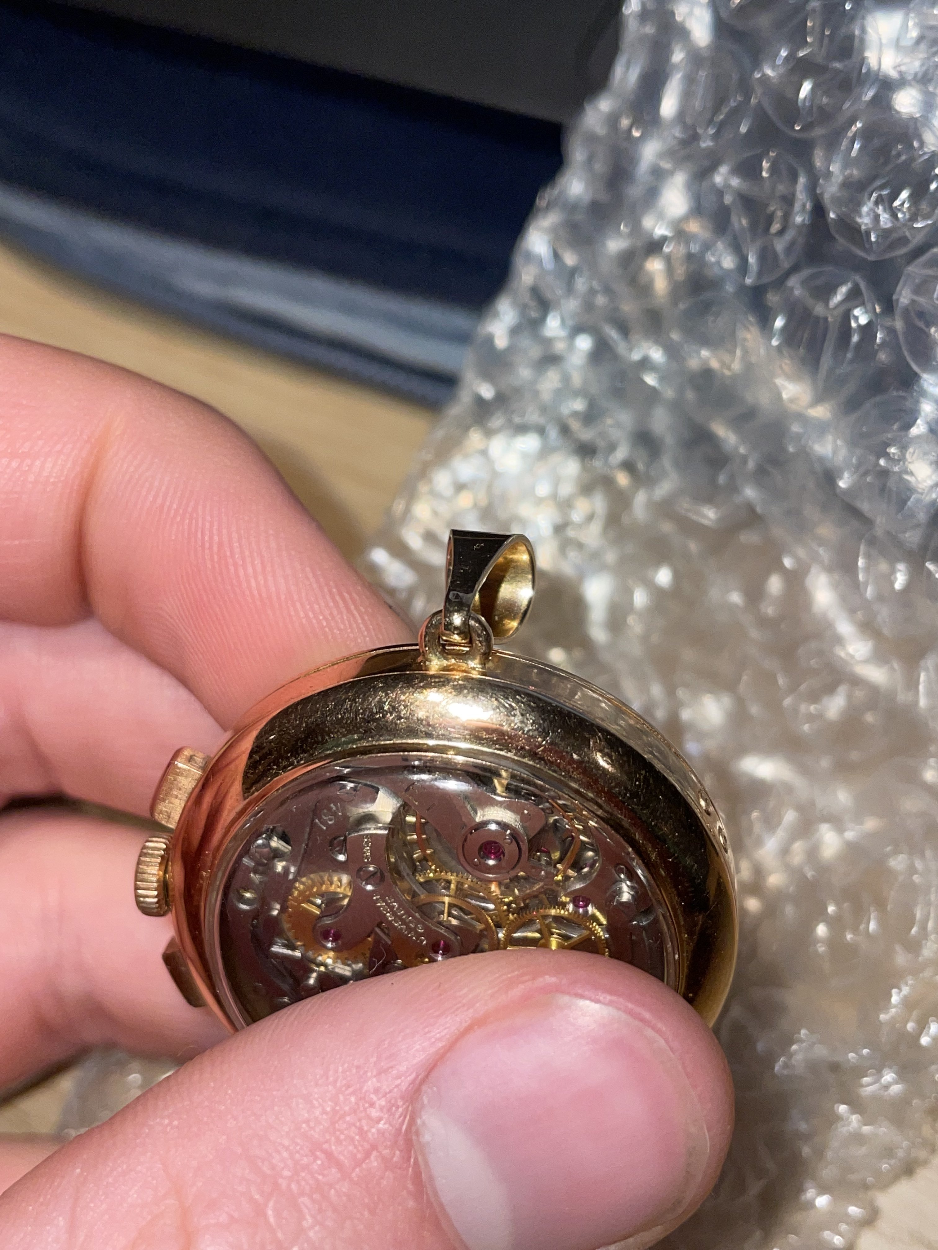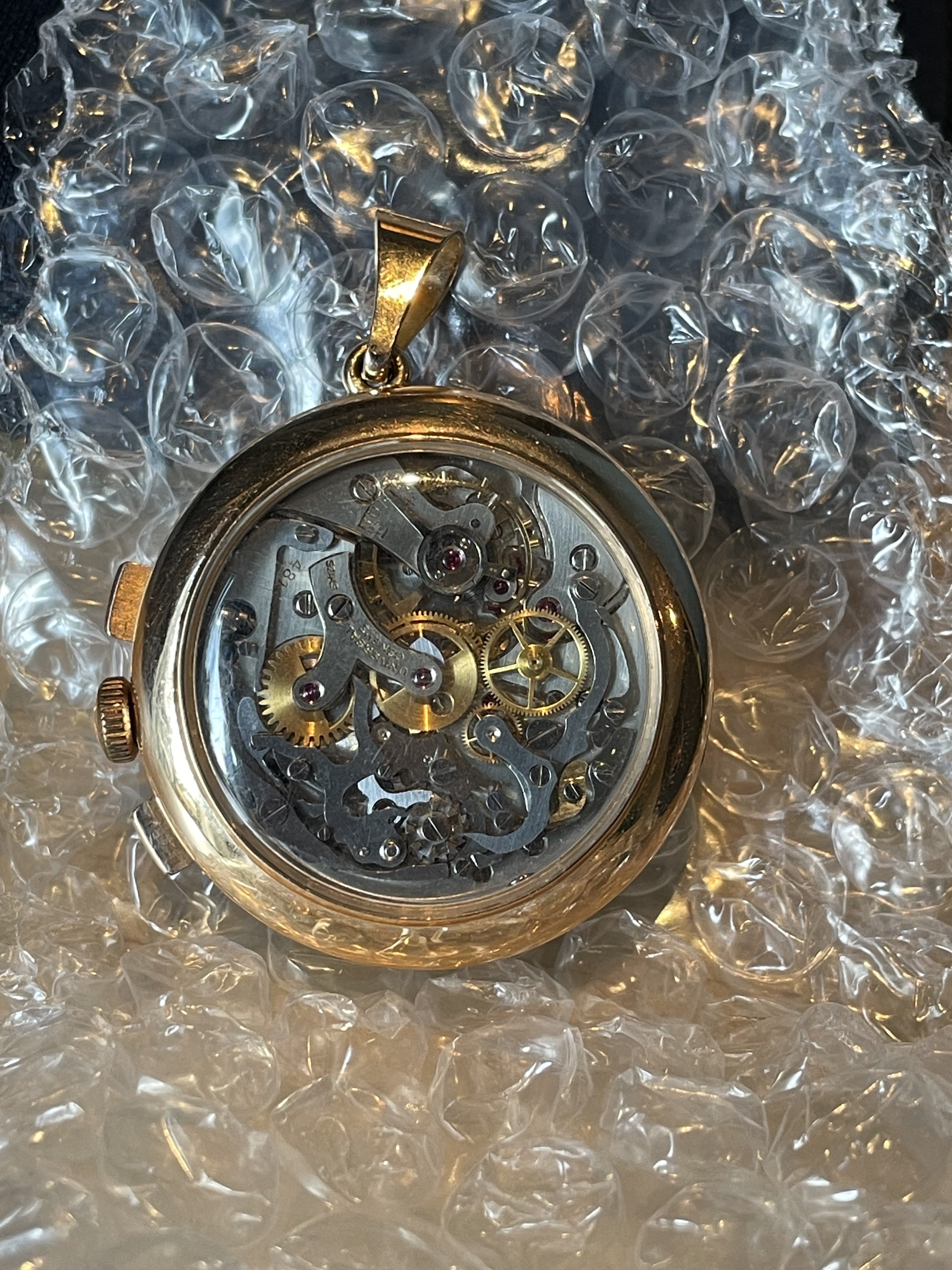 My initial thought was that the exhibition back (see-through back) was aftermarket, since UG during that era (almost) never did them. But on a small production run pendant watch, there's maybe a chance it's original (though I don't see a better than average finishing on the movement). I'd like to hear others chime in there.