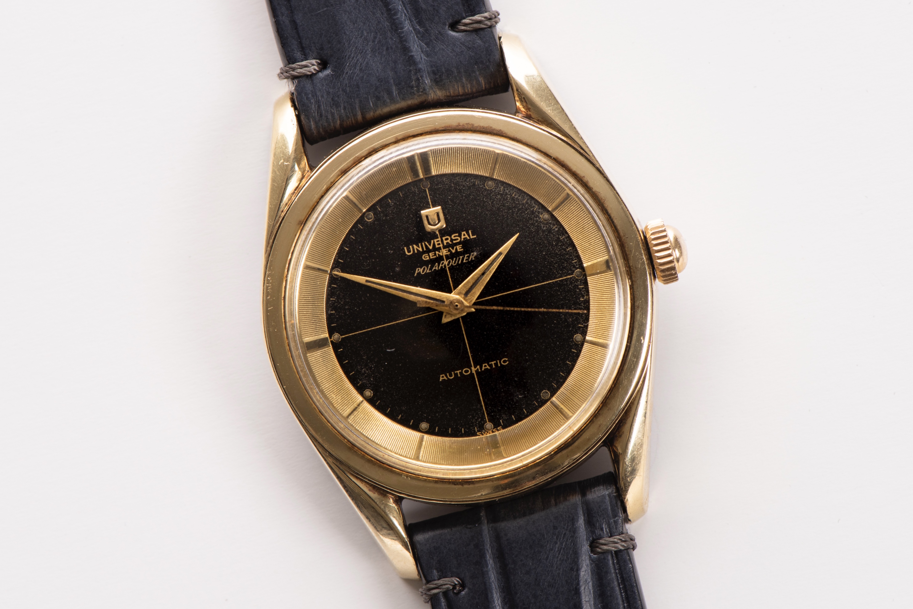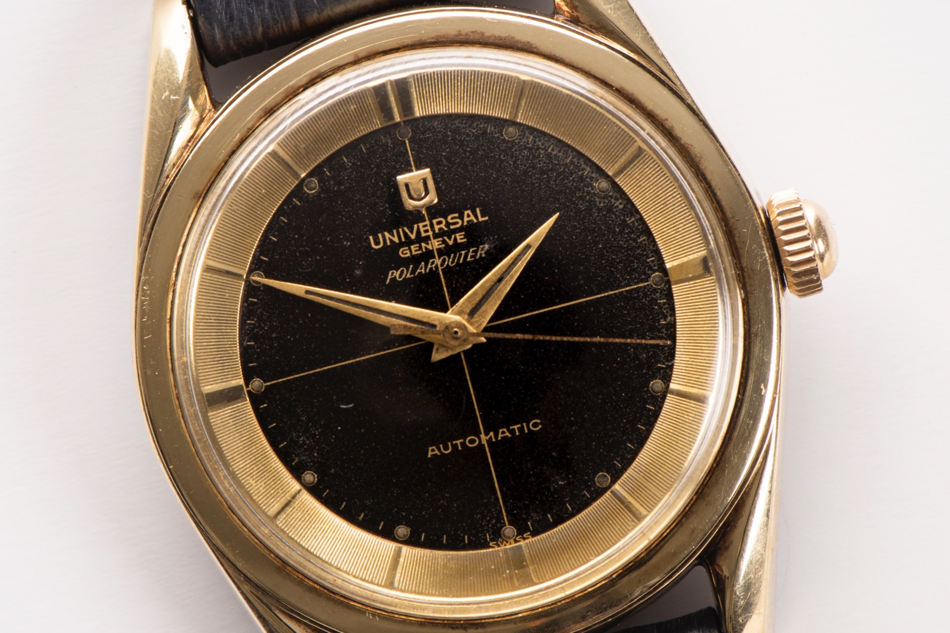 Dial: Glossy black dial with gilt crosshair and gilt text. Applied gold logo. Original lume plots. Dauphine hands with original lume. Gold marker ring with narrow indices, characteristic of a Polarouter.
