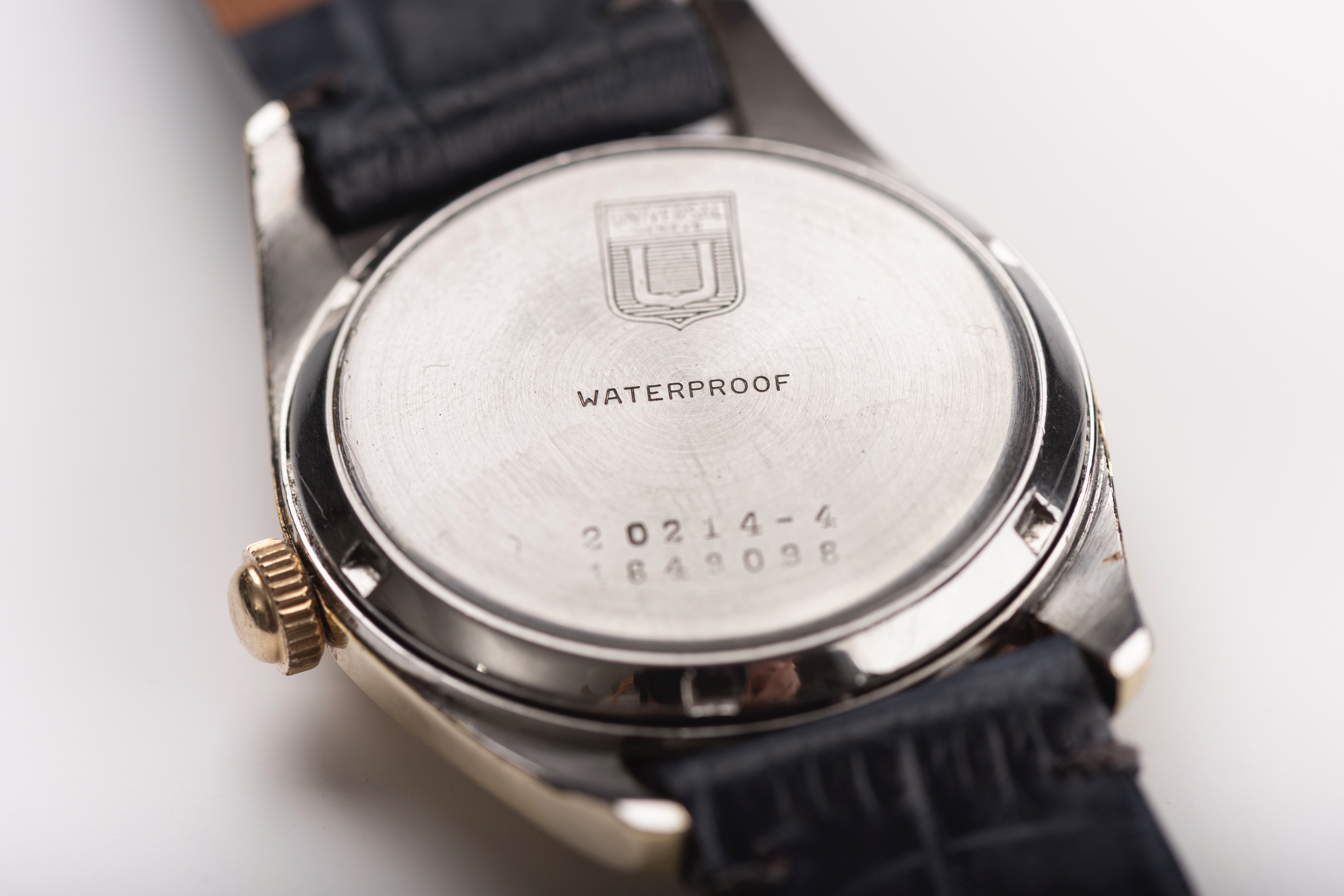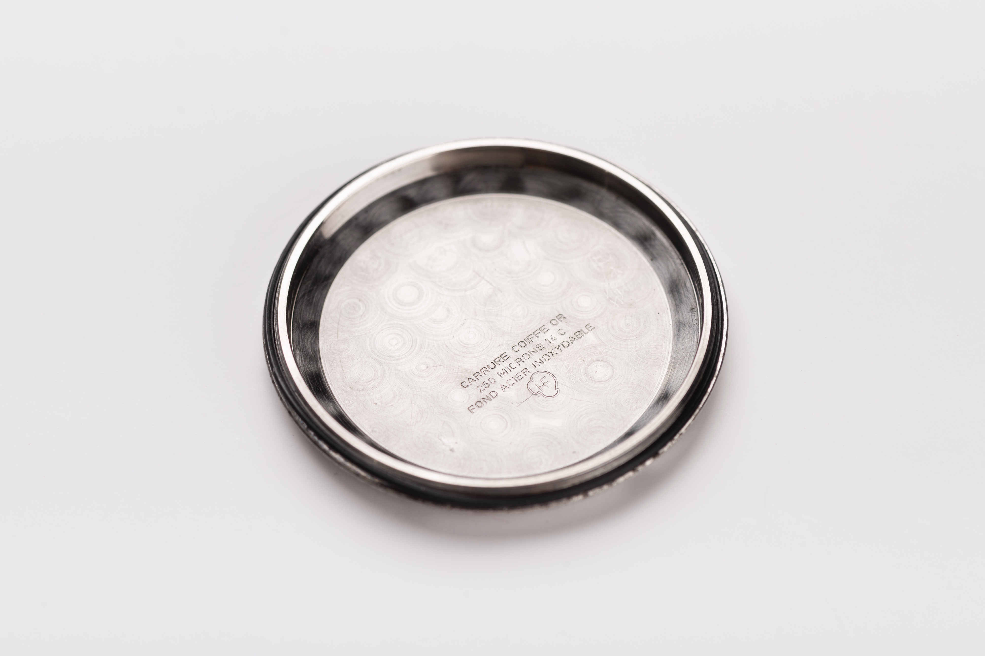 Case: 35.5mm. Gold capped. ‘HF’ stamped Huguenin Freres stainless steel case back. Bombe lugs. 19mm lug width. 6-key caseback, characteristic of a Polarouter. Logo engraved to case back as well as case reference and serial numbers. Unsigned crown.