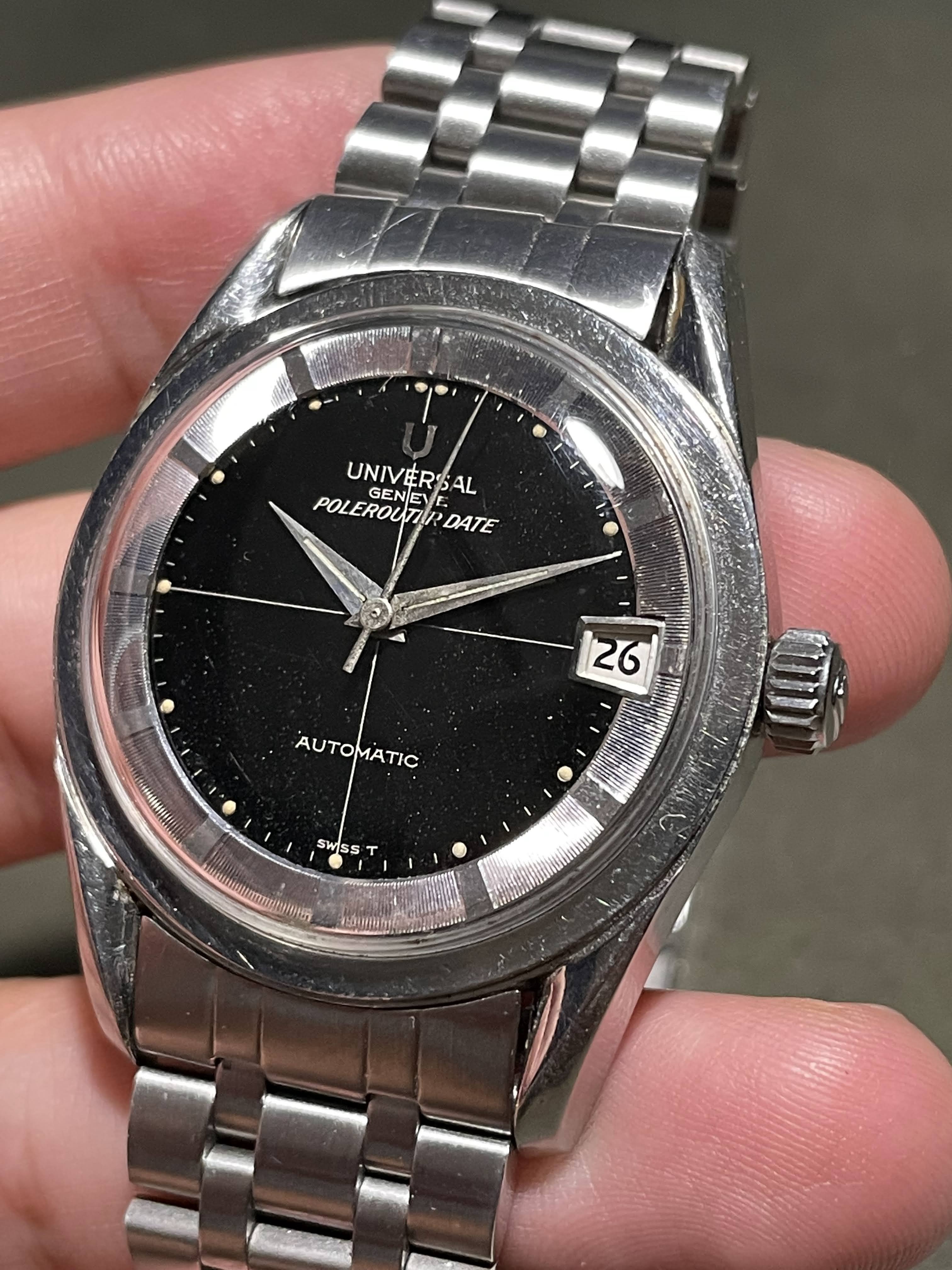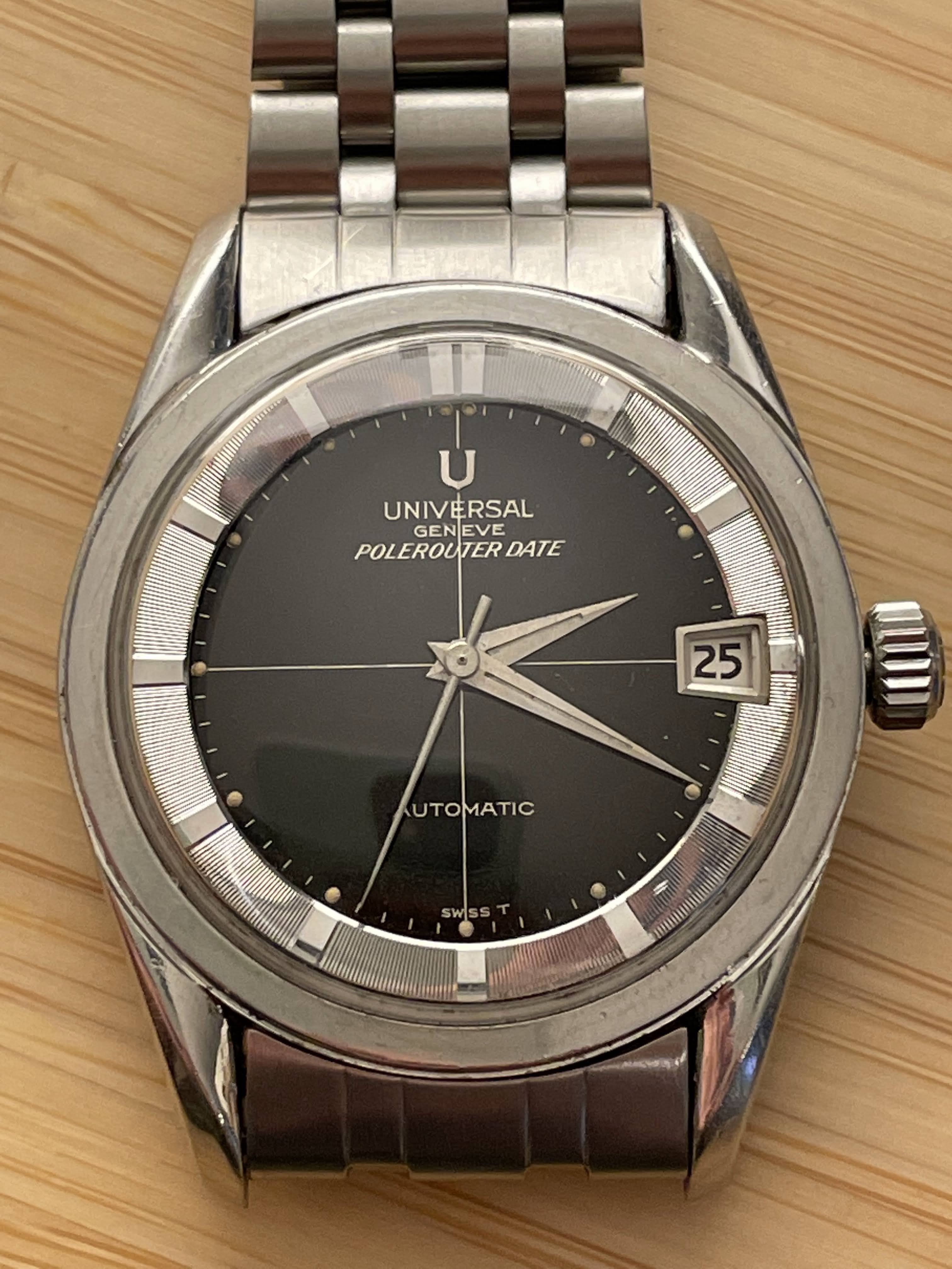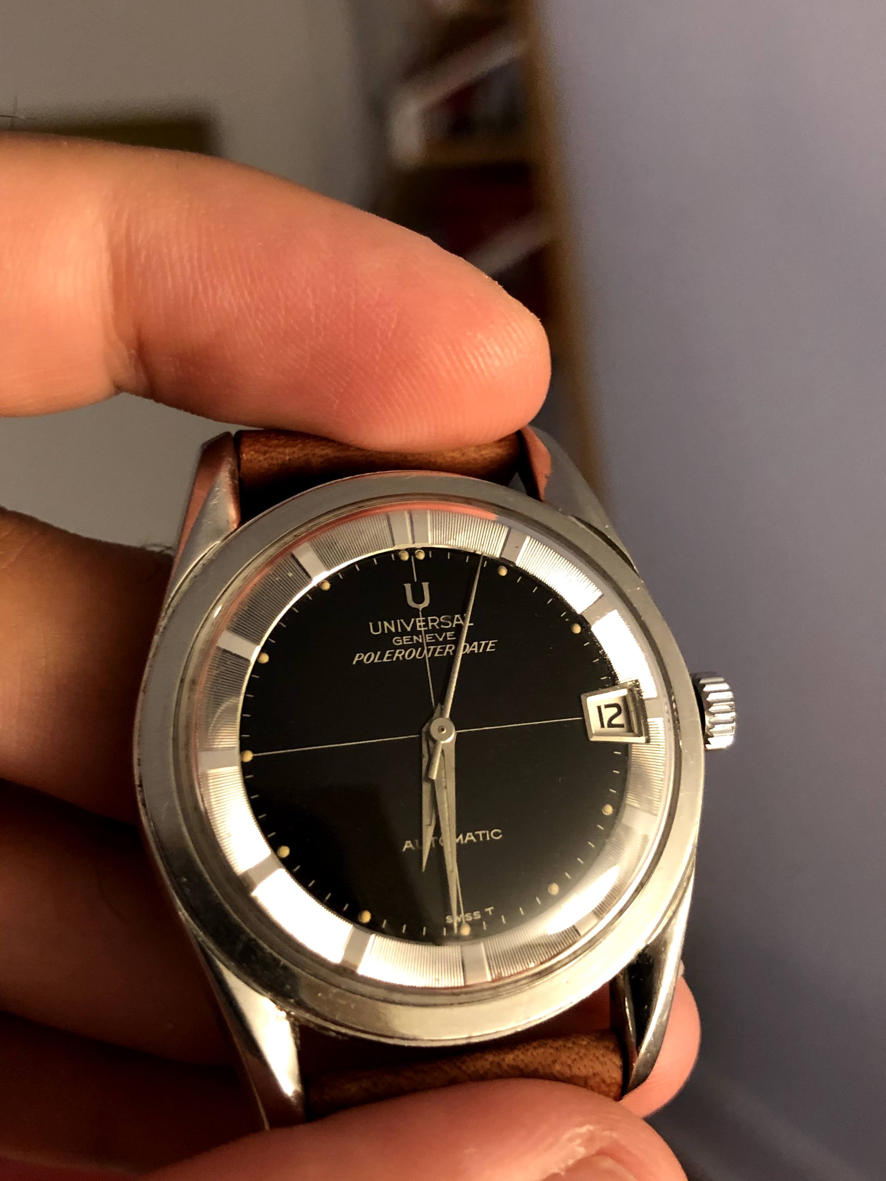 For sale is my Universal Geneve Polerouter 204612-2 with a very nice black dial. I am moving to Seattle and I figured my vintage watches won't get a lot of wrist time because of the rain, so I have to sadly say goodbye to a few of them.