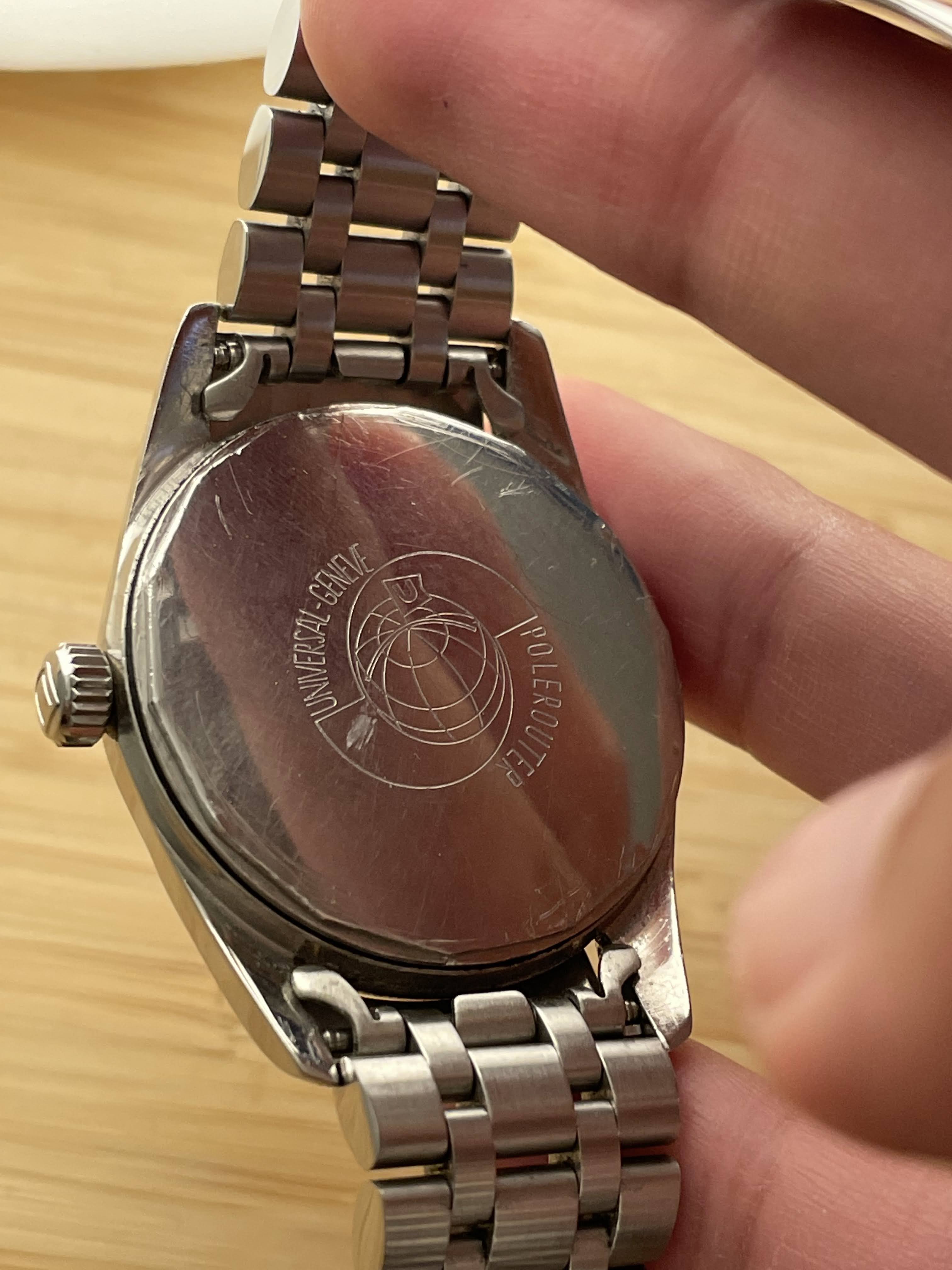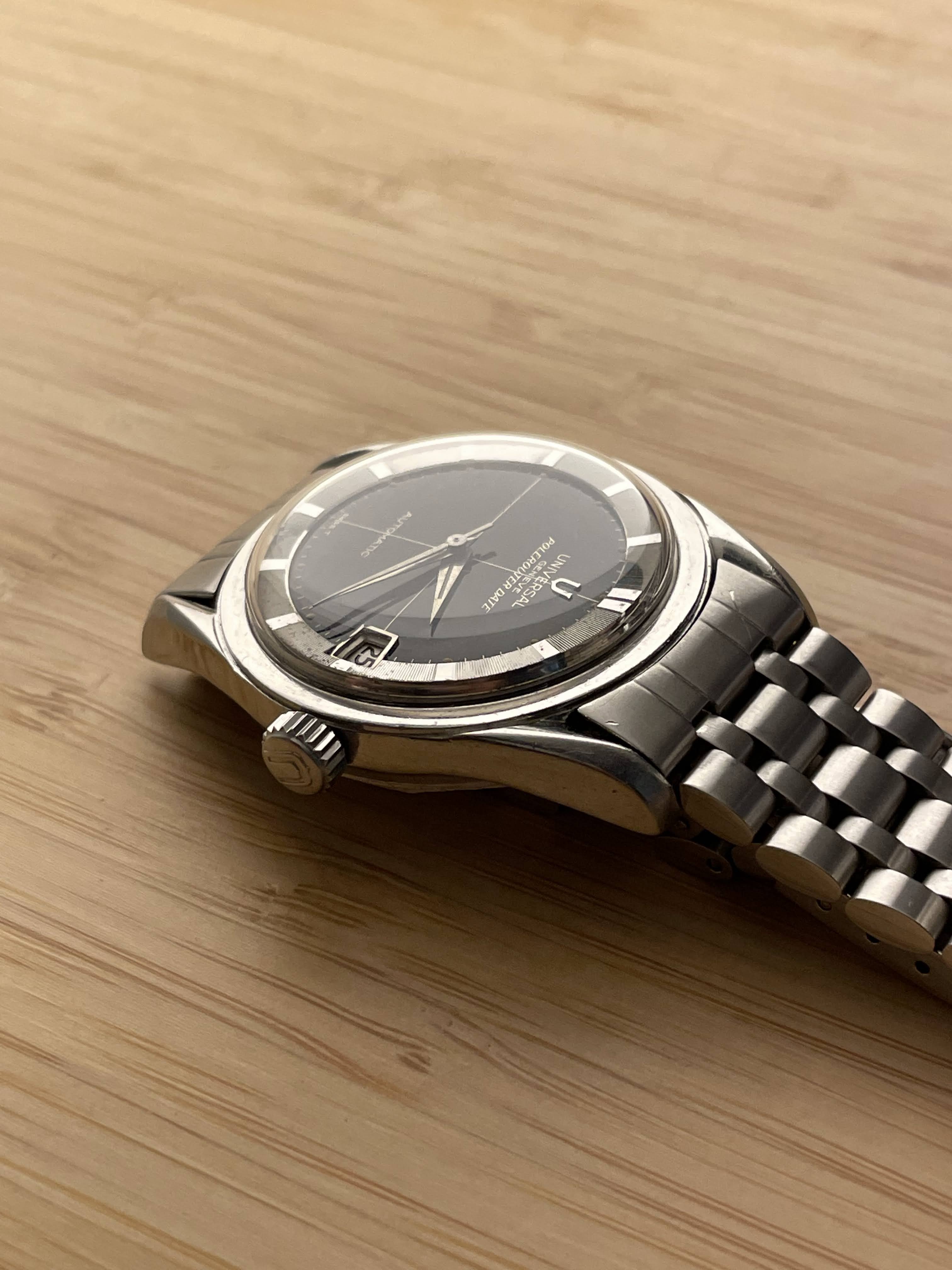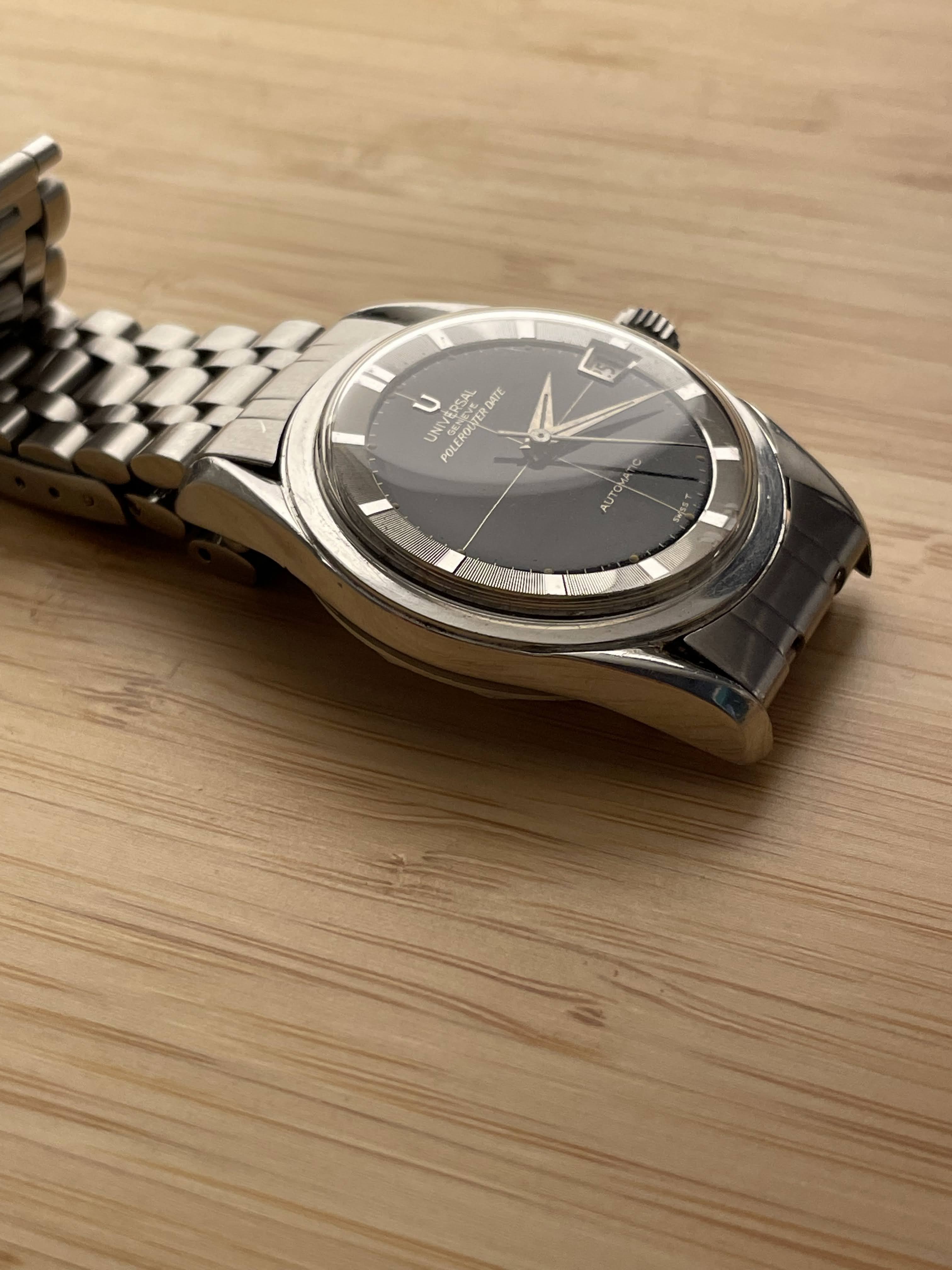 For sale is my Universal Geneve Polerouter 204612-2 with a very nice black dial. I am moving to Seattle and I figured my vintage watches won't get a lot of wrist time because of the rain, so I have to sadly say goodbye to a few of them.