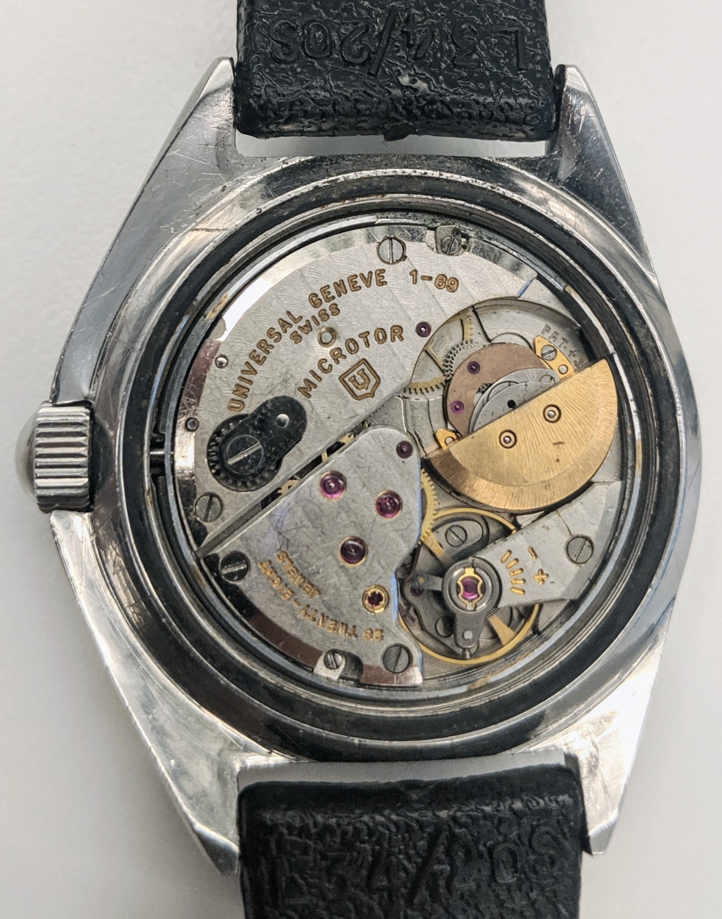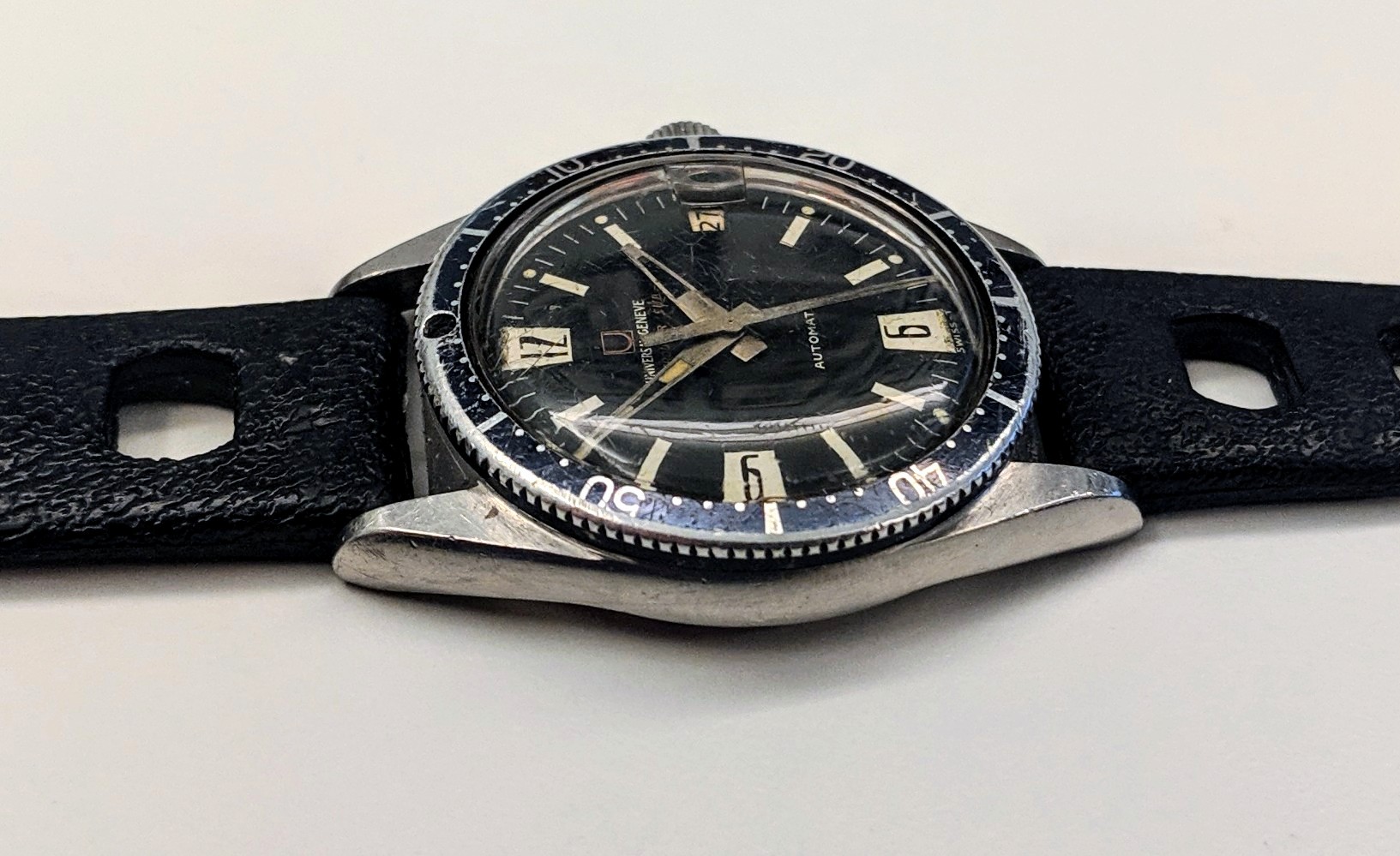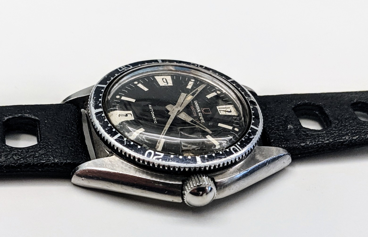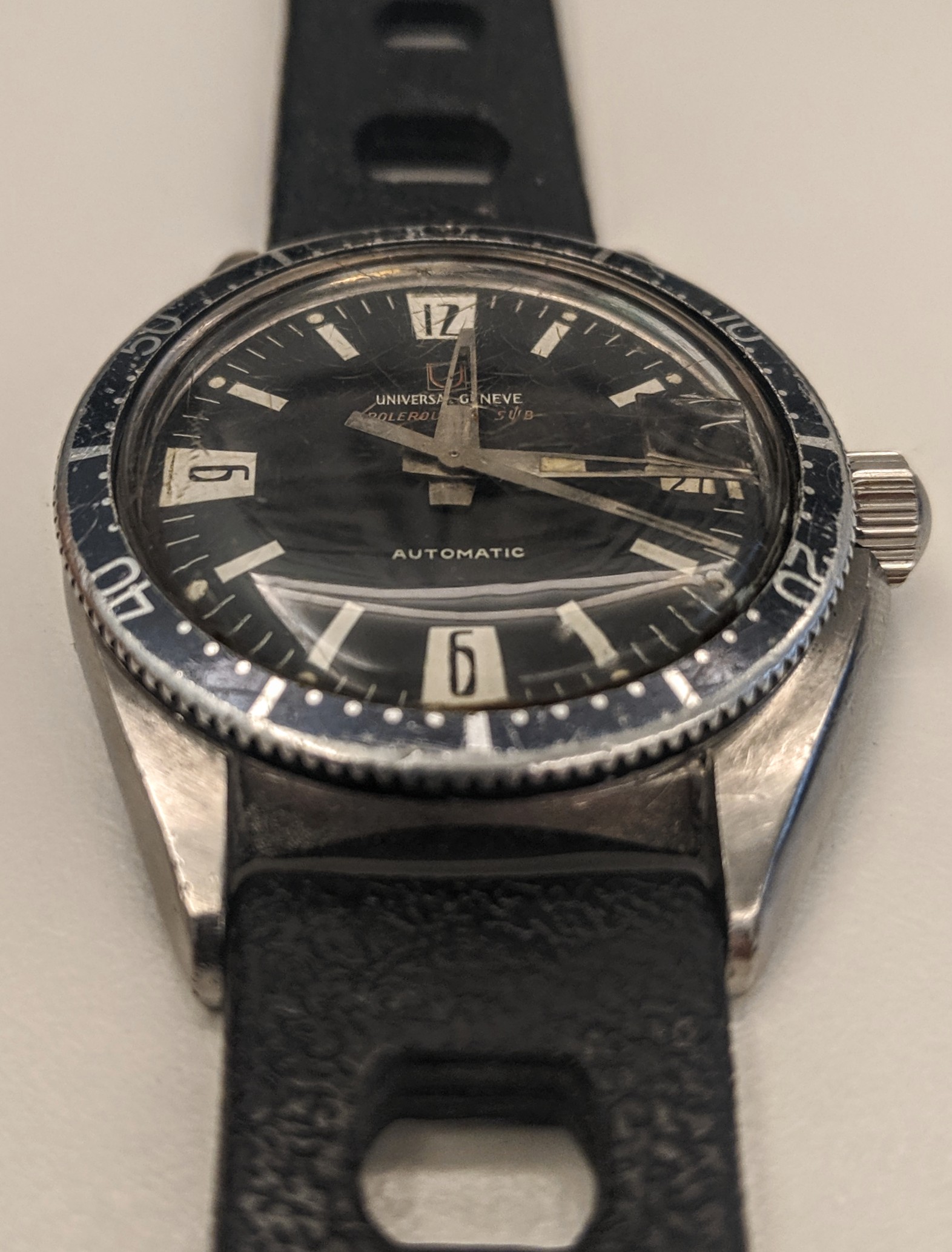 Case: Case is pretty sharp but watch was definitely worn. There appear to be original lapping marks on the top of the lugs, so it may not have been polished (but it is certainly not a mint piece). Bezel is original with wear on the edges, Has original crystal with trapezoidal magnifier. Crystal has crazing, but I wouldn't replace it as it looks great from most angles. Has an unsigned, but original-style crown. Crown screws into body firmly (but I would assume not watertight)