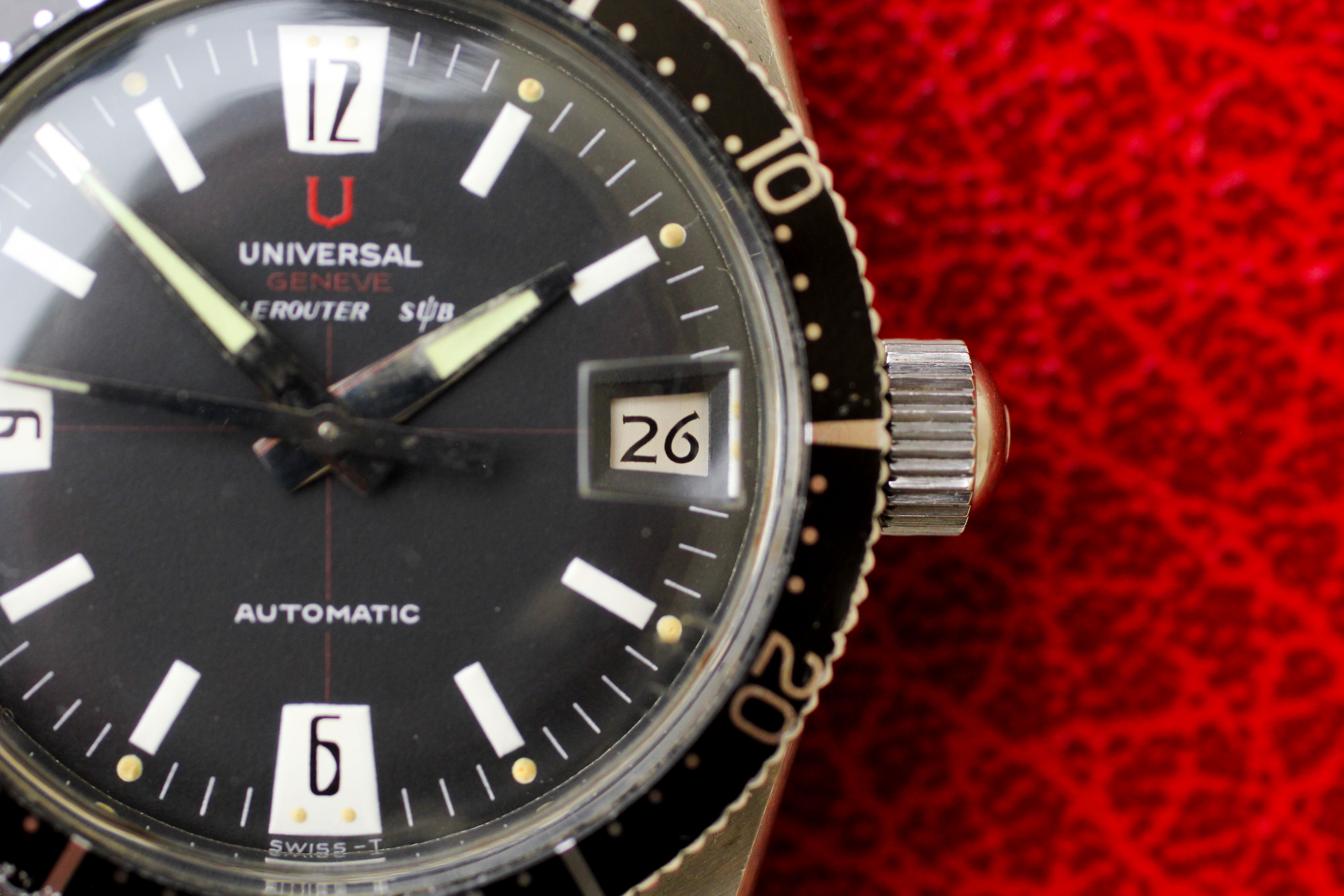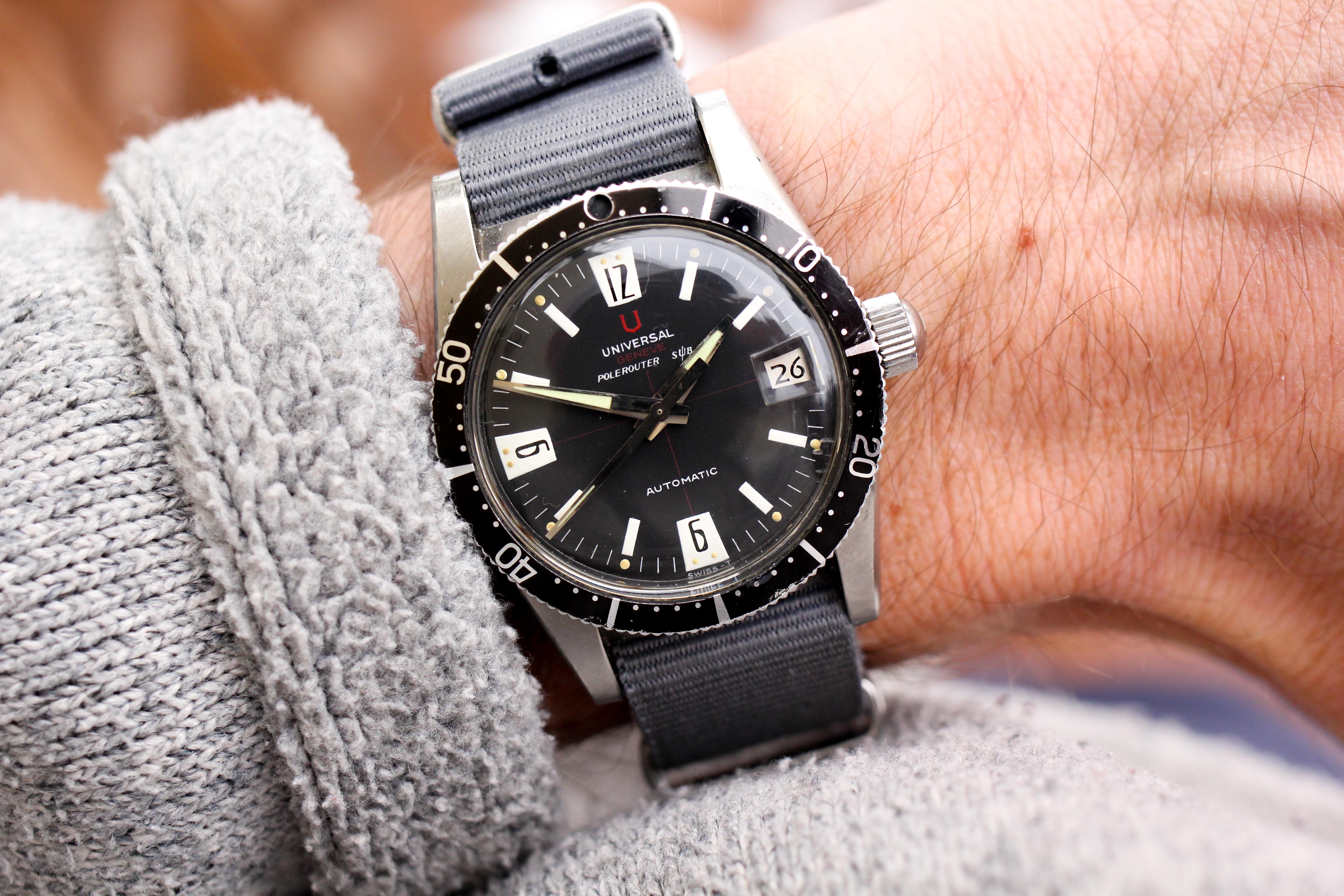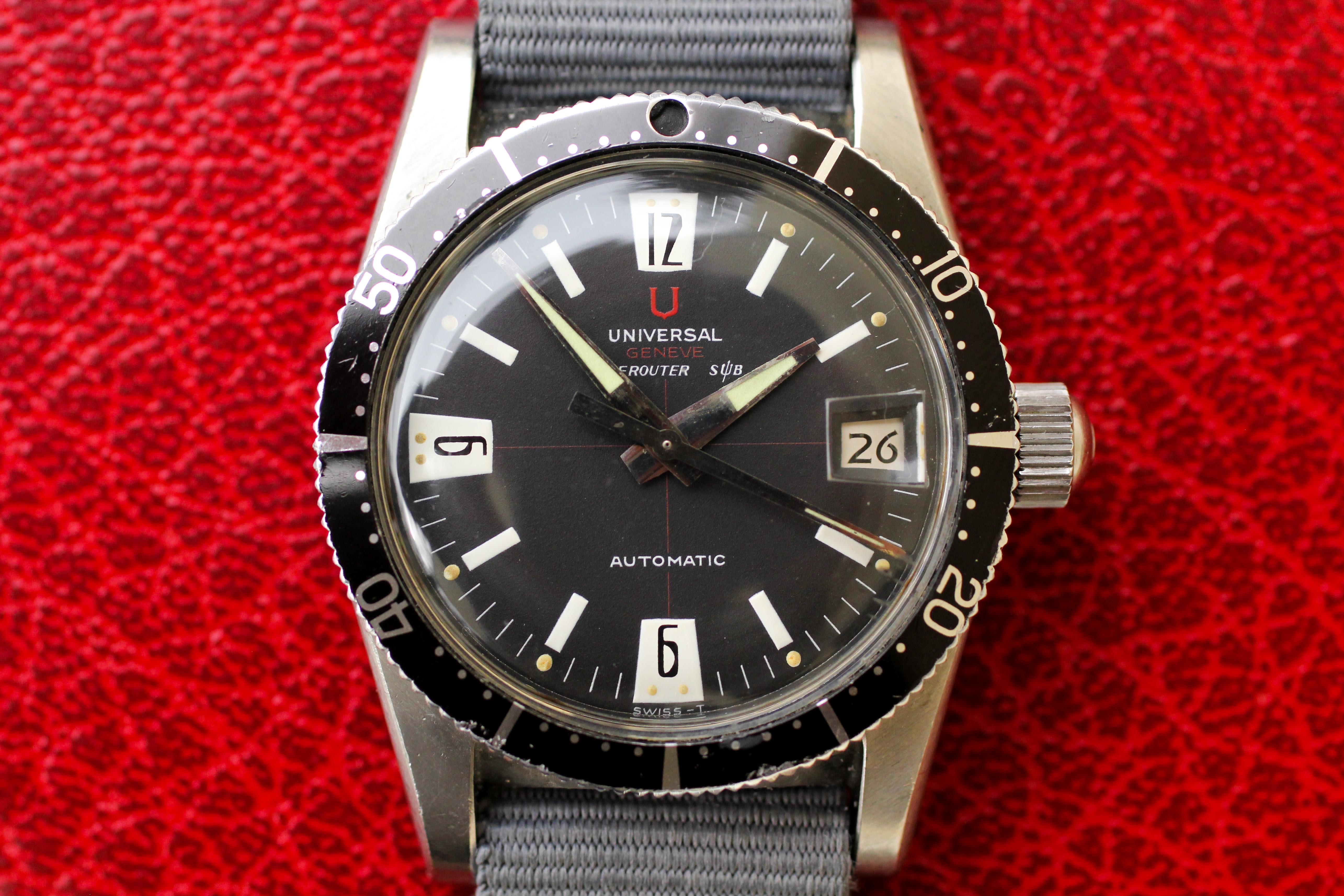 ·Up for sale is an uncommon "big crown" Universal Geneve Polerouter Sub. This example comes out of Mexico City and was owned by the same owner until sold to a jeweler earlier this year. It is preserved in excellent overall condition, and at 37mm (compared to 39mm for the asymmetrical-cased Polerouter Subs), it wears extremely well on the wrist. I think these boast some of the best bang for the buck, especially when you pop the caseback and look at the Microtor movement! See below for more: