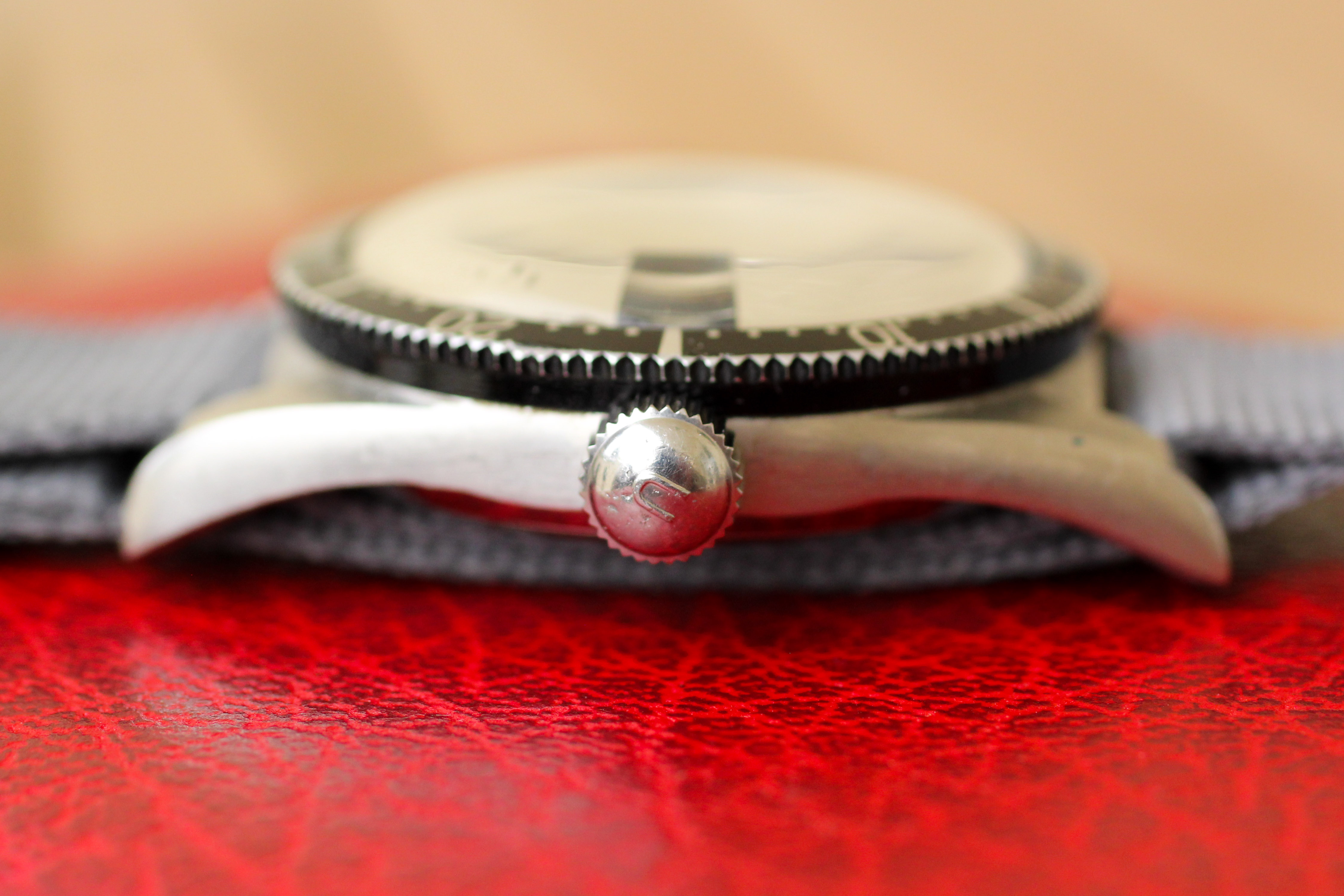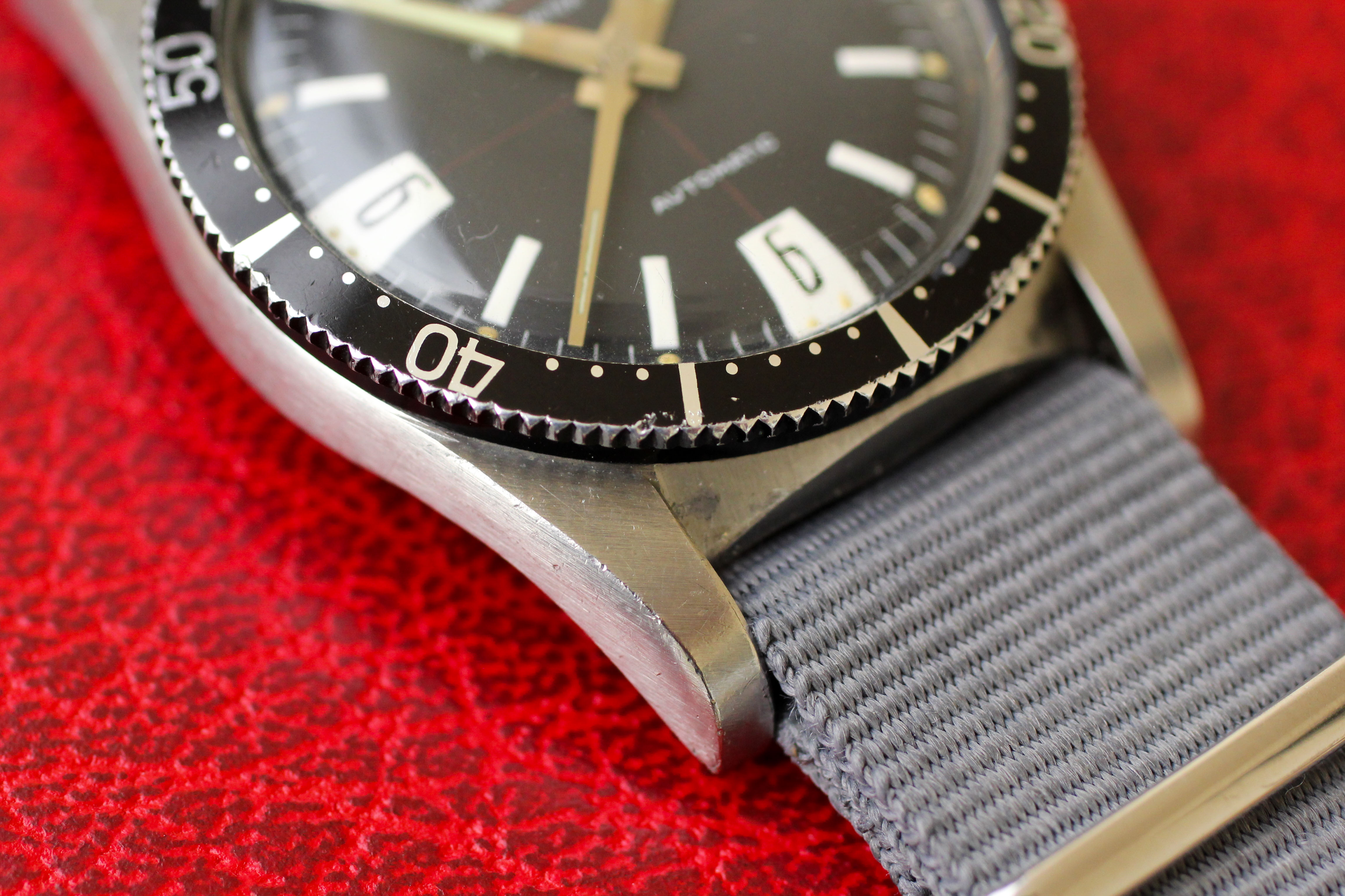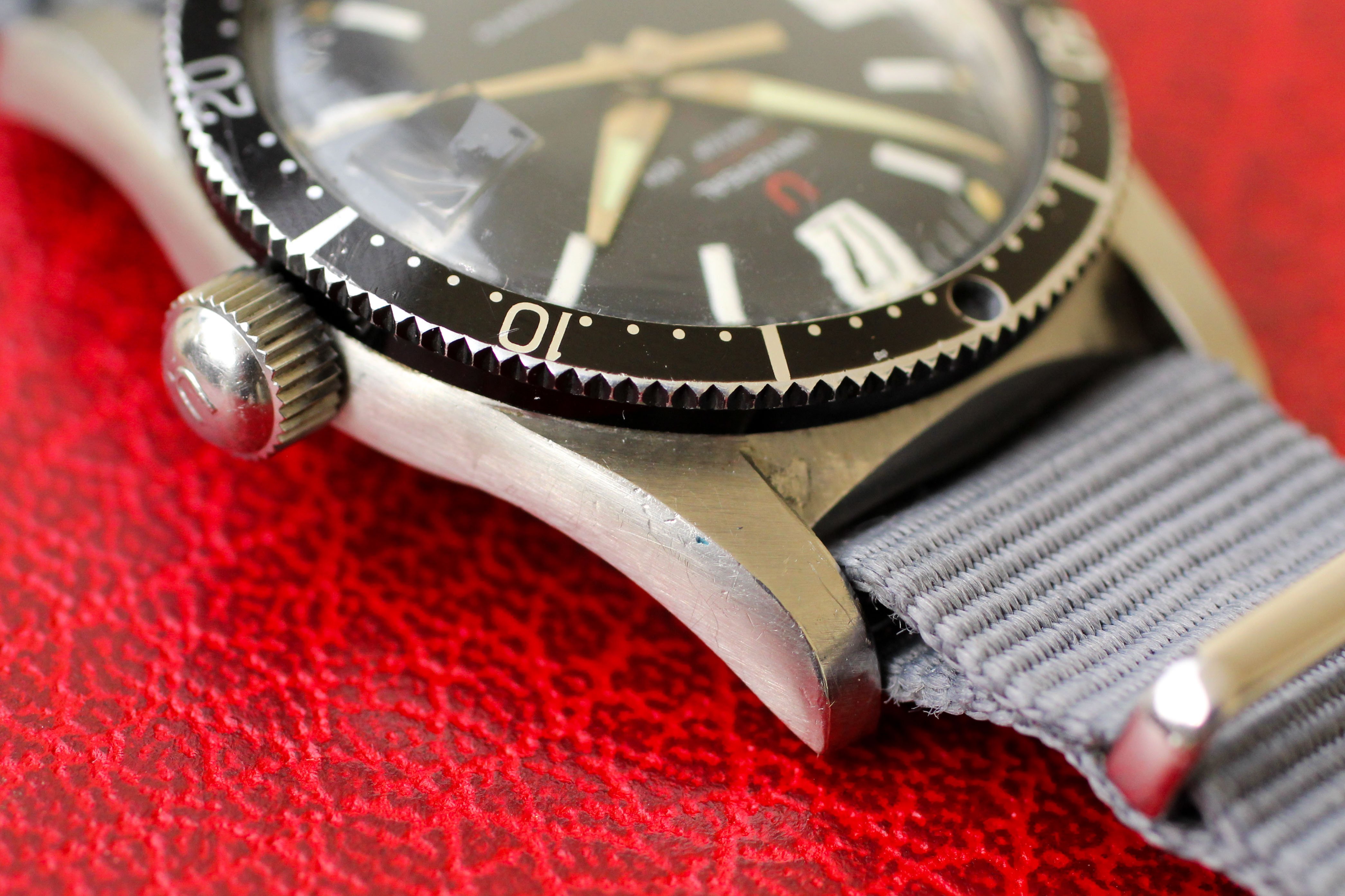 Dial: My favorite of the Polerouter Sub dials, this "art deco" dial is in excellent condition. All lume plots are intact and have aged to a creamy hue and there are no marks or blemishes (there are a few pieces of fuzz that are on the inside of the crystal and can be quickly removed by a watchmaker if so desired). Overall, a very well preserved example of a rare dial. I also love the "open 6" and "open 9" on the date wheel, which matches the aesthetic of the numerals on the dial.