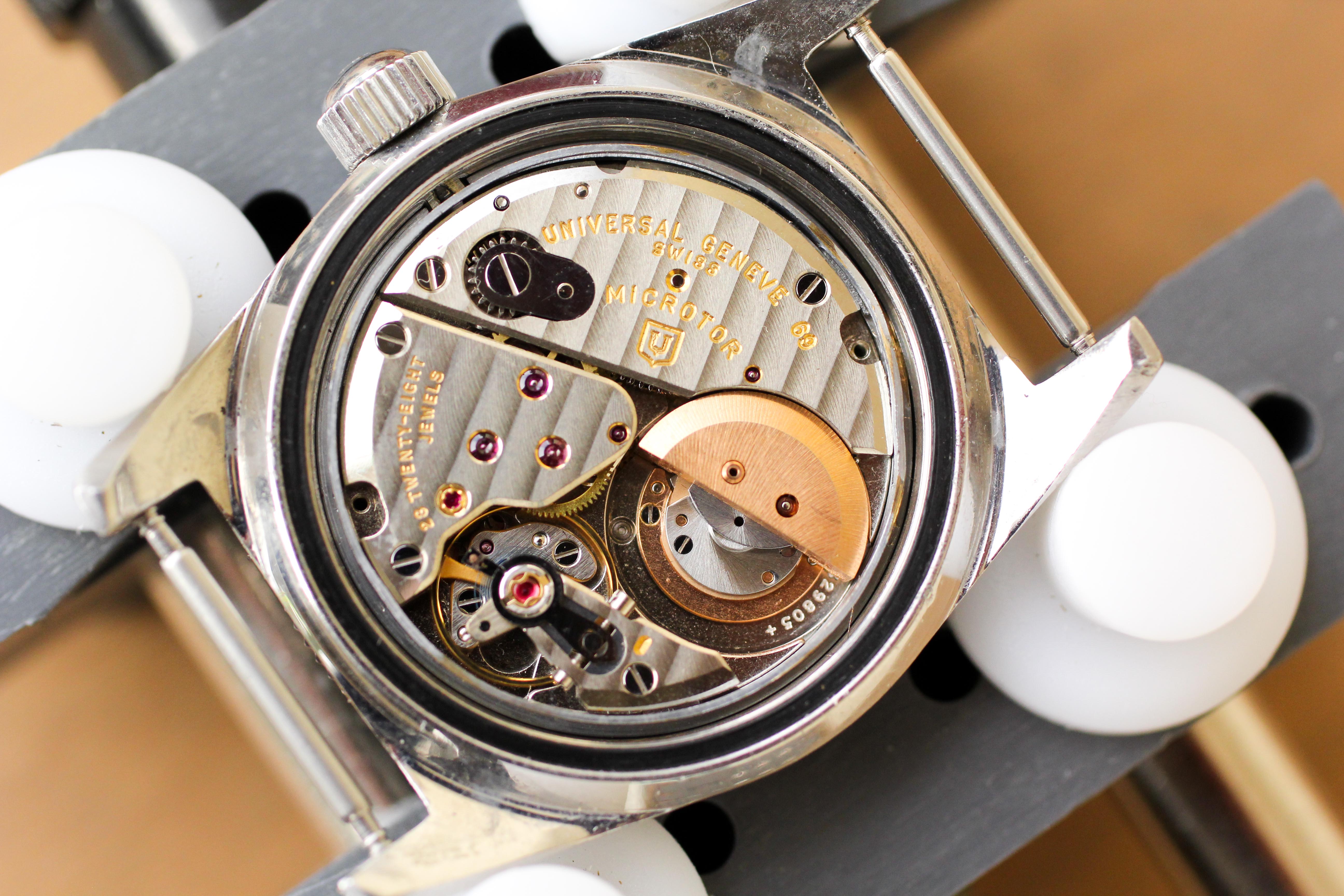 Movement / Functionality: The watch is powered by Universal Geneve's in-house "Microtor" automatic movement, which was the first micro rotor movement and displays nice finishing. This example's movement is very clean and in excellent condition. I do not formally time my watches, but over two days of wear, it has kept correct time and remained running. Winding, as I've had with a prior Polerouter Sub, is interesting, as the crown screws / unscrews and winds the movement while doing so, but will not freely wind (i.e. you cannot continuously wind it forwards without it screwing back in). I've owned two prior Polerouter Subs and one did this, while the other did not. At a minimum, it does not impact timekeeping or power reserve, it just takes a little see-saw action to get it fully wound! As always, the watch is sold as-is.