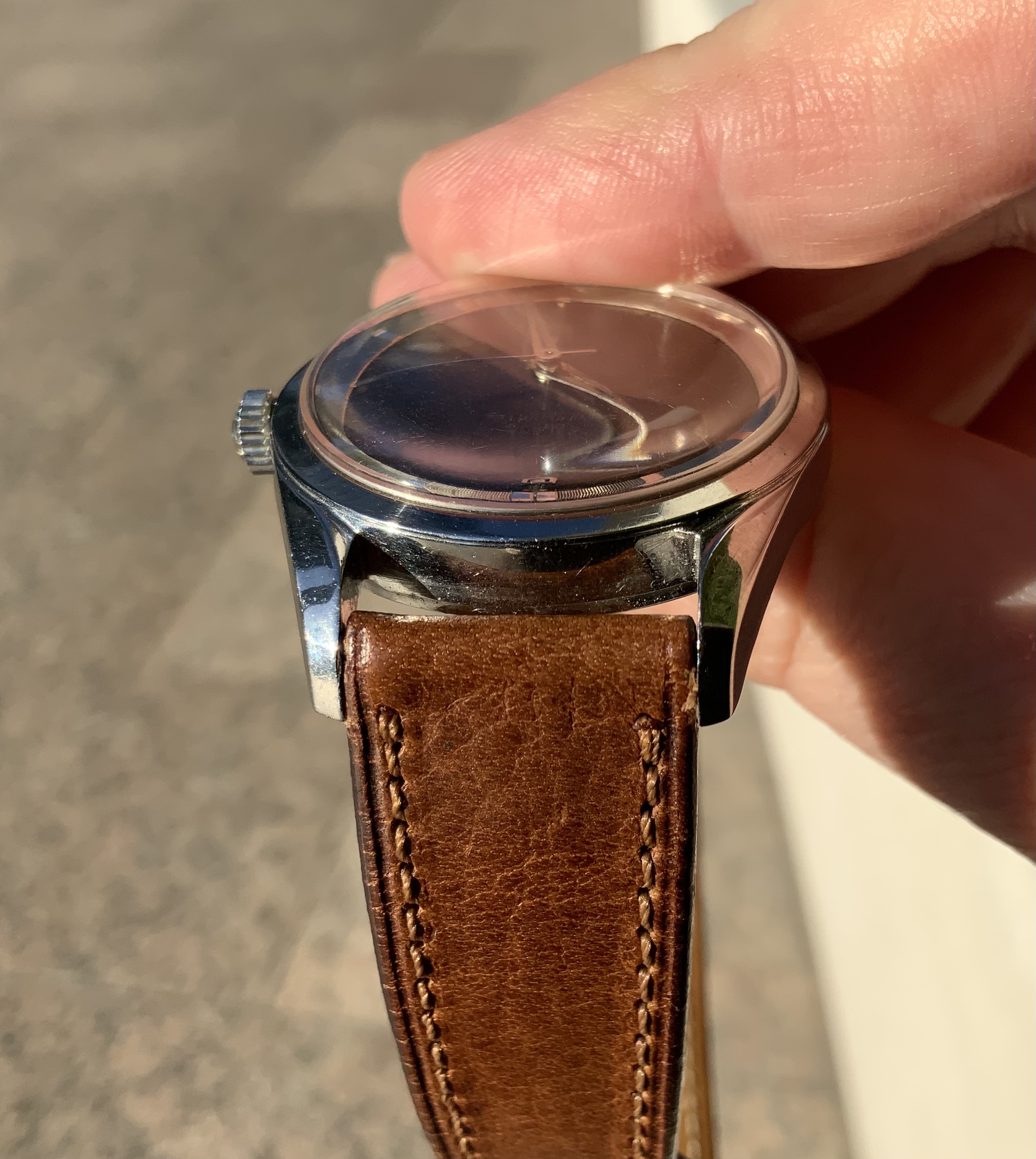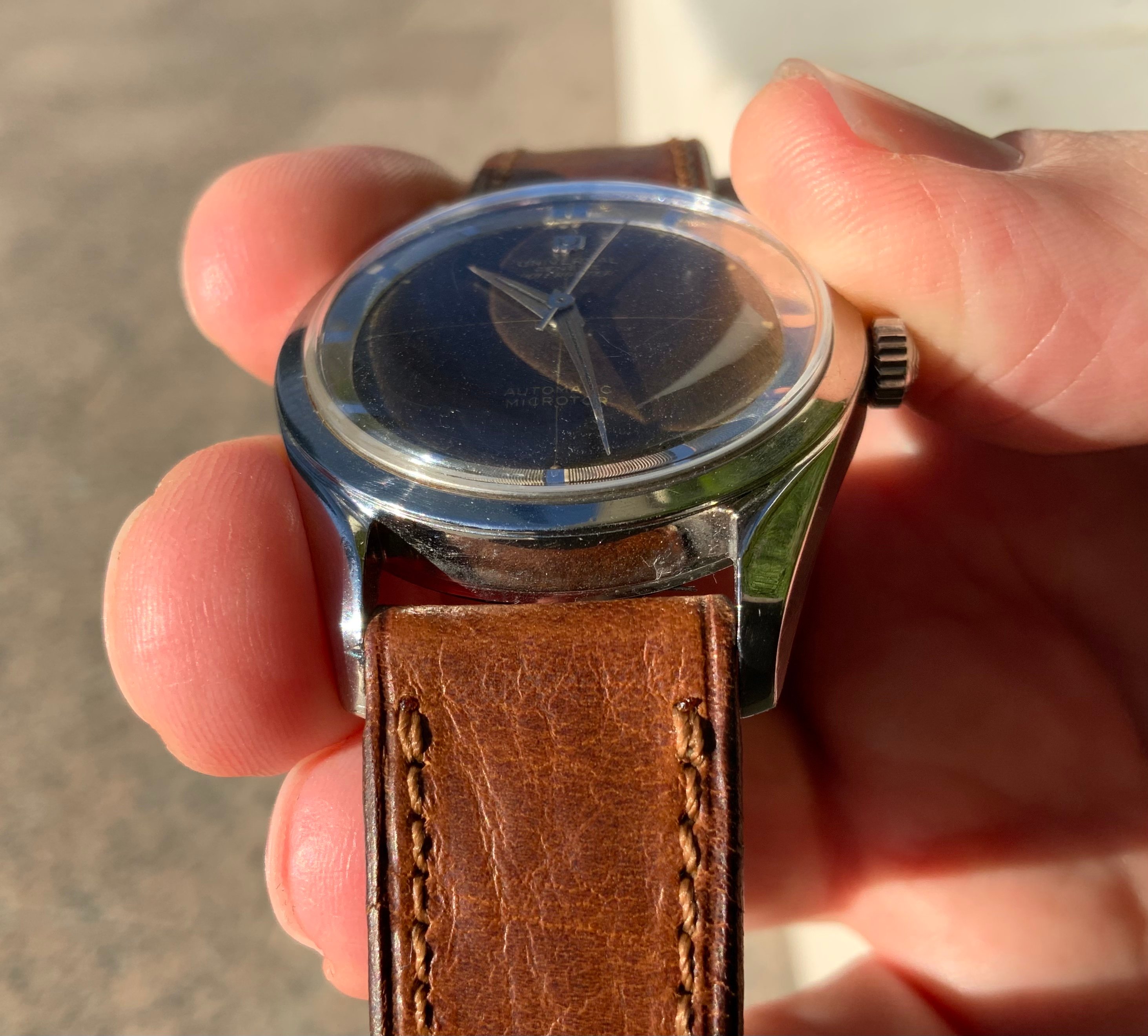34mm stainless steel case with cal. 215 running inside. The watch reference is visible on the case back but the serial number is missing, forever lost to time. However, these watches were produced by UG for a relatively short period between 1956-9 and this example is correct, bar its unsigned crystal. The domed signed crown is especially nice to see.