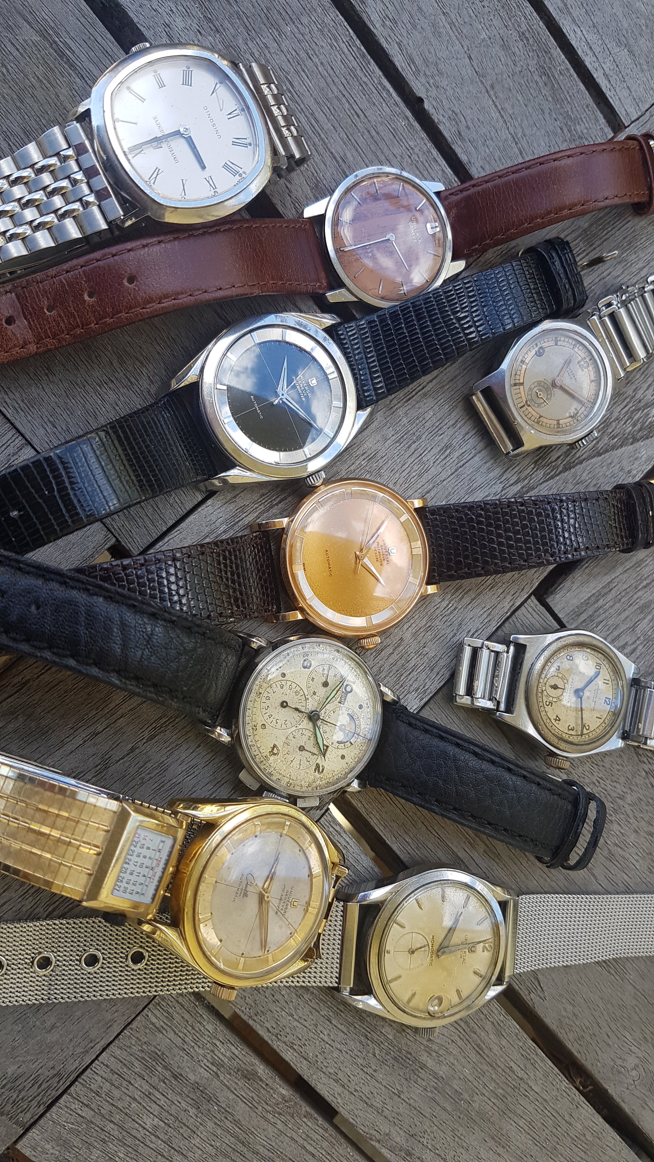 I like the idea, so here is a pic of my small ecclectic UG collection. Starting with two Colonial watches from 1935, followed by a Tri-compax from 1945, three Pola(e)routers (de Luxe) and an iconic Monodatic from mid 1950, an ultra thin wooden dial UG from the 1960s and ending with an Unisonic tuning fork watch from the 1970s.