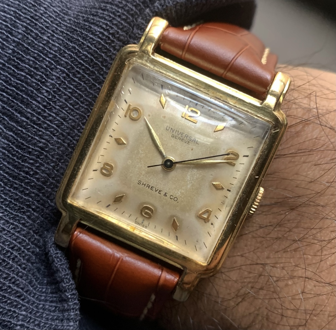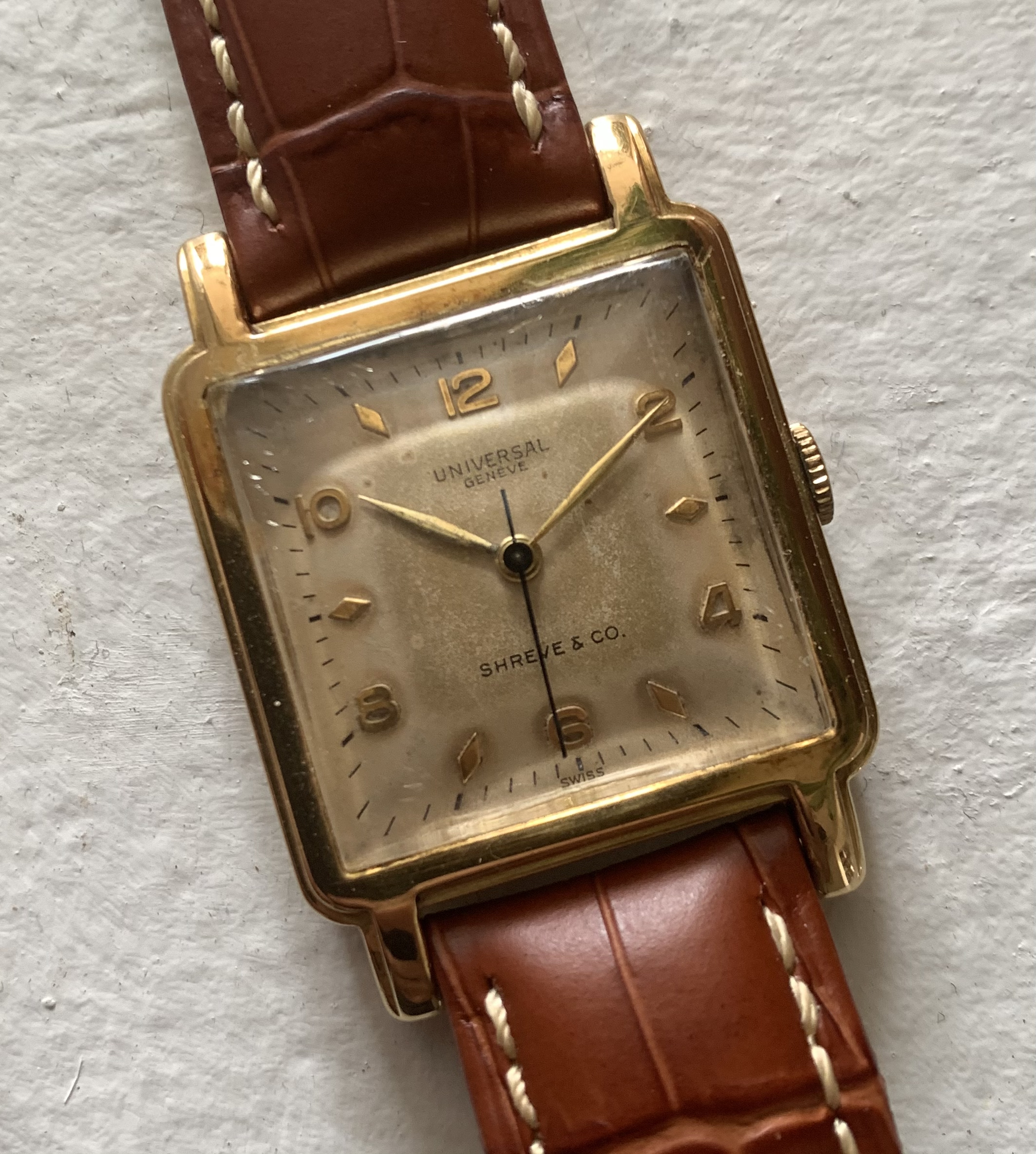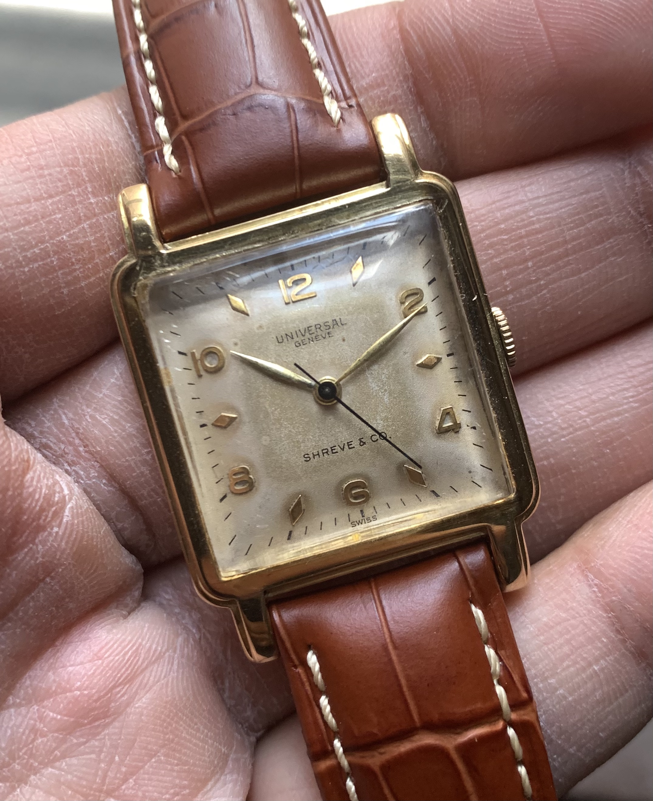 Offered here is a nice 14K Shreve & Co signed Universal Geneve. Full disclosure, I am selling this watch on behalf of a friend (private collector) -- it is in my possession and the whole sale will be managed by me.