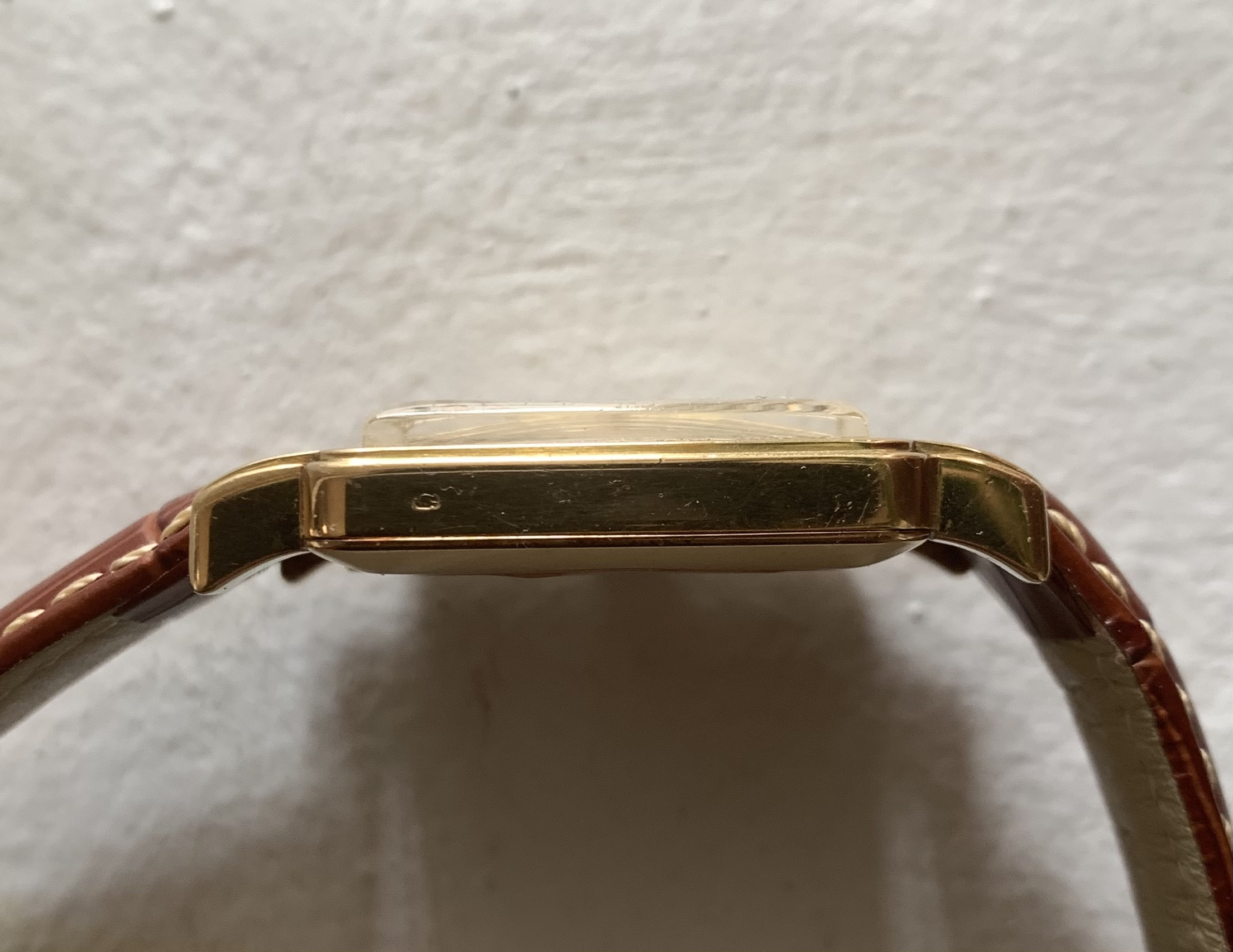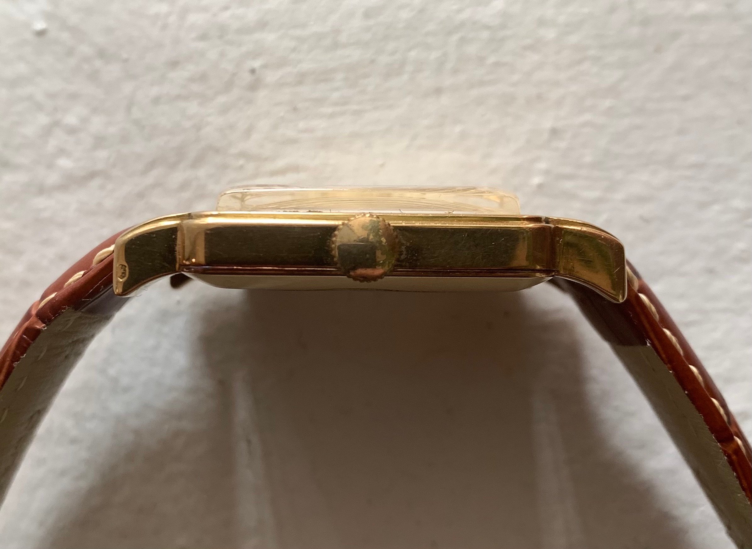 The dial has developed a relatively consistent patina throughout. The stepped case is in fairly good condition with no major scratches or dings to report. There is what also appears to be an import mark on the left side of the case.