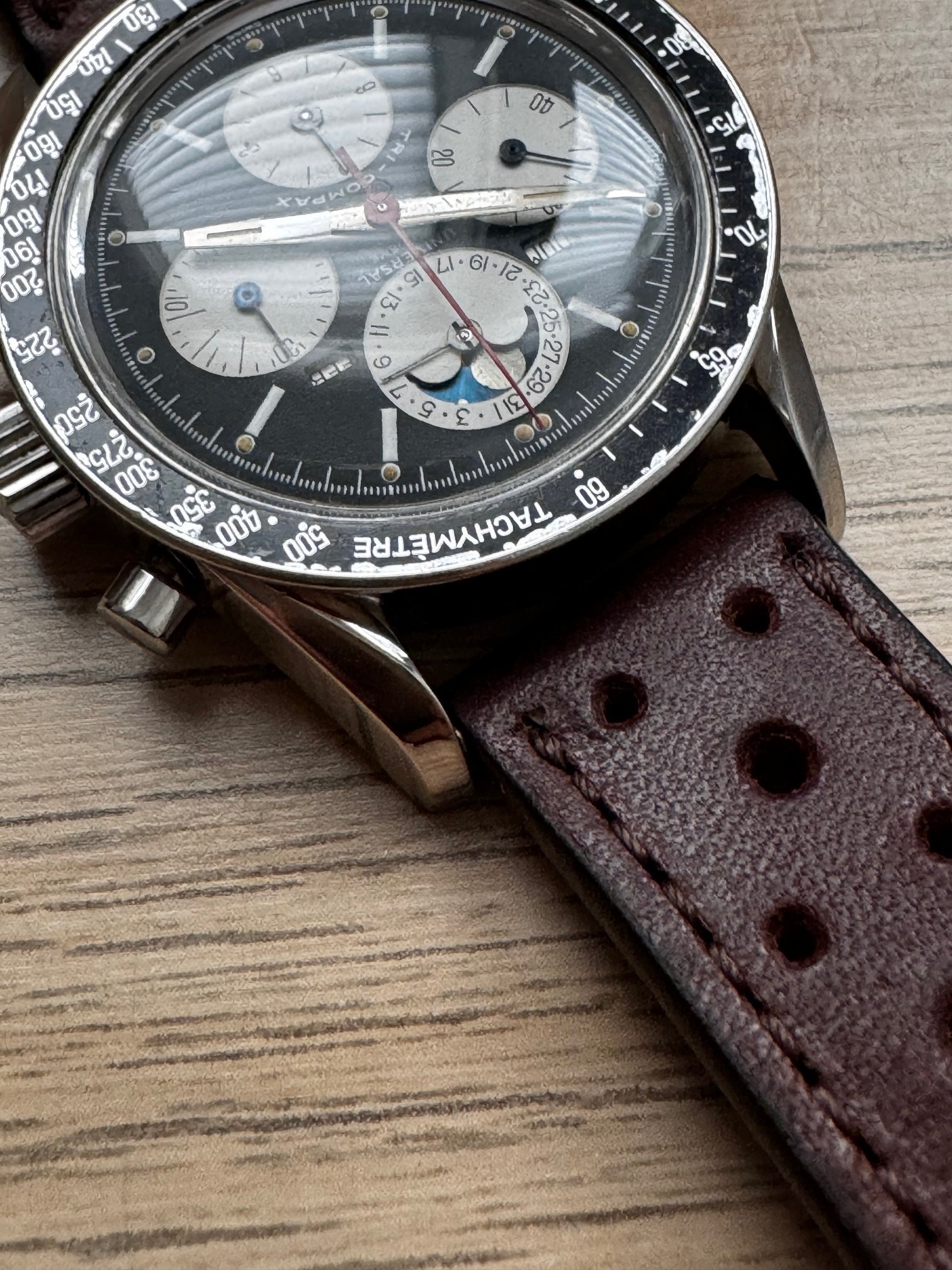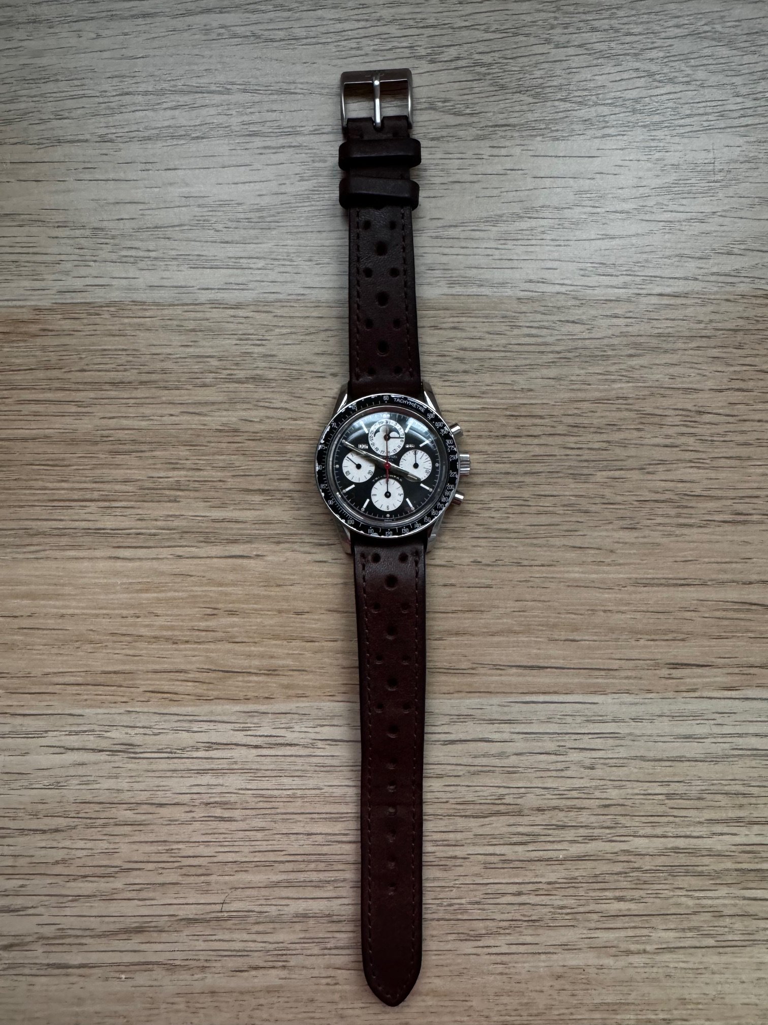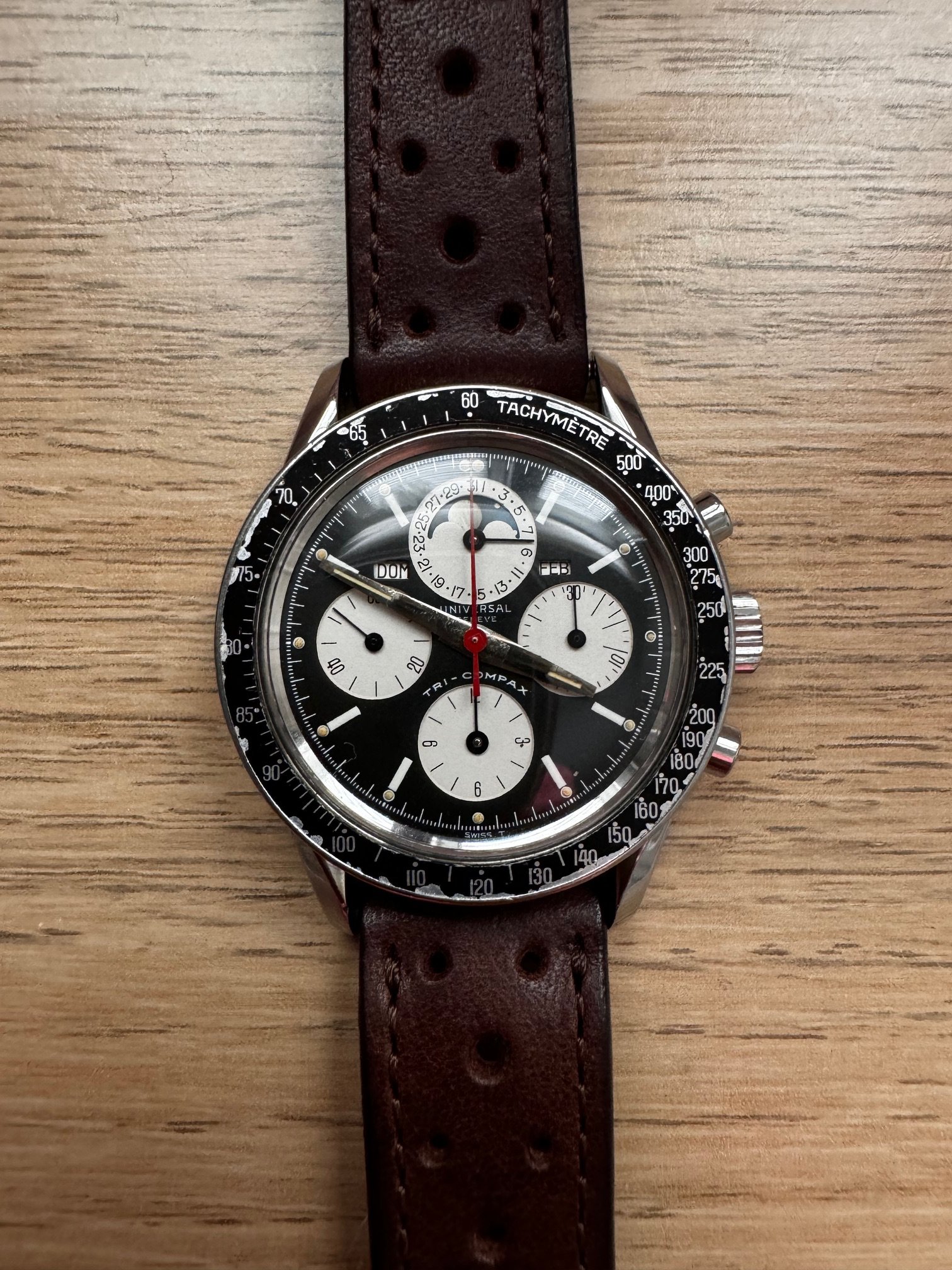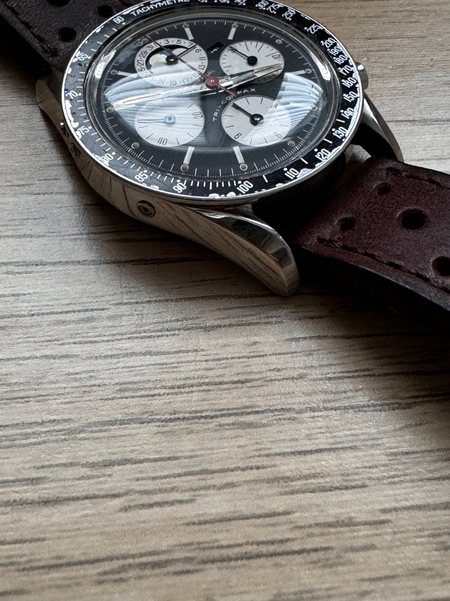 I bought this in 2014. She was serviced on 2015. It runs and keeps time OK, chronograph runs well but its not very precise when reseting, sometimes flies back to 12 sharp, sometimes stops a bit before. All parts, as far as I know, are fully original, including one of the best evil dials I have ever seen of this reference. Dial is, to be short, perfect: full creamy dots inside its white circles, bright moon disk, and creamy and fully textured subdials. Hands are original, with some wear on hour and minutes hands. All small hands are perfect under the loupe. Case is in very good vintage condition, some scratches here and there, none of them important or deep. Crystal has no chips or scratches and caseback has no important marks. Month and weekday are in Spanish (lucky me, as a Spaniard) and also in good condition. Bezel, as you can see in the pics, is used and has some damage. In my opinion, it is OK with a vintage watch and I have decided to keep it as it is.