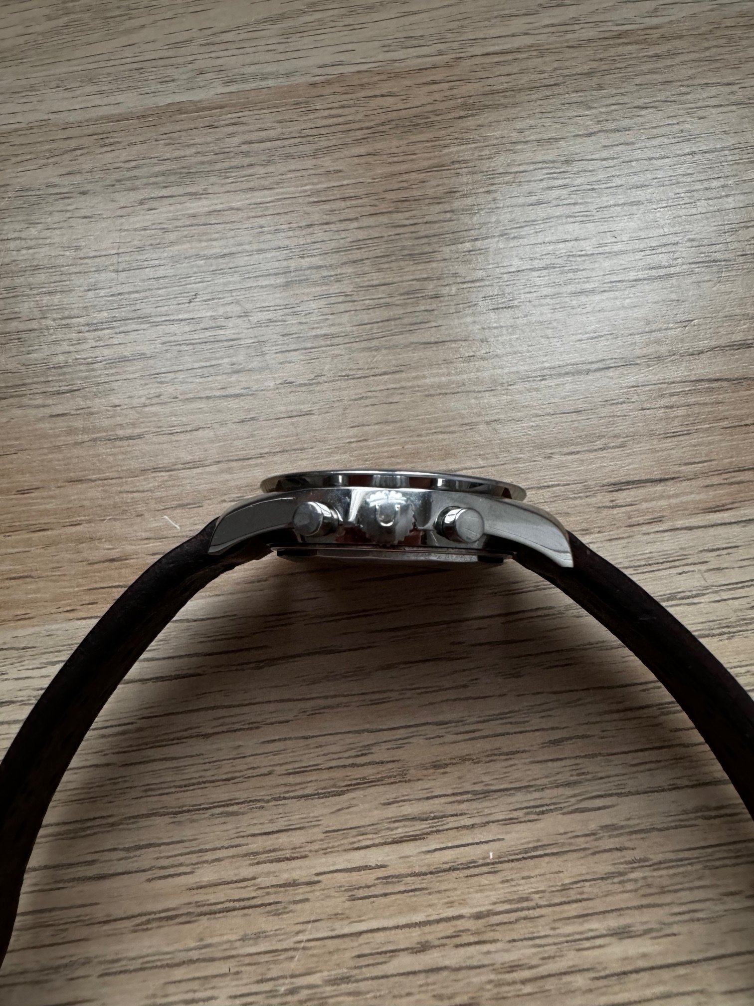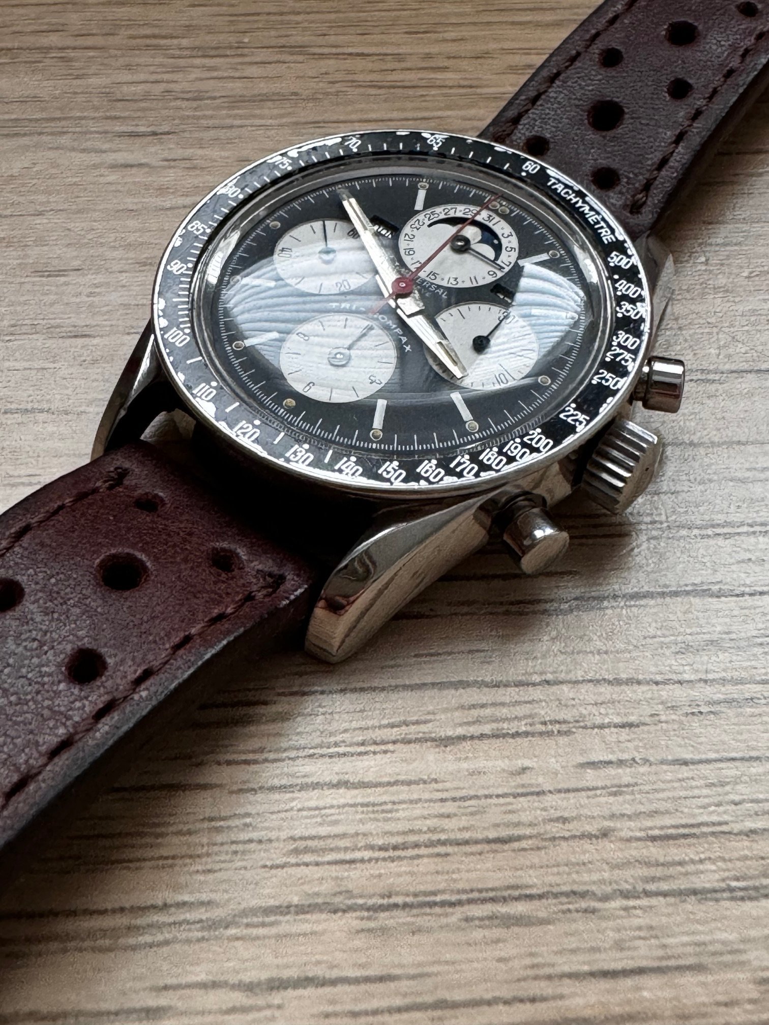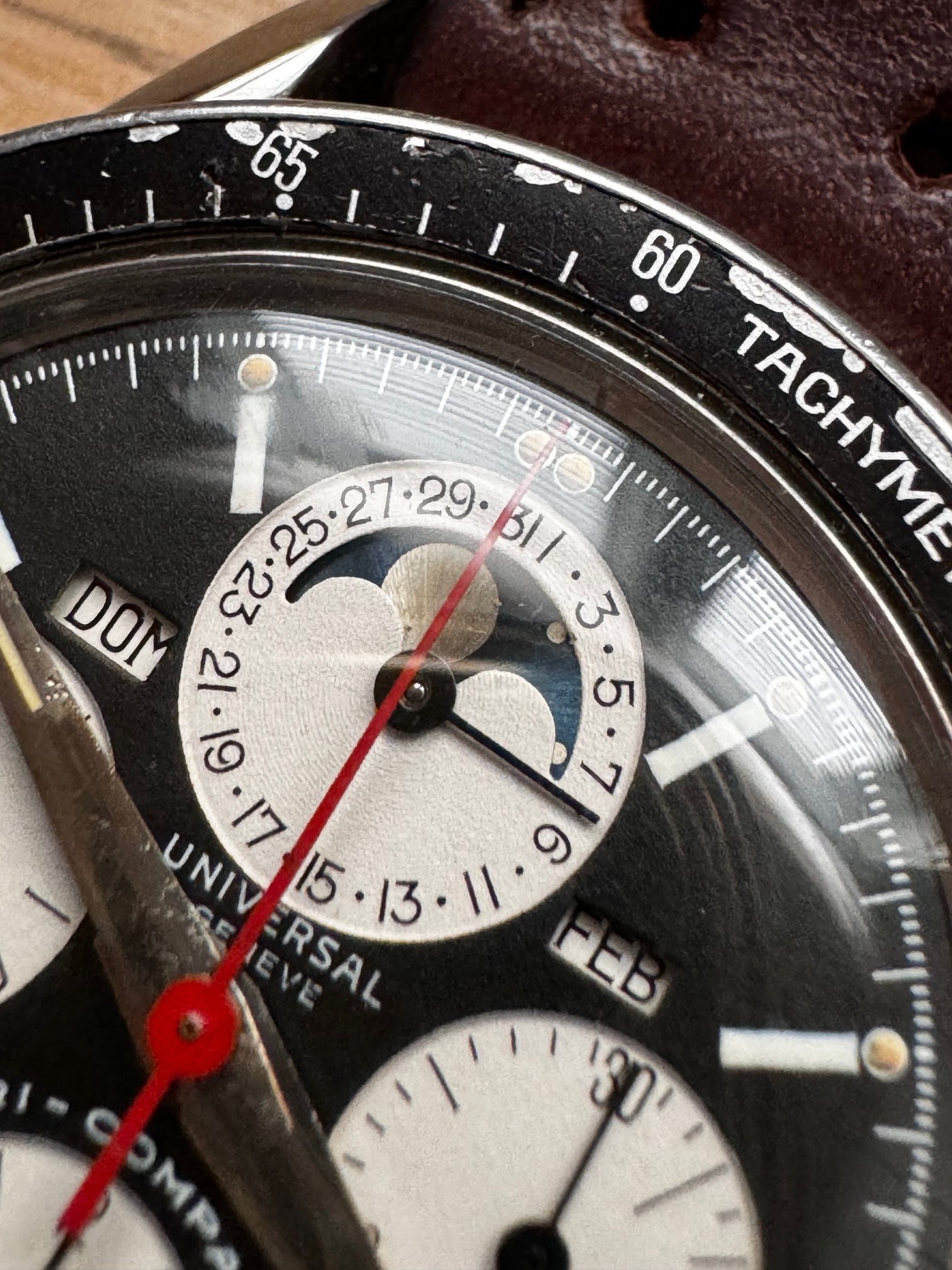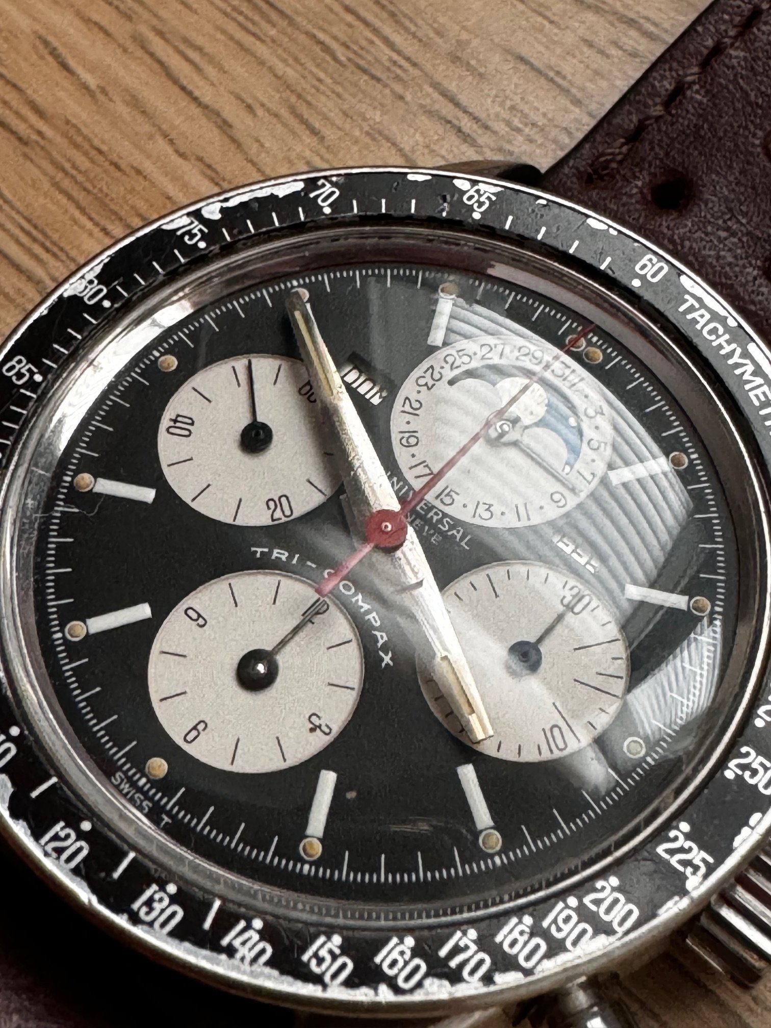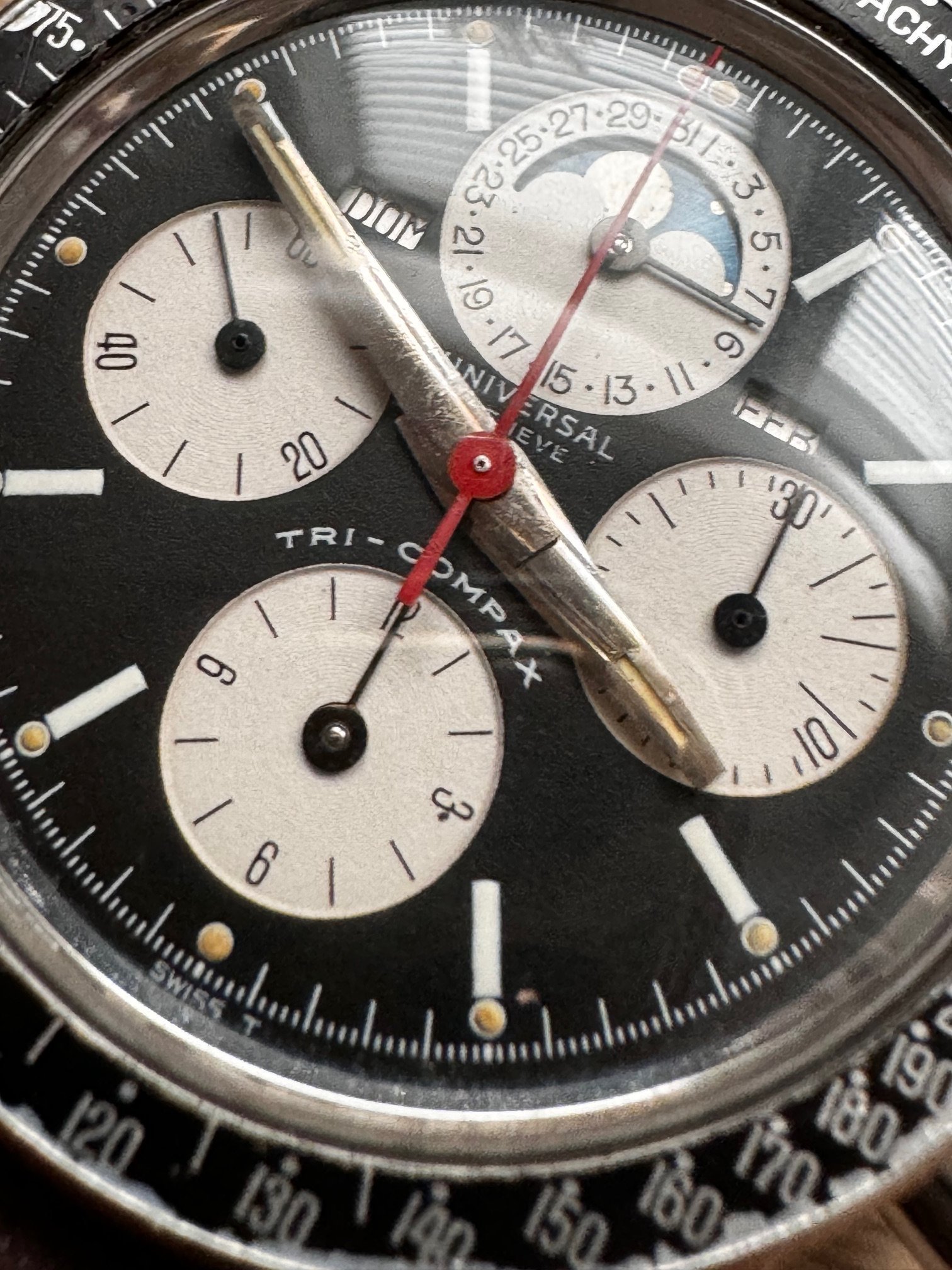 I bought this in 2014. She was serviced on 2015. It runs and keeps time OK, chronograph runs well but its not very precise when reseting, sometimes flies back to 12 sharp, sometimes stops a bit before. All parts, as far as I know, are fully original, including one of the best evil dials I have ever seen of this reference. Dial is, to be short, perfect: full creamy dots inside its white circles, bright moon disk, and creamy and fully textured subdials. Hands are original, with some wear on hour and minutes hands. All small hands are perfect under the loupe. Case is in very good vintage condition, some scratches here and there, none of them important or deep. Crystal has no chips or scratches and caseback has no important marks. Month and weekday are in Spanish (lucky me, as a Spaniard) and also in good condition. Bezel, as you can see in the pics, is used and has some damage. In my opinion, it is OK with a vintage watch and I have decided to keep it as it is.