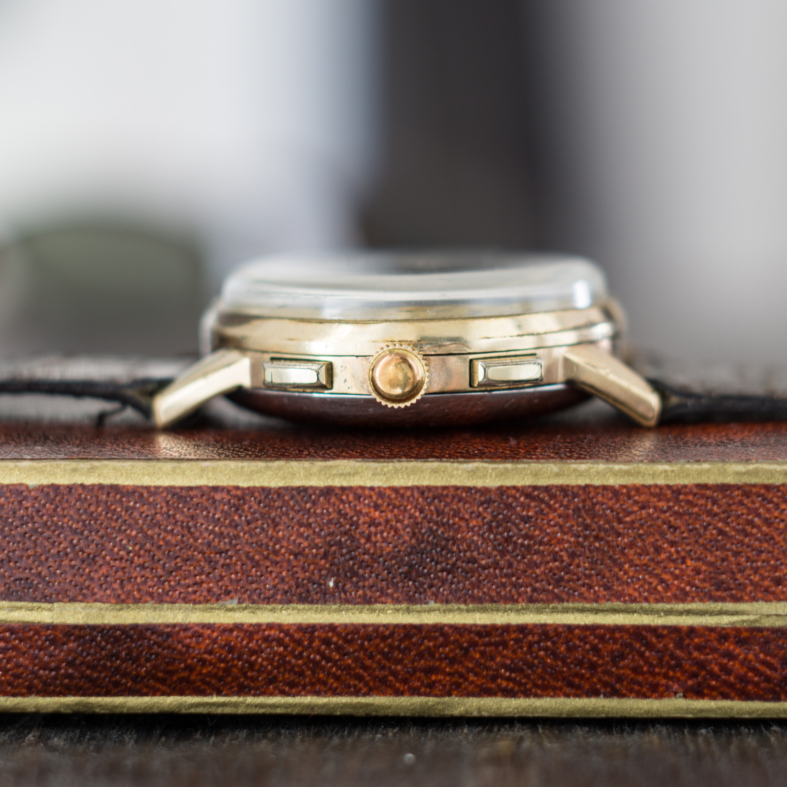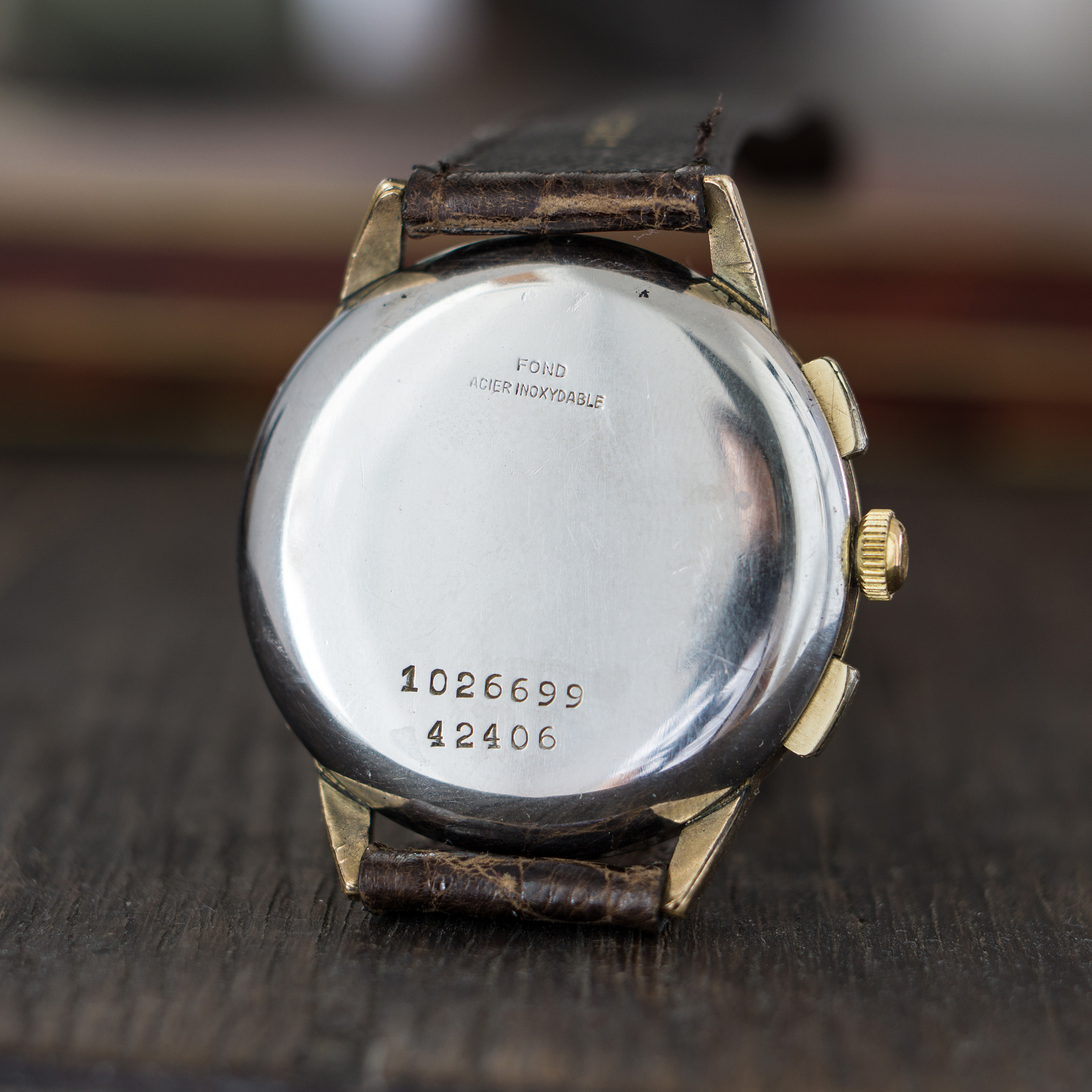 The watch has the reference 42406 which makes it one of the bigger Tri-Compax watches with 36.6mm size. The case is gold plated, the left bottom lug is a bit bended. The movement, a UG Cal. 287, is running strong (+45sec/day, 348° amplitude, 0.4ms beat error) but service history is unkown. All functions given, allthough the small pusher for the date is not working on every push. No idea whats normal for that movement.