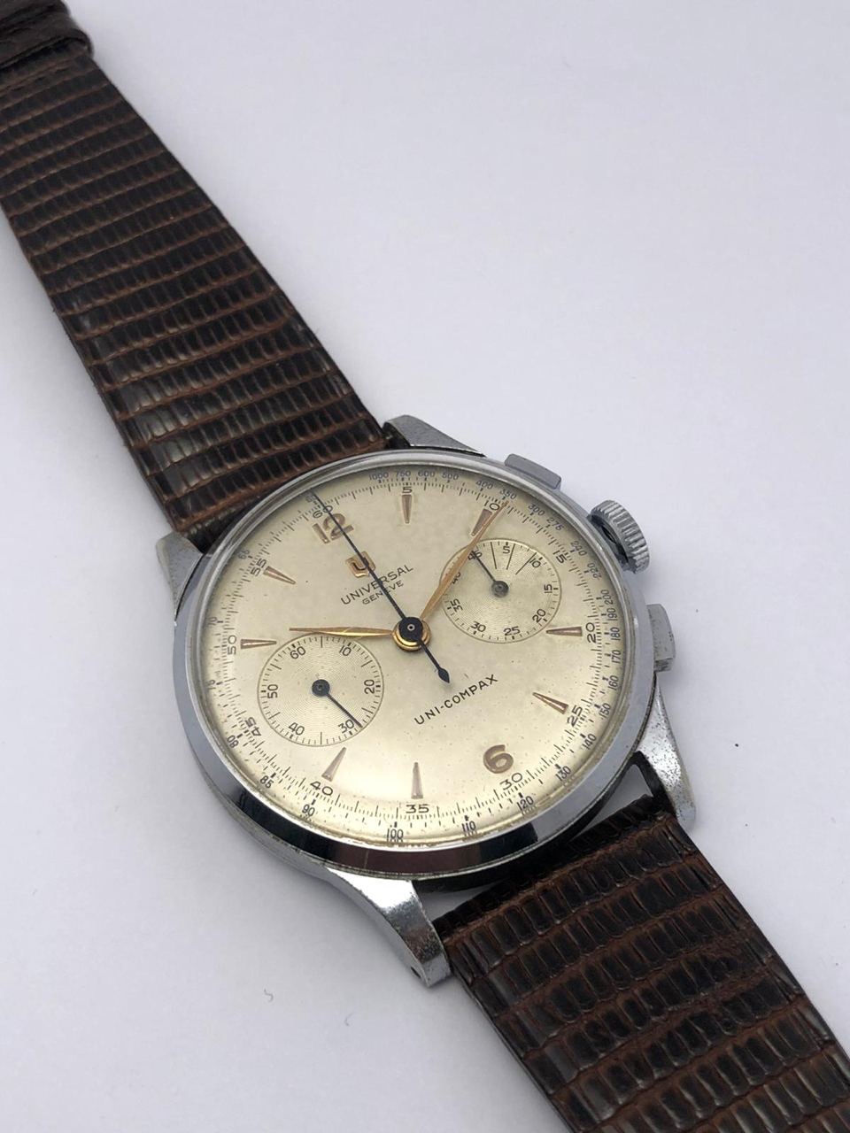 The watch is an attractive example of Uni-Compax ref. 32416 with a huge 37mm case and a beautiful dial with applied logo, gold indexes and leaf hands.