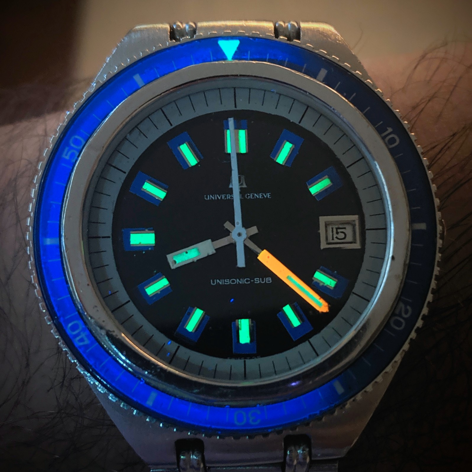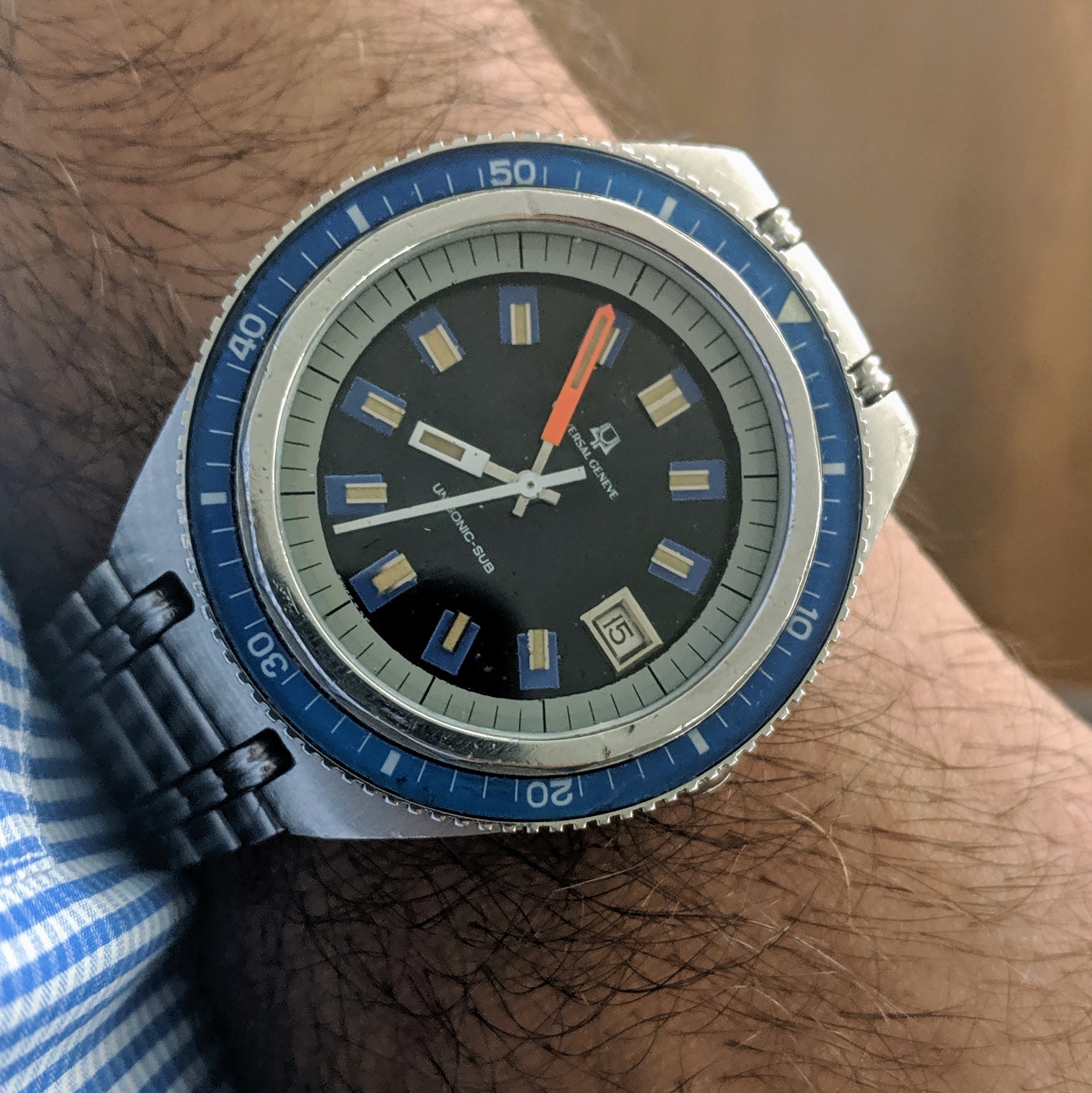 ·I am selling my Universal Geneve Unisonic Sub Diver. Blue dial and bezel with orange hands.
