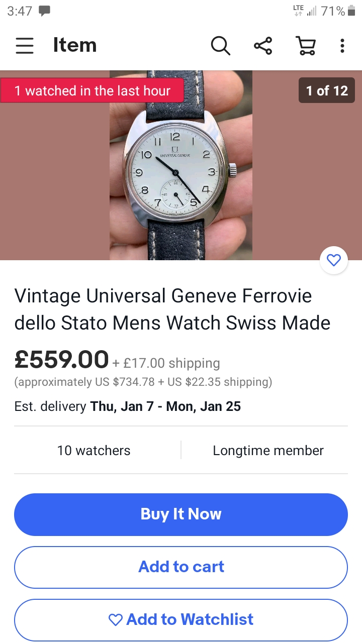 As far as I can tell inquiries are allowed on this thread (unlike the vintage Omega thread). I would be curious on what the pros think about this UG RR watch. I am probably not in the market, so feel free to snipe it. I would to learn more about these. Is this an authentic example? It looks to have see a bit of polishing, but otherwise quite nice from my naive perspective. Also, I am curious about thoughts on the price
