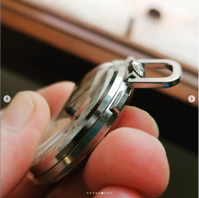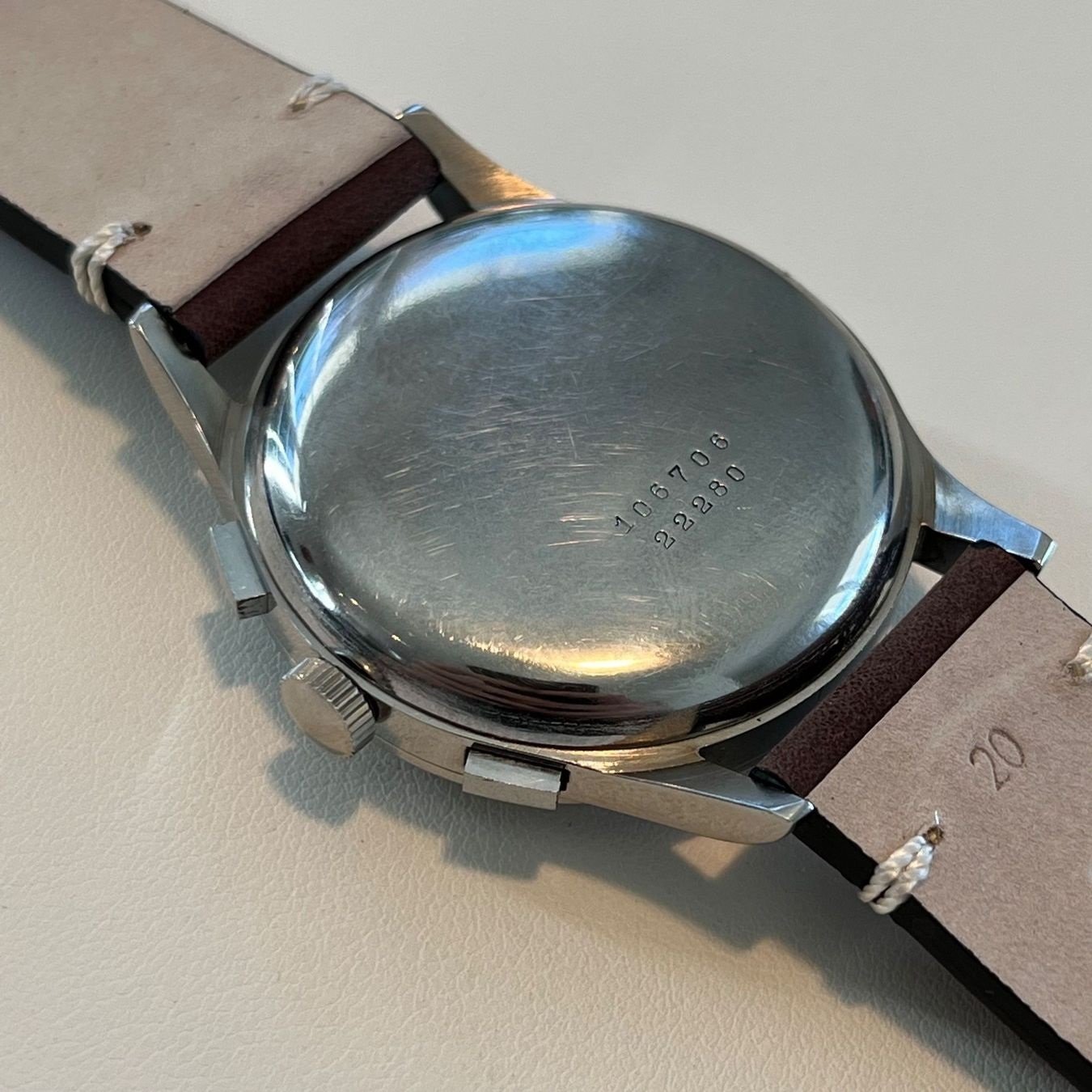 The fonts and central logos and big o’clock numbers look very good, especially at first glance. No roundly subdial lips, no roundly ‘3’s in those subdials and little excess redial lacquer visible overall on the dial. The watch looks right. But then I’m bothered by the apparent lack of any concentric rings in the subdials. One’s eyes then move to the outer tracks and they look all over place, shoddy dashes and dodgy-looking scales lying together with unusual spacing. The dial has a real over-inked look to it in many of the listing photographs but that could just be the light. Finally, one looks back at 6 o’clock and you see no ‘Swiss’ and that as a general rule is correct for Compur of this era, and so many redials have a bad ‘Swiss’ or ‘Swiss Made’ bodged in here instead.
