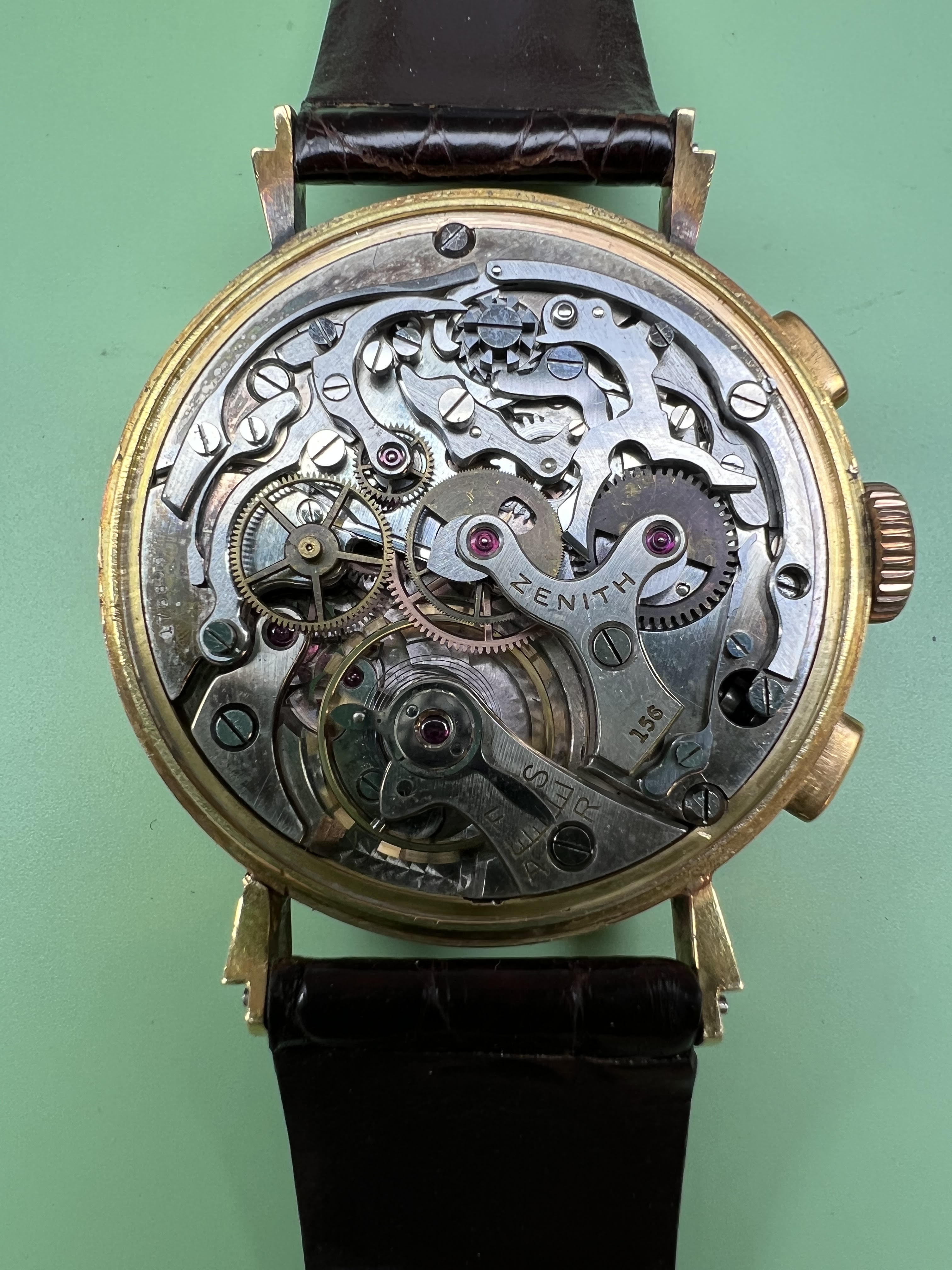 'While the case does not feature typical Zenith stampings, we still believe this case to be the original to the watch. The fitment of the movement to the case looks deliberate and factory to our knowledge, and as companies often shipped movements without cases to different markets to avoid gold import tariffs, the cases made then were not as heavily documented in regards to record keeping, and may explain the anonymous nature of the case of this particular watch.'