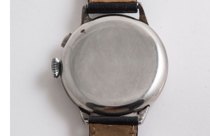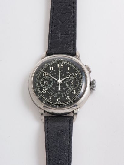 Compur single push-button chronograph, the round steel case (one horn handle attached) with clipped back (signed and numbered 547912). Black dial (accident at 9 o'clock) with white painted indications including Arabic numerals, 19km calibrated telemetric scale, spiral tachymetric scale in the center, seconds counter at 9 o'clock and minutes totalizer at 3 o'clock. Leather strap with pin buckle. Mechanical movement with manual winding with two column wheels (does not work, to be revised). Diameter: 39 mm Condition: quite good