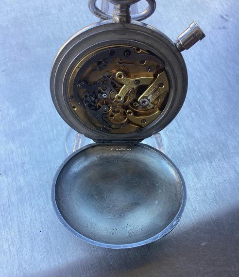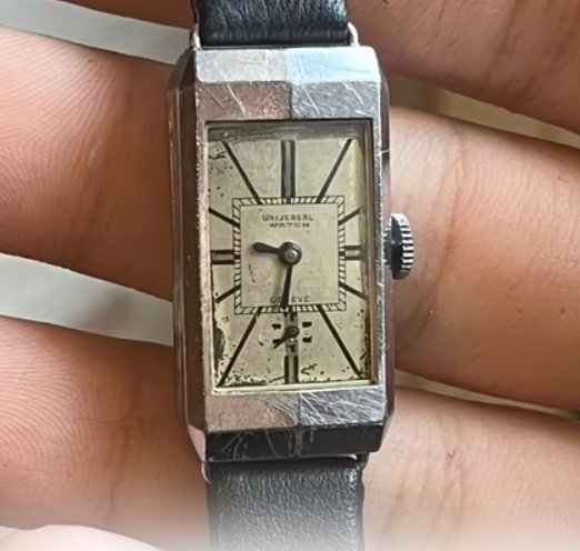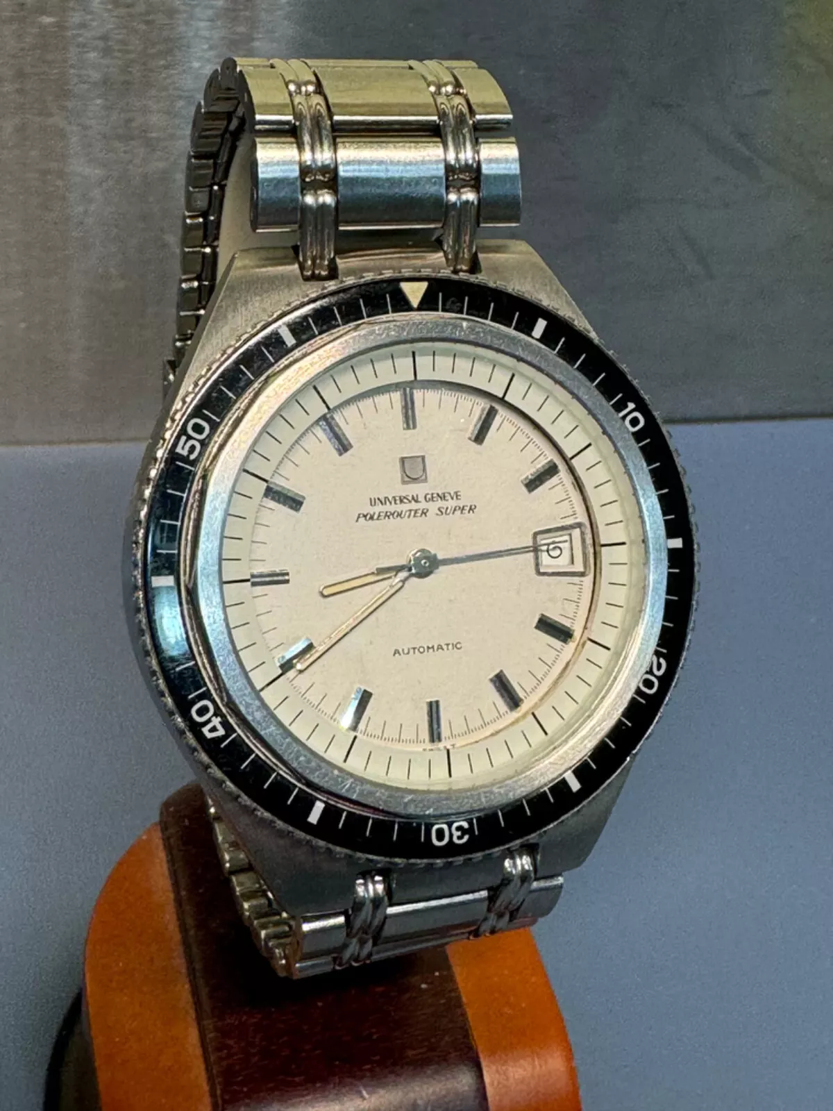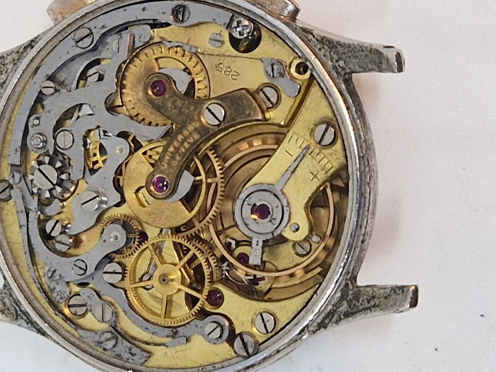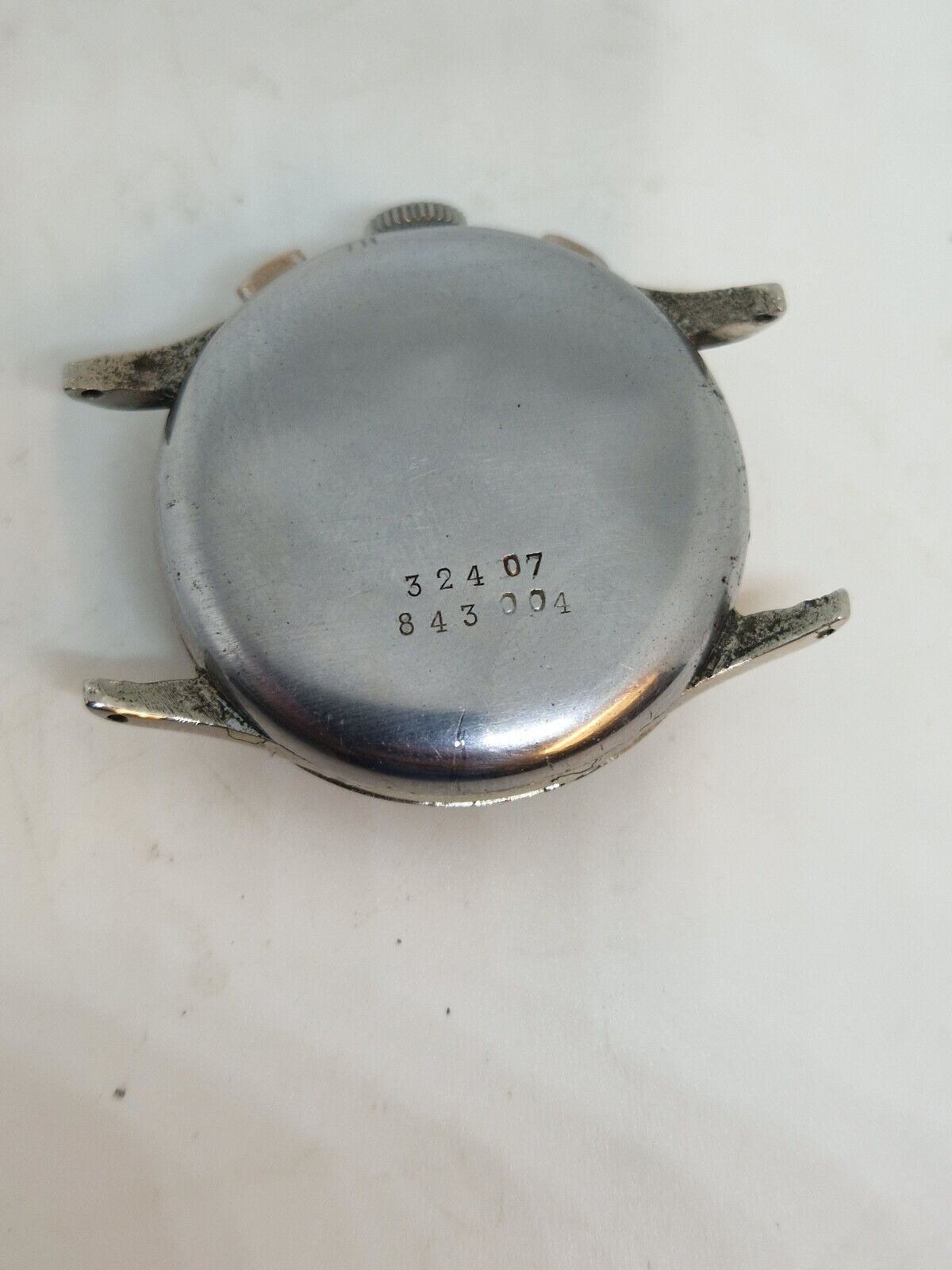 The crown and probably the crystal are replacements, but the crystal has cracked anyway. Bad relume job on the hands and missing lume on the misaligned chapter ring. Case seems ok and not too terribly overpolished.