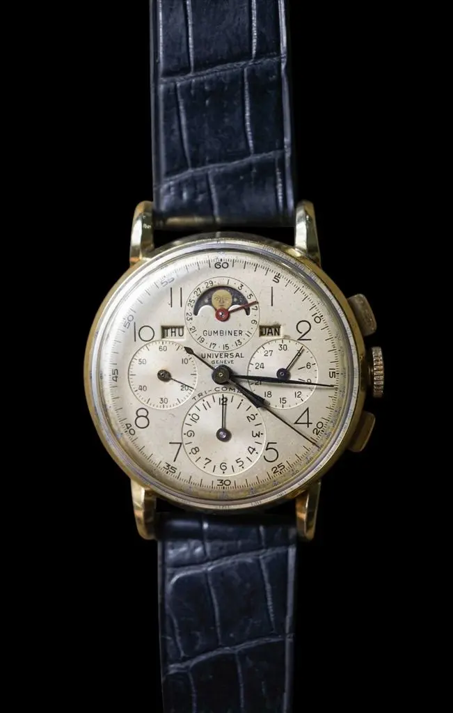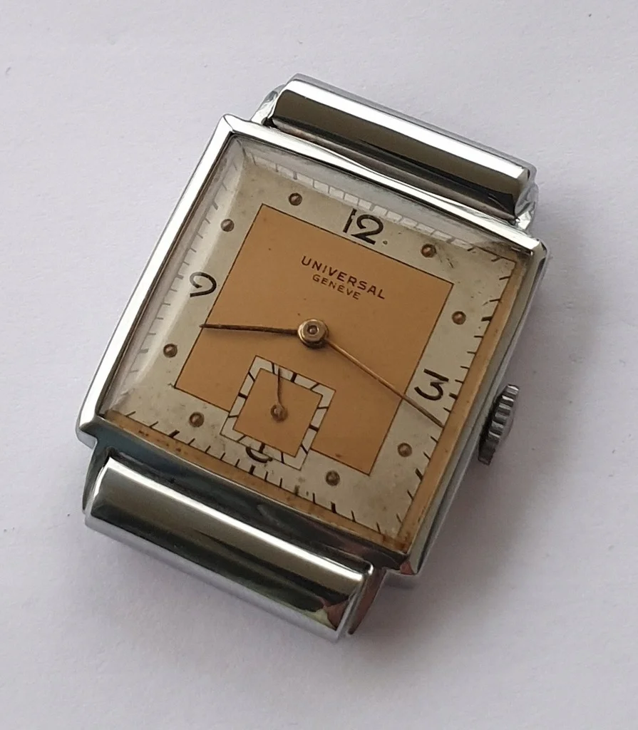 The thing that looks most off to me on the previous watch in discussion is the Universal Geneve text, without serifs and pointy. I have not seen this before on an original dial. But that catalog pic above looks kind of pointy and non serify. (I would have to see much better pics of your time only example, I can't see hardly anything).