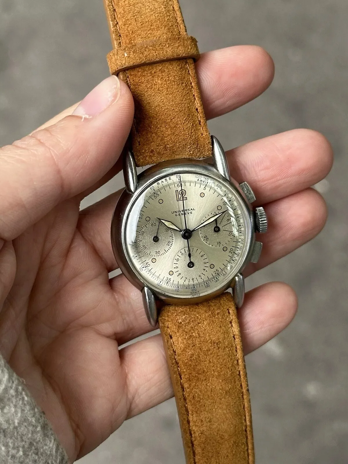 That looks very similar to all the ones I saw in my research but black. The big deco numbers and much more prominent “Universal Geneve” along with the red seconds hand of that other piece didn’t seem to match anything else I could find.