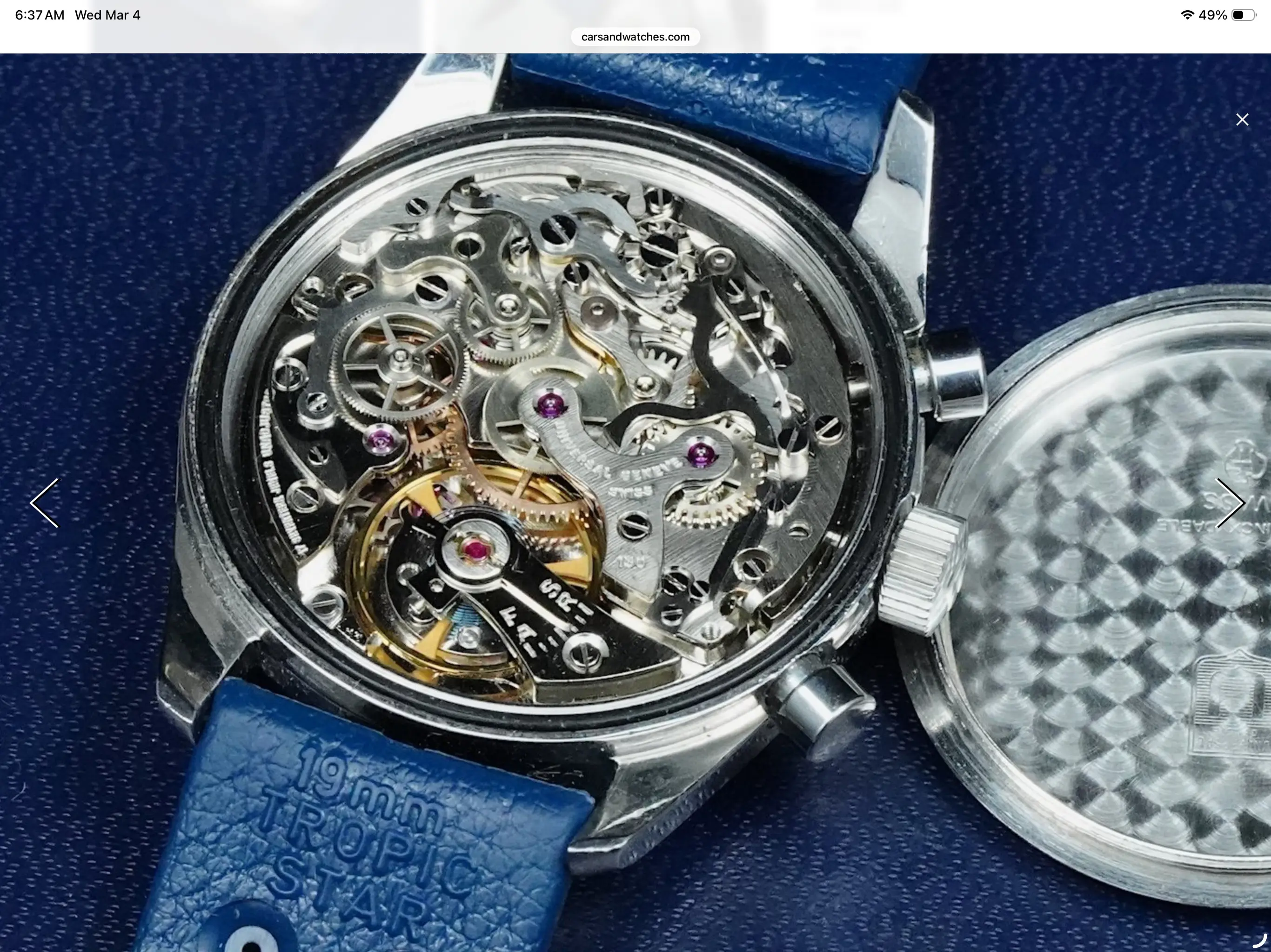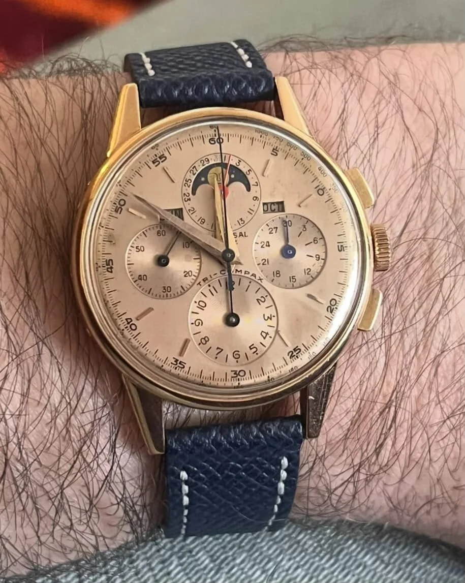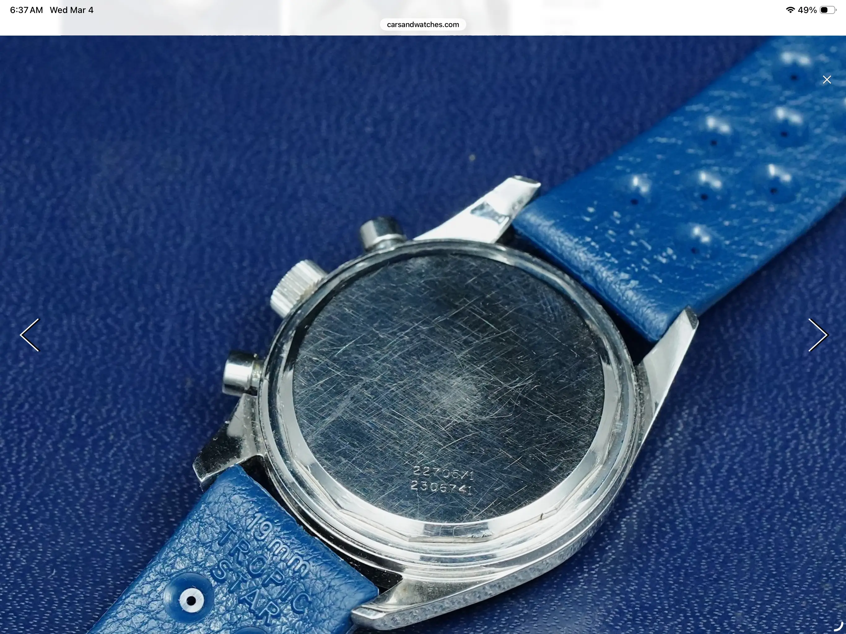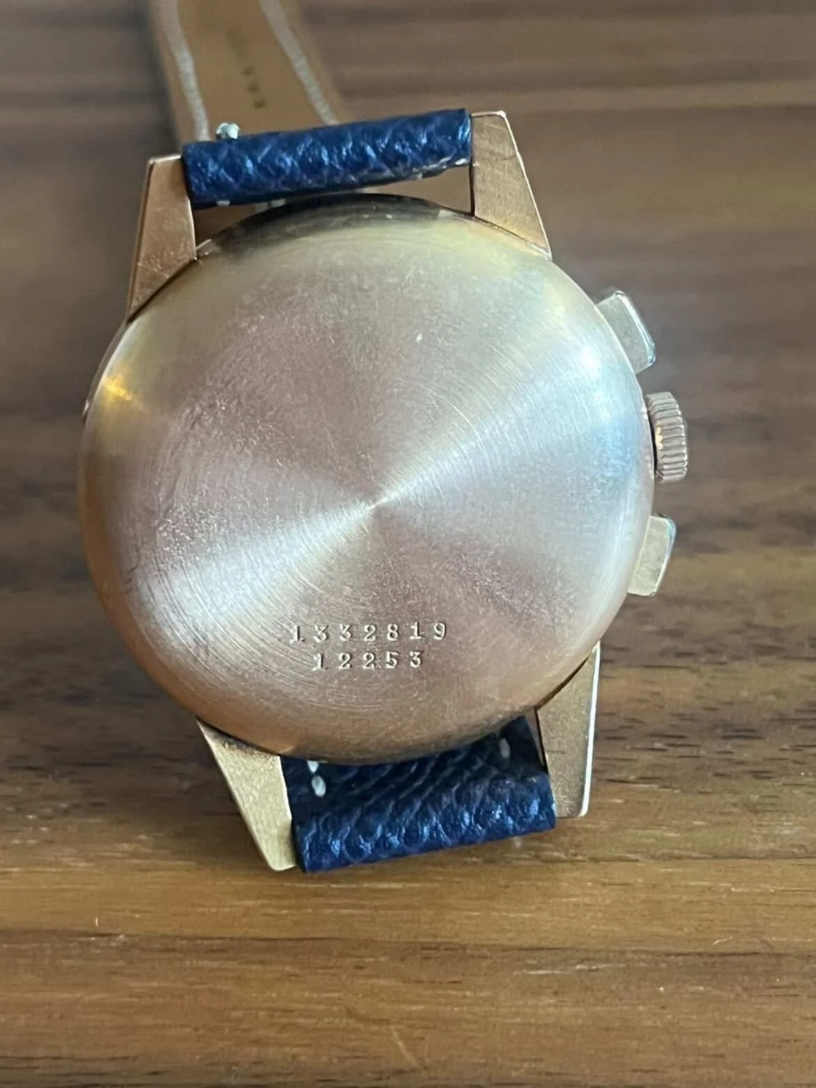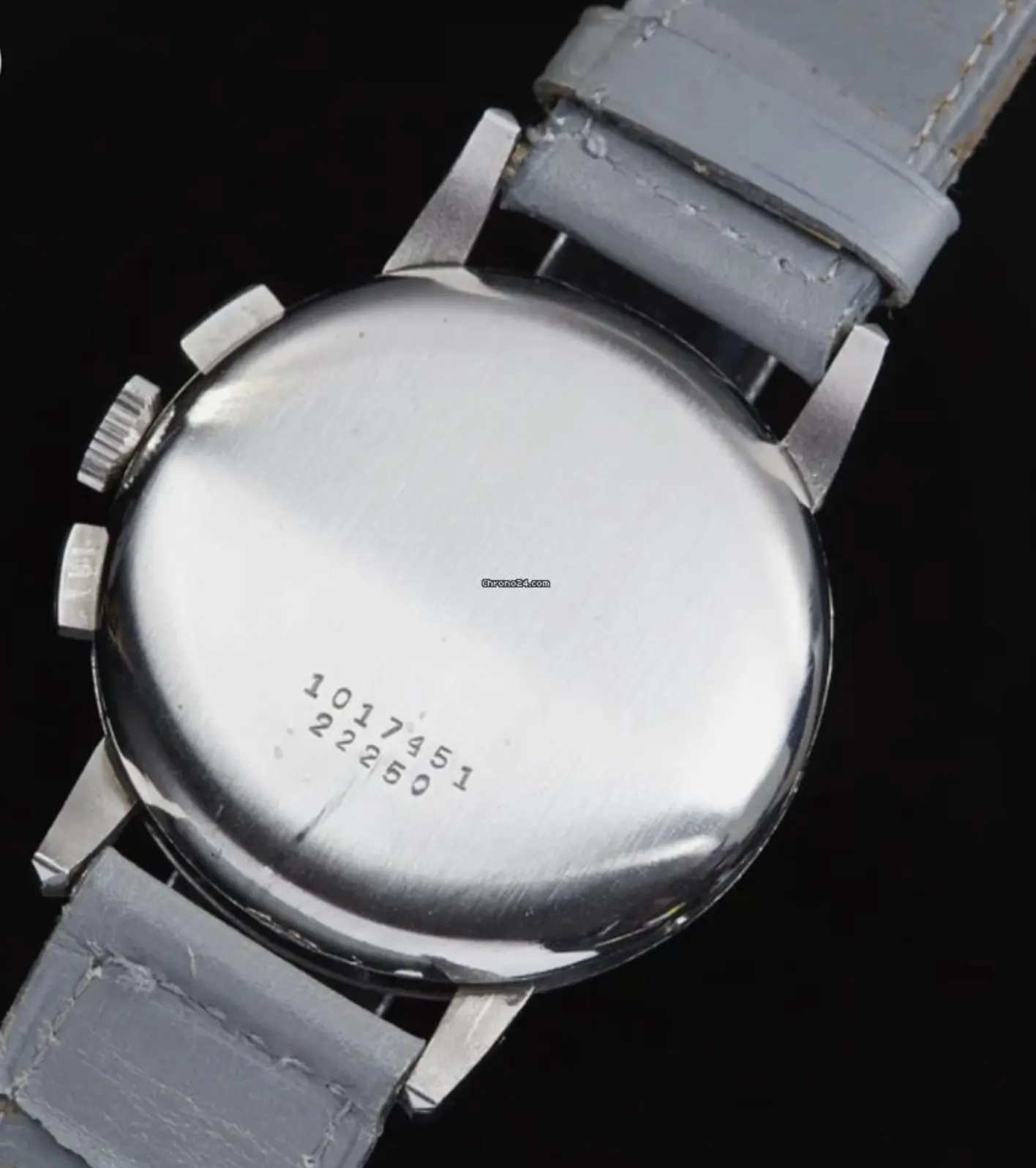 There's a nice looking Tri Compax on ebay. I question whether the crown and hands are original, comparing to pictures in Sala's book, but the rest looks good to my novice eye. Shouldn't all the subdial and chrono seconds hands be blued? The lighting in the pictures makes it hard to tell if that's the case here. Nice clear stamping on the caseback -- it seems most examples have been worn or polished to a high sheen.