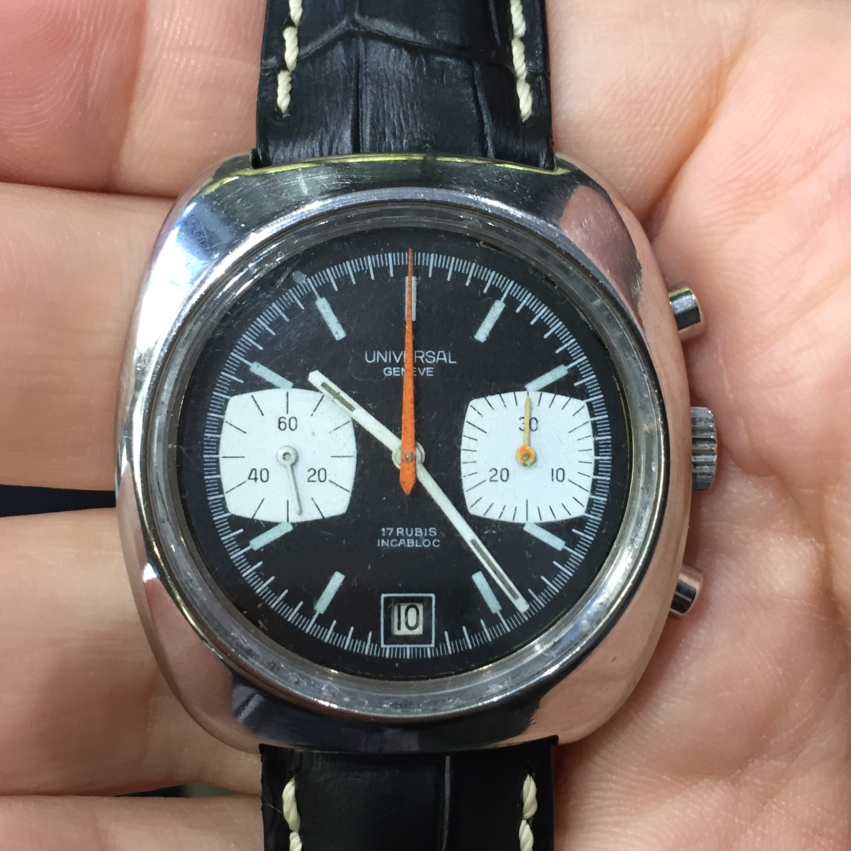The movement inside is a Valjoux 7734 and the chrono functions are inconsistent: when I pushed the start, the minute's hand in the subdial went to 5 minutes, I reset and restarted, it went to 2 minutes etc.. I saw that in order to have not problems with that you have to push the button very quickly, anyway, I think it could be solved with a service.